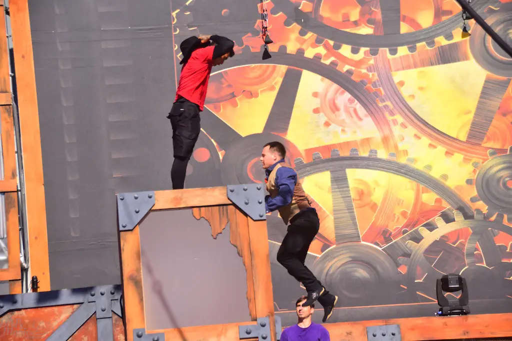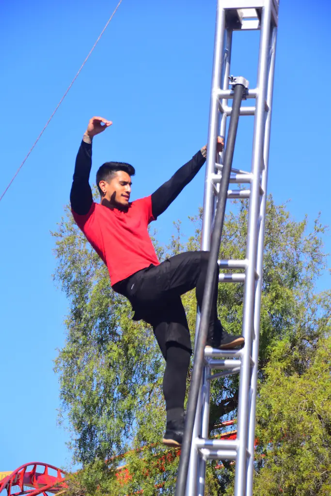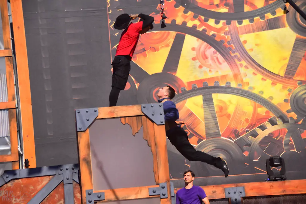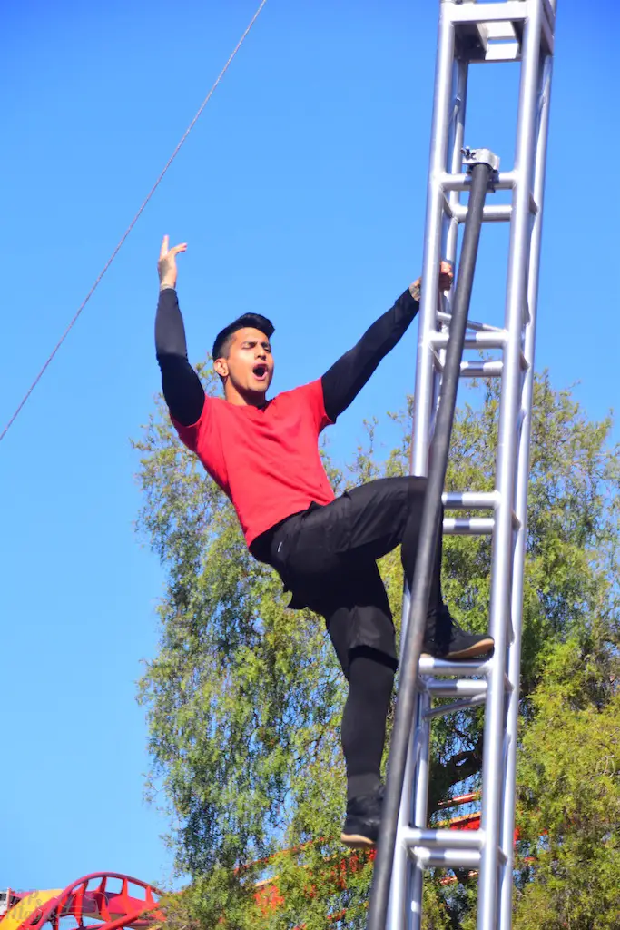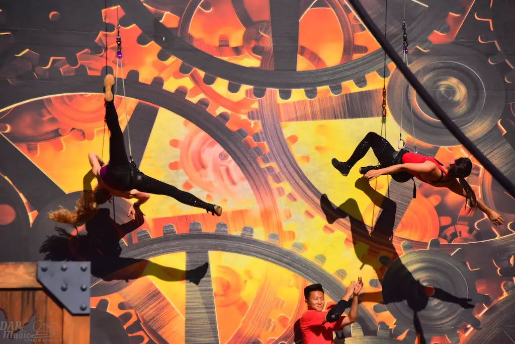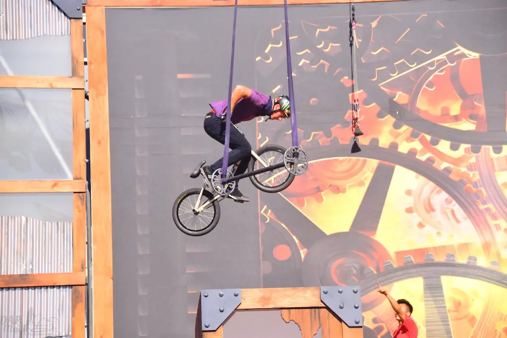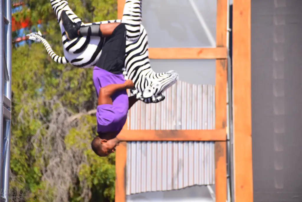 Over in Ghost Town, even more thrills abounded in Vertical Impact. Acrobats and BMX stunt riders entertained in one of the most unique shows I’ve ever seen. Trampolines lined some of the main stage and enabled performers to reach great heights and amazing flips. BMX riders had ramps to perform high in the air jumps and flips. Hoops, trapezes, and ropes enabled the acrobats to show off high in the sky skills that took some breath away. The performance was full of excitement and amazing moves that aren’t done just anywhere else.