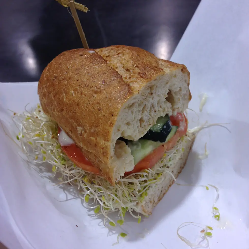 Once my quick spending splurge was over, it was time for lunch. What amazed me was the short line for food and how empty the expo was in general. So not jam packed like Saturday. Also, I was thrilled to find an enjoyable vegetarian item. Everywhere I looked, the veggie burgers were sold out and the salads contained some type of meat. So, I was happy to order a veggie stack. The stack included sprouts, tomatoes, cucumbers and humus, all on wheat bread. Yum!