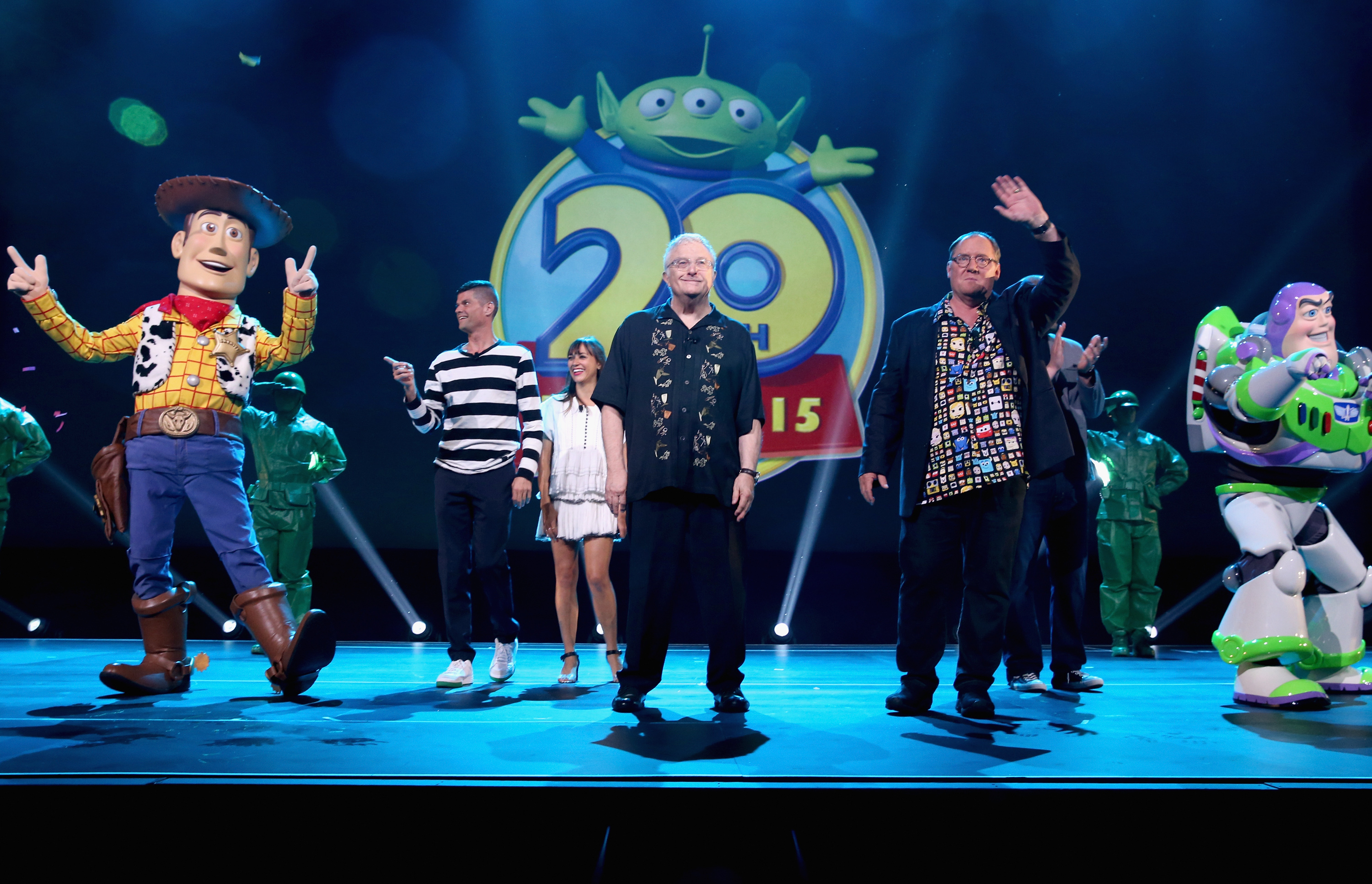 ANAHEIM, CA – AUGUST 14: Composer Randy Newman of TOY STORY 1, 2 and 3 and director John Lasseter of TOY STORY 4 (C) took part today in “Pixar and Walt Disney Animation Studios: The Upcoming Films” presentation at Disney’s D23 EXPO 2015 in Anaheim, Calif. (Photo by Jesse Grant/Getty Images for Disney) *** Local Caption *** Randy Newman; John Lasseter; Will McCormack; Rashida Jones; Galyn Susman; Josh Cooley