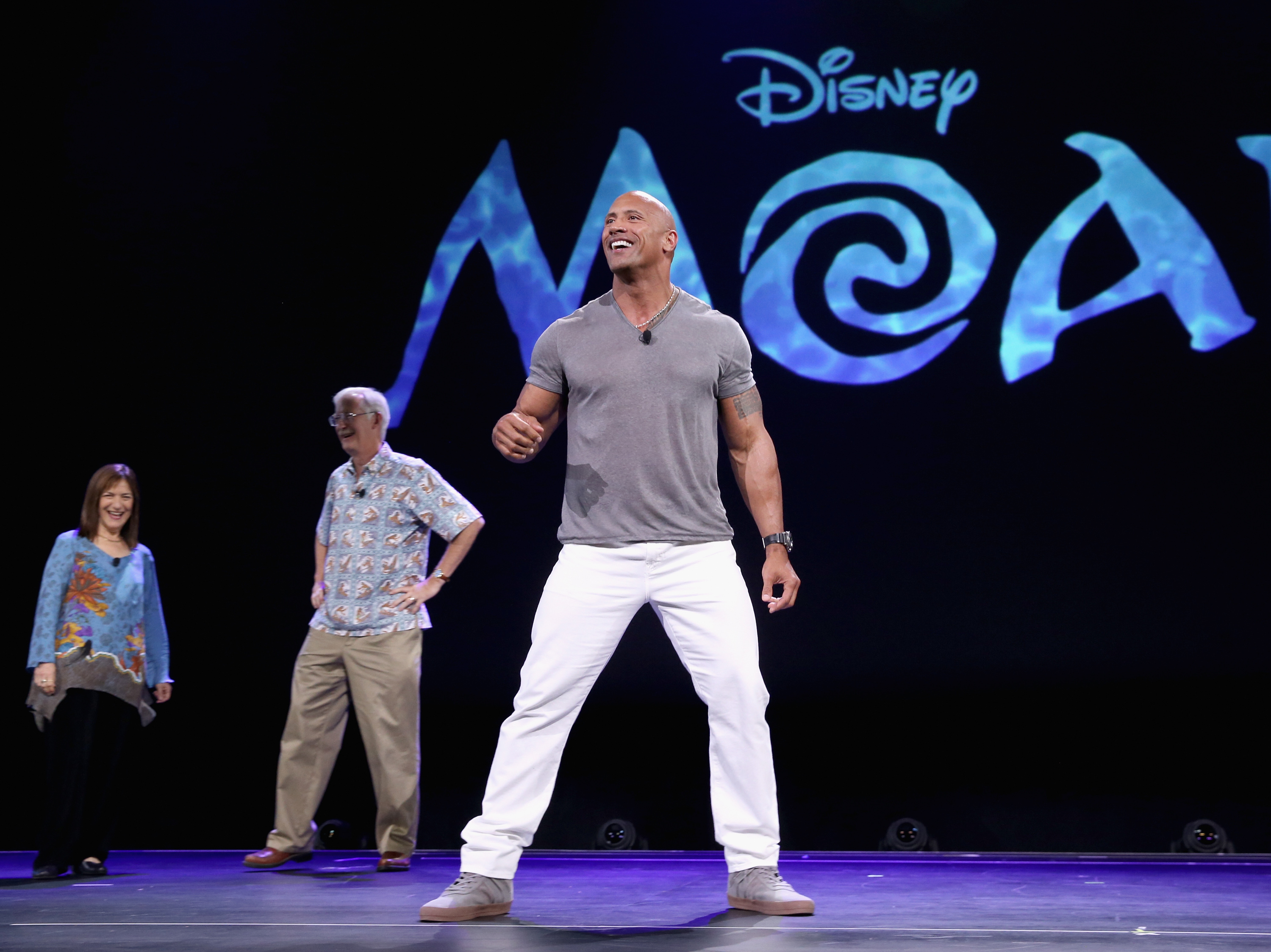 ANAHEIM, CA – AUGUST 14: (L-R) Producer Osnat Shurer, director John Musker and actor Dwayne Johnson of MOANA took part today in “Pixar and Walt Disney Animation Studios: The Upcoming Films” presentation at Disney’s D23 EXPO 2015 in Anaheim, Calif. (Photo by Jesse Grant/Getty Images for Disney) *** Local Caption *** Osnat Shurer; Dwayne Johnson; John Musker