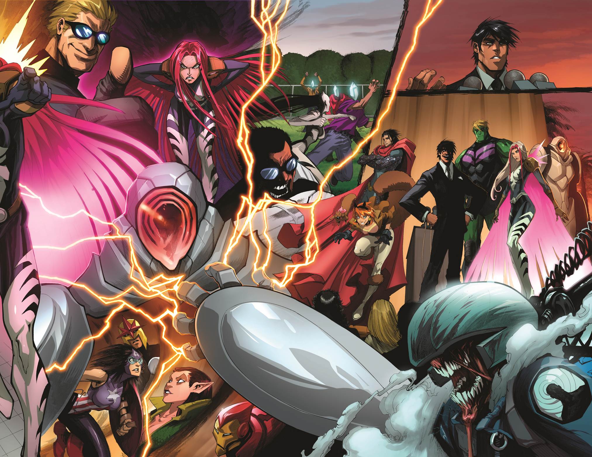 New York, NY—September 18th, 2015 — This October – the old order changeth, and everything is new! Today, Marvel is pleased to present your look inside NEW AVENGERS #1 – the new ongoing series from Al Ewing and Gerardo Sandoval! Bobby DaCosta a.k.a. Sunspot, now the leader of formerly evil super-science organization A.I.M. is about to change the world. And that starts with the new Avengers Idea Mechanics! A scientific global rescue squad of tomorrow’s heroes, operating outside the jurisdiction of any government. America doesn’t want them! S.H.I.E.L.D. doesn’t know what to do with them! But Sunspot, Squirrel Girl, Hawkeye, Wiccan, Hulkling, Songbird, Pod, Power Man & White Tiger might just be Earth’s last hope. New team! New mission! New Avengers! Welcome to Avengers Idea Mechanics.