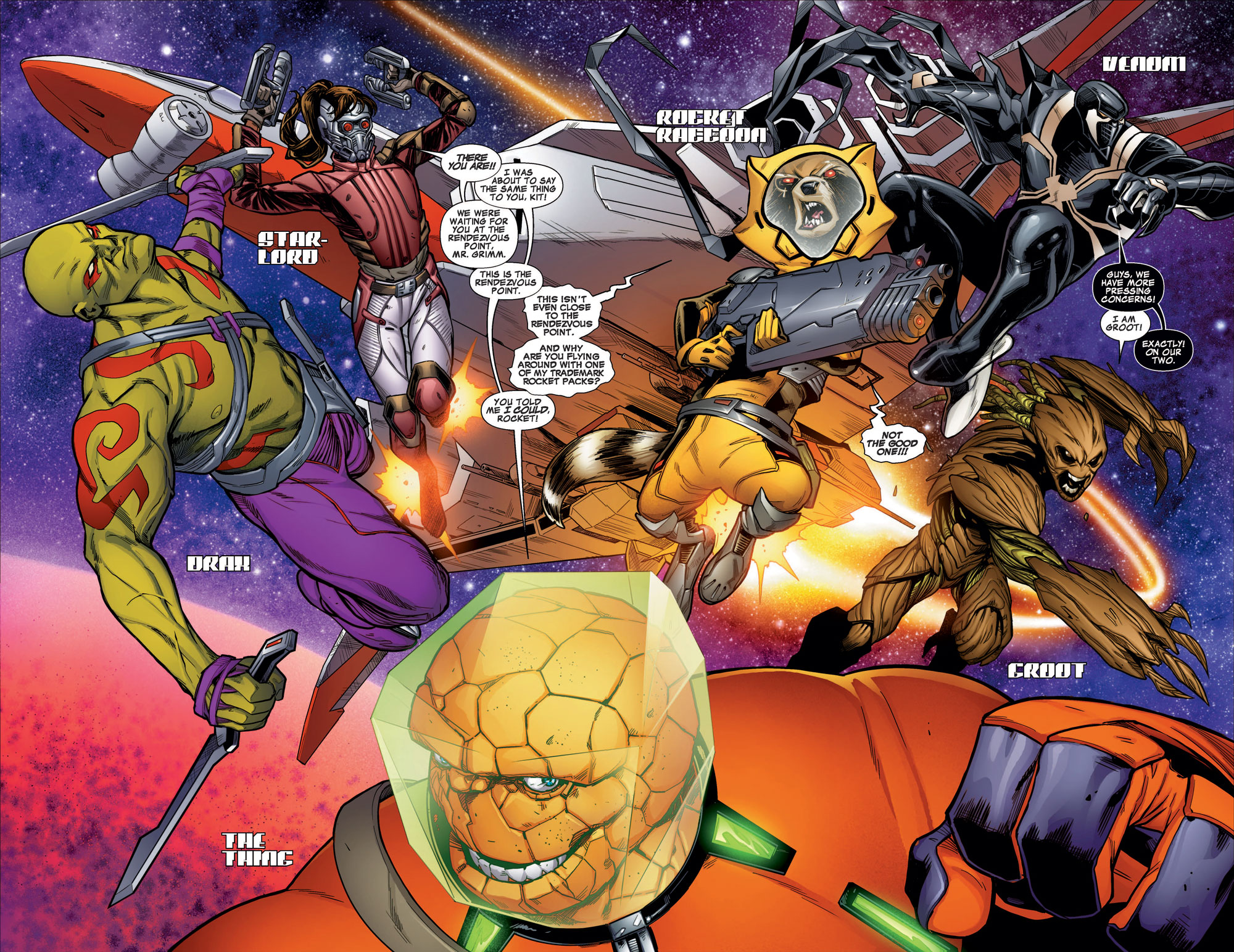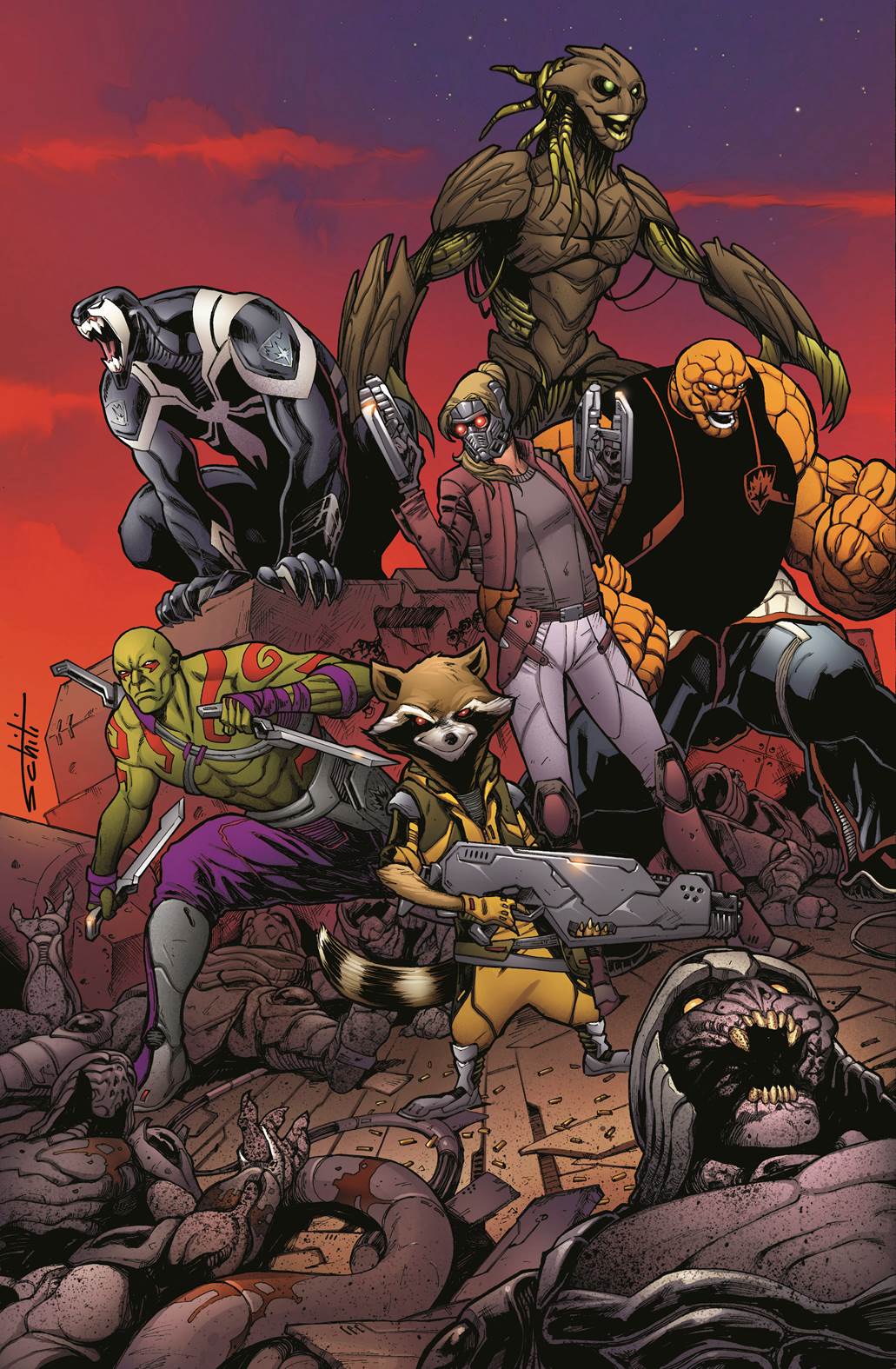 New York, NY—September 15th, 2015 —This October, blast off into the stratosphere as the recharged group of galactic guardians explode into the All-New, All-Different Marvel Universe in GUARDIANS OF THE GALAXY #1! Coming to you from legendary comic writer Brian Michael Bendis (Invincible Iron Man) and rising star artist Valerio Schiti (New Avengers) comes a team unlike any you’ve seen before! Eight months have passed since the end of Secret Wars, and Peter Quill didn’t waste any time abandoning the Guardians and taking the throne as ruler of Spartax. And Rocket didn’t waste any time taking his place as leader of the Guardians of the Galaxy either! Leading a team comprised of Kitty Pryde (now known as Star-Lady), Drax, Groot, Venom and newcomer Ben Grimm, the everlovin’ blue-eyed Thing – Rocket and the Guardians are out to show that even though Secret Wars may be over, the galaxy still needs guarding. Strap in and hold on this October for their bombastic new debut in GUARDIANS OF THE GALAXY #1!