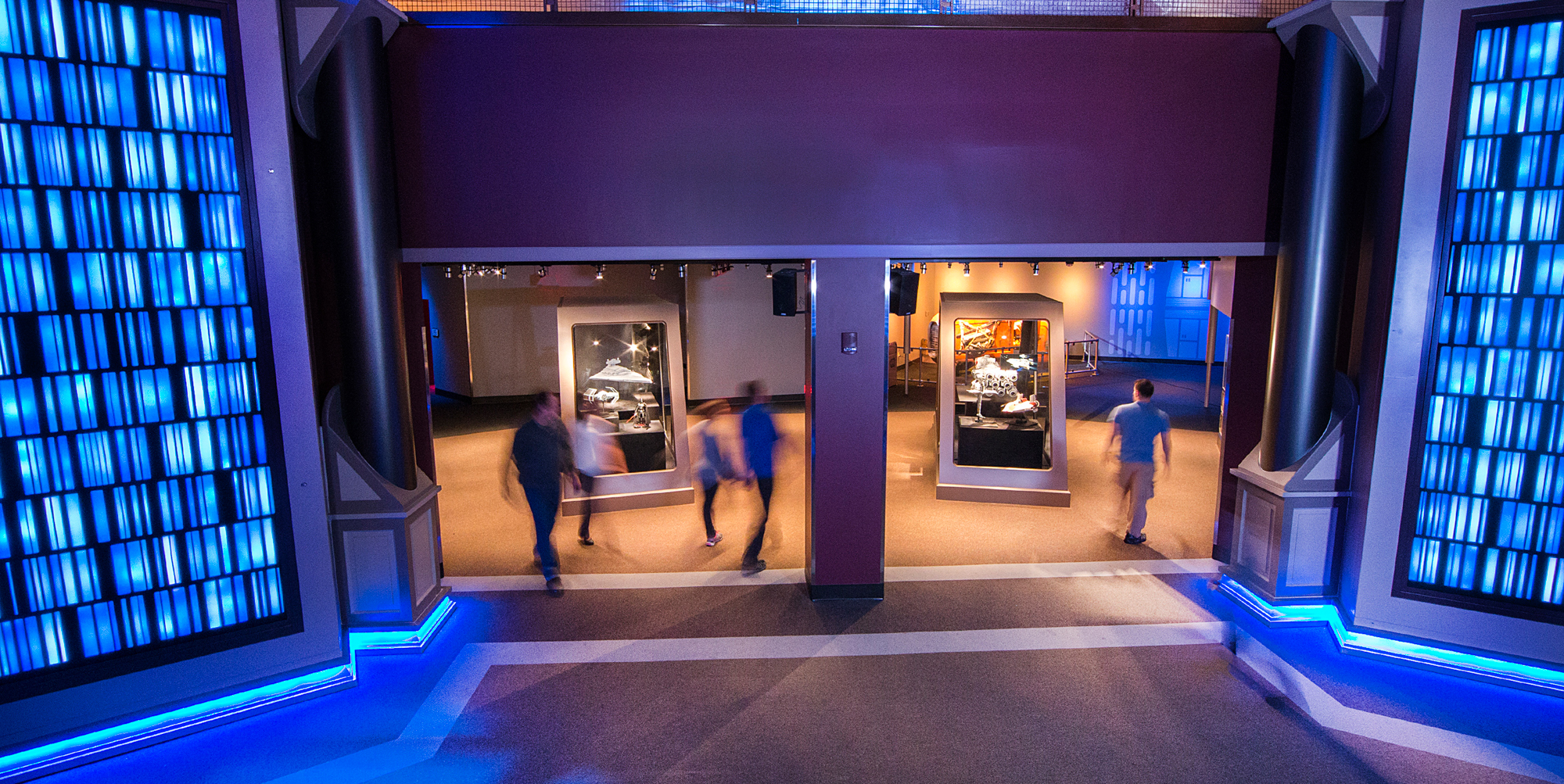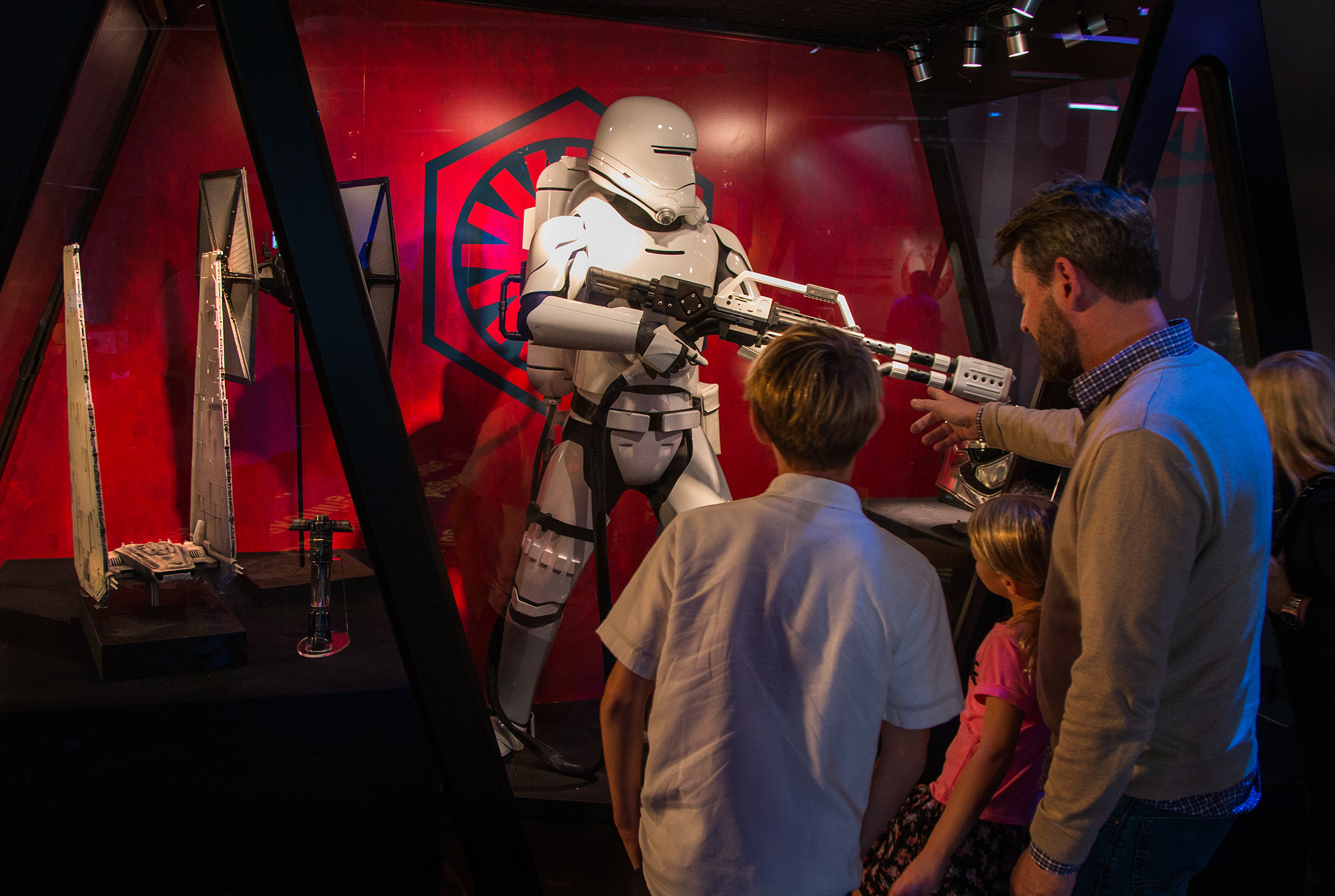 The Dark Side Gallery features pieces of Stormtrooper armor and Sith lightsabers.