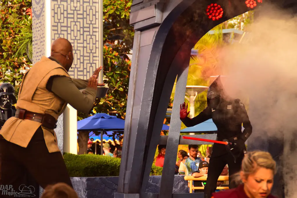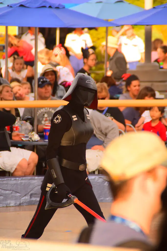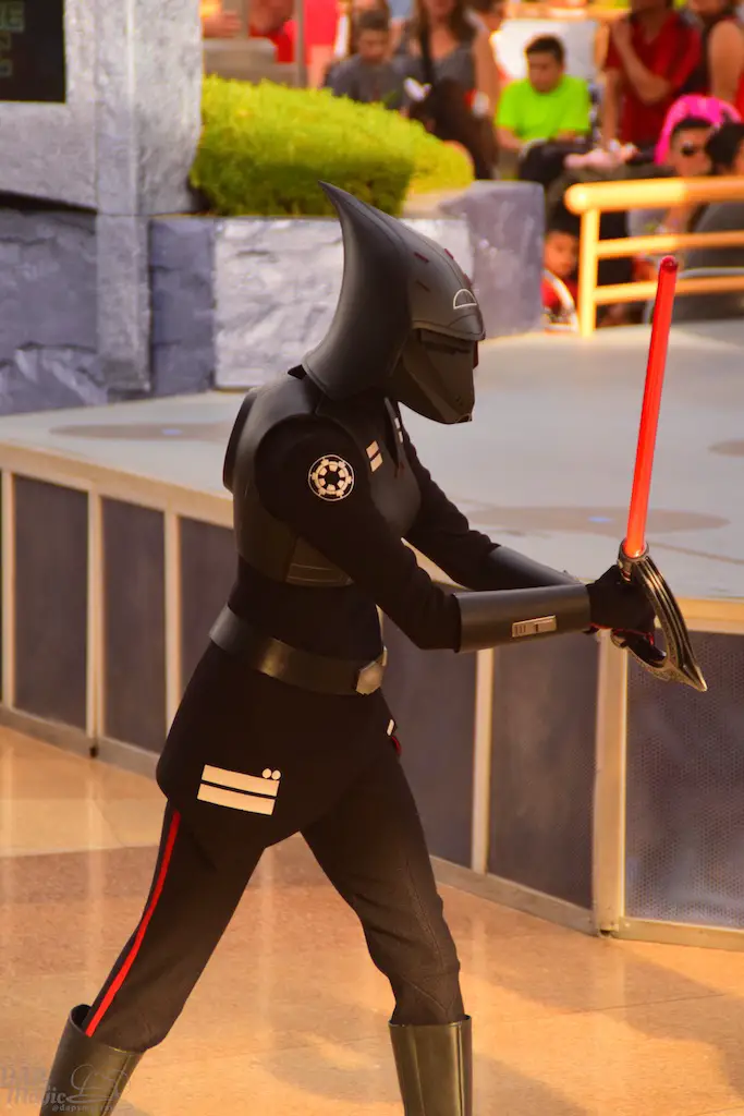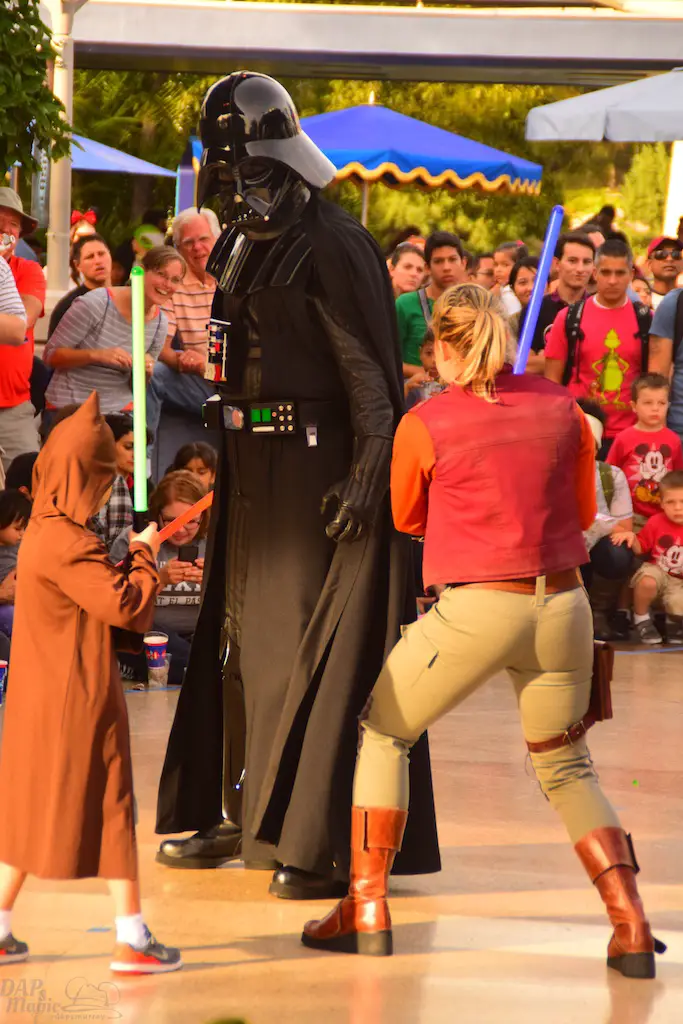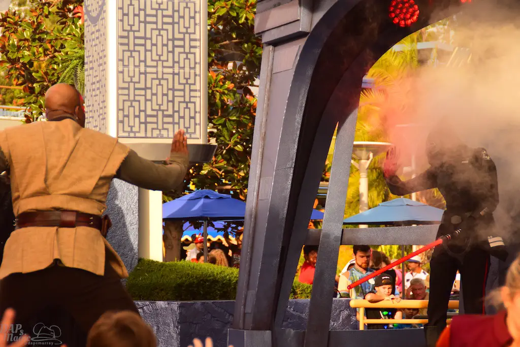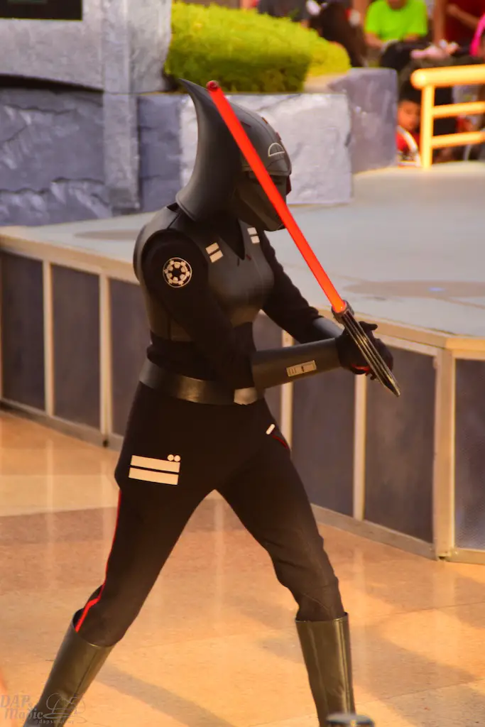Yesterday, Jedi Training Academy premiered its second incarnation: Jedi Training Trials of the Temple. Taking place between Episode III and IV, the stage show still has younglings take up lightsabers against the Sith. The story is now about two Jedi, one Master and one Apprentice, who are trying to find new Jedi in a time where most are wiped out. All together they raise a Jedi temple where all will be tested. Enter Darth Vader and Seventh Sister, the inquisitor from Star Wars Rebels. But, these two are not the real versions of the Sith. They are manifestations of fears of the group. The younglings take turns fighting them, and ultimately push them back into the temple. But, the Apprentice’s fears become real too. Darth Maul appears and fights the Jedi one on one. The group must help the Jedi before the Dark Side of the force takes over. It’s successful and the group has passed the trial of the temple to become honorary Jedi.