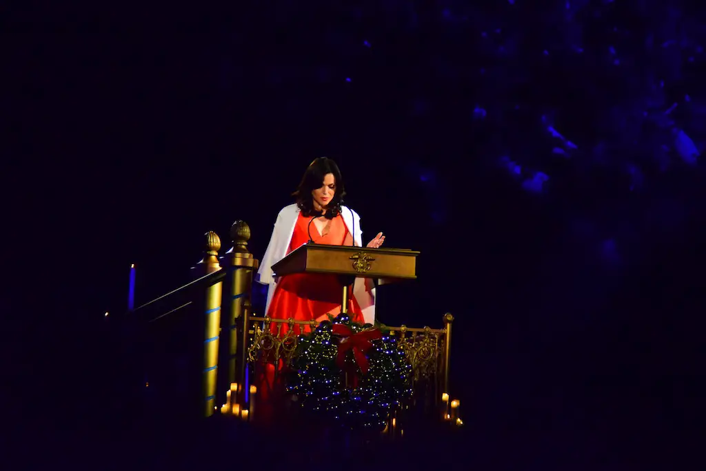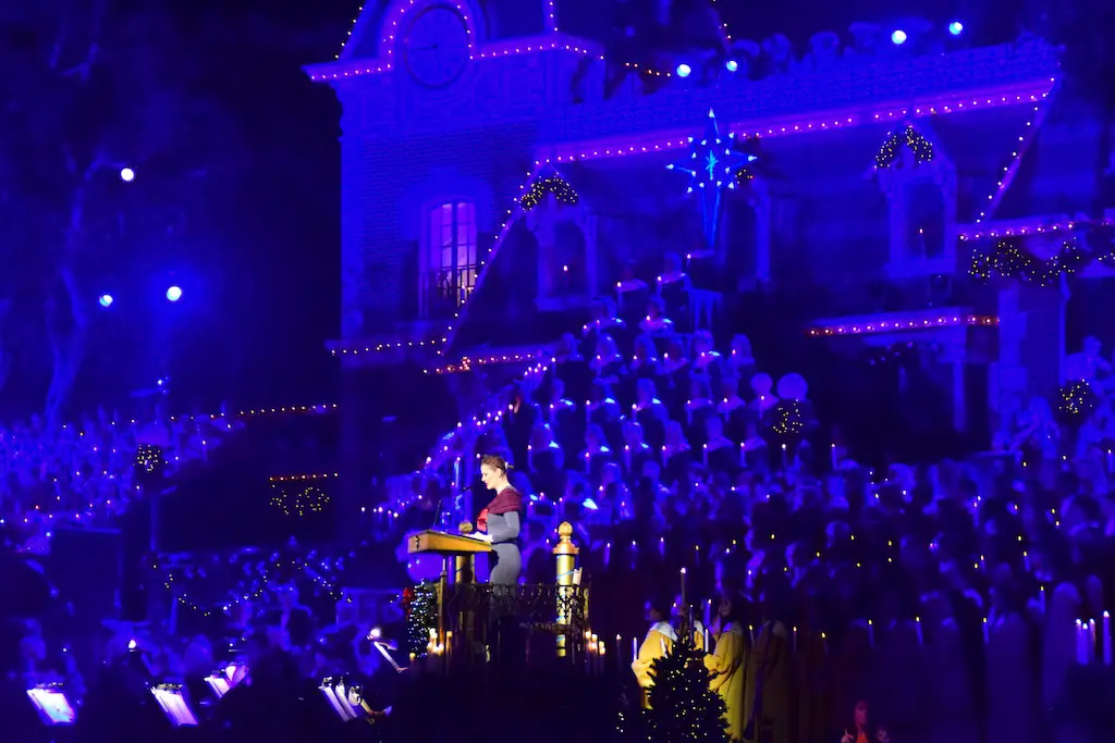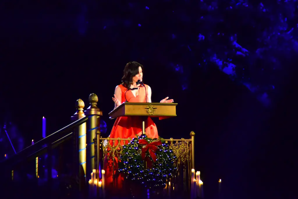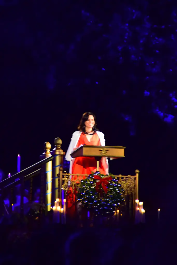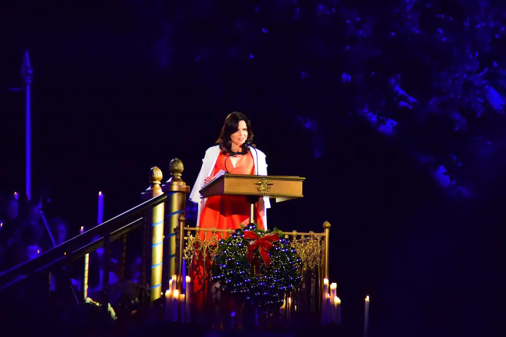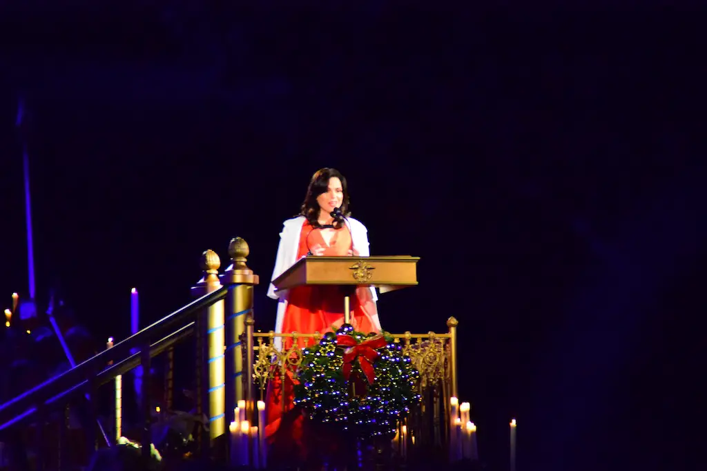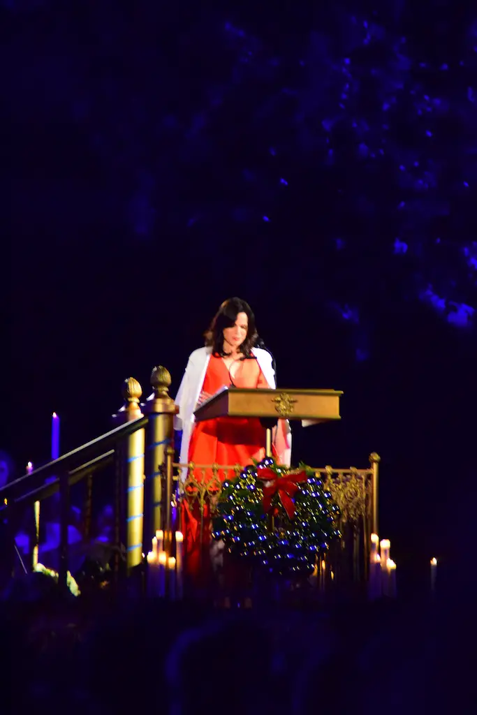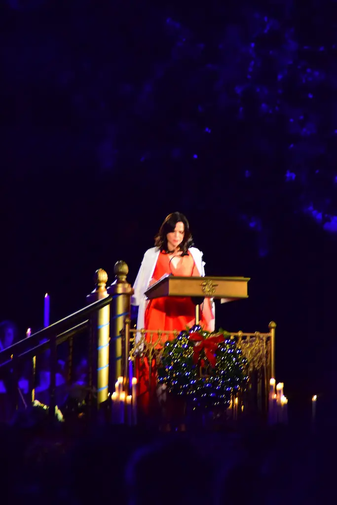 Candlelight Processional at Disneyland has always marked the holiday season. This weekend event has had many celebrity narrators that have read the Christmas story with great reverence. This year was another joyous and momentous occasion. Geena Davis narrated the first night, Saturday, December 5th. Her reaction after Silent Night summed up her delight in being able to take part of this great event. Lana Parrilla of Once Upon A Time fame narrated the second night, Sunday, December 6th (funny note: Once Upon A Time was airing the same time she was narrating). Though she plays an Evil Queen on the show, her presence was just the opposite, filling Main Street with her wonderful voice to retell the story. Both did a remarkable job, and the audience had a great time with the show. Things were just a little different with some musical numbers, like a little difference in soloists. Not that it detracted from a magical time in front of the train station. It is always a refreshing and joyful time at Disneyland, filled with music and a story of peace and love.