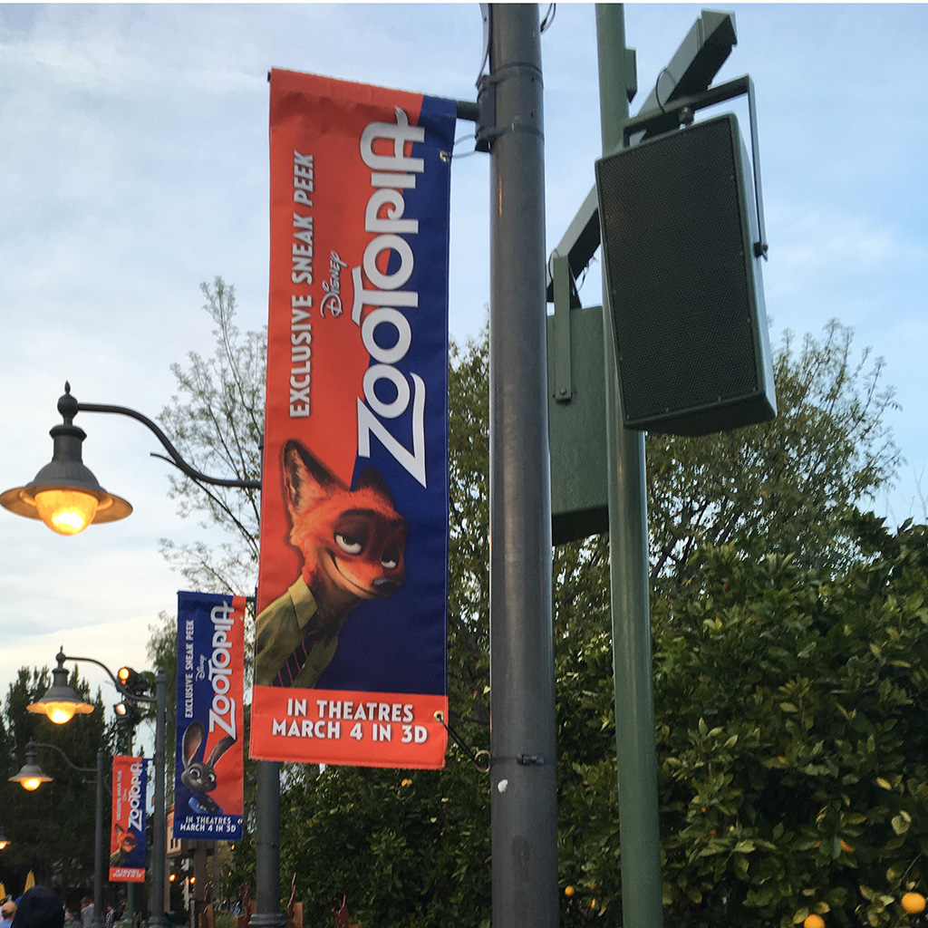 The theater was decked out in the usual preview way. Banners are adorning the light poles. A sign with sculpted Judy Hopps and Nick Wilde are on the sign beckoning guests to go and preview the scenes from the film.