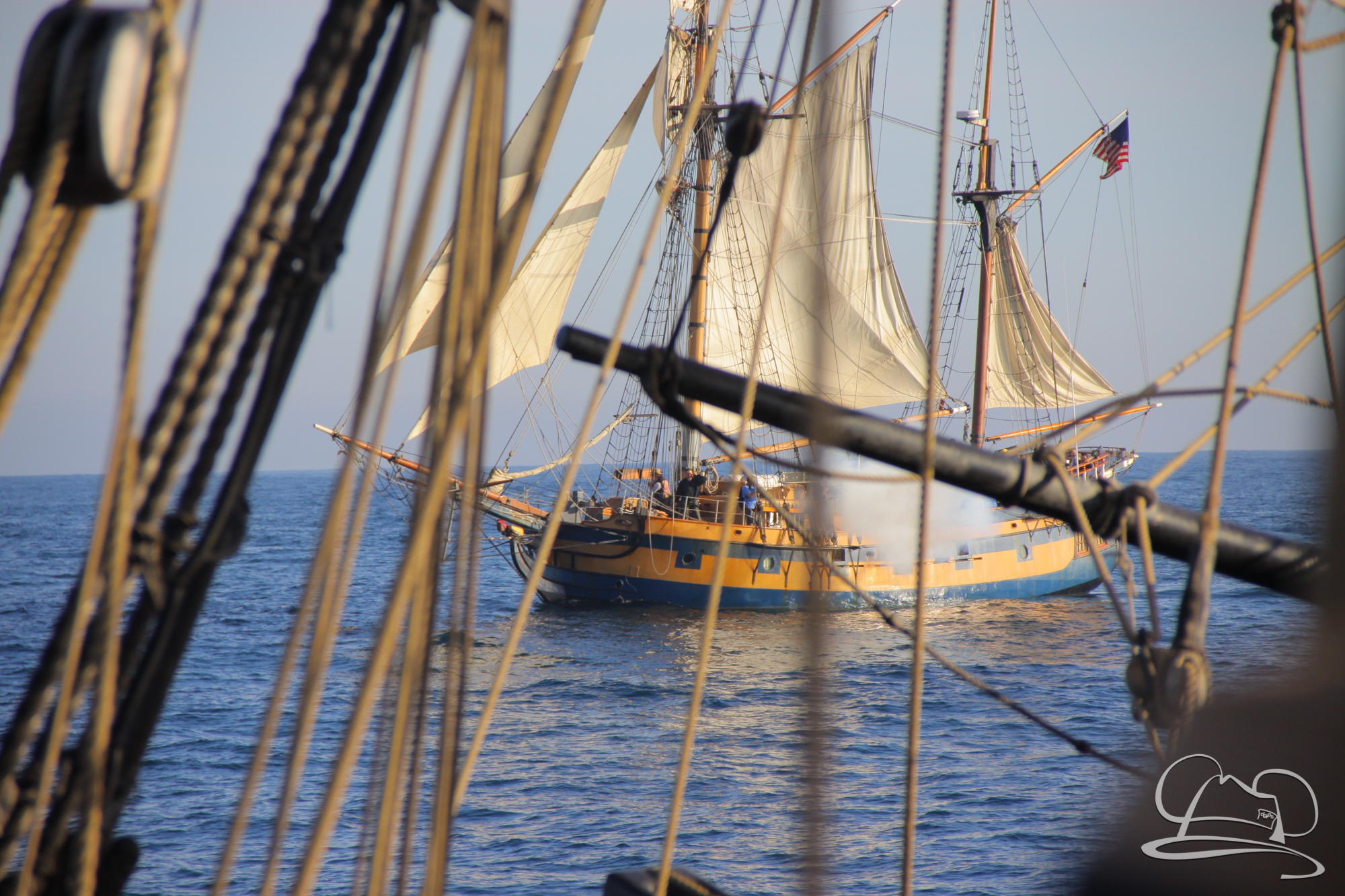 The Lady Washington took the first shot. In fact, the Lady Washington did most of the shooting from what I could tell. Each shot sent a pillar of smoke out towards the Hawaiian Chieftain. As we tacked to and fro, both ships jockeyed for the better shot. The captain shared about the different sea battles through the years and how some could last minutes and others… take forever. It really all depended on the wind. He also shared some tricks for jockeying into a better position against ones adversary. The battle lasted for about an hour and really was a lot of fun.