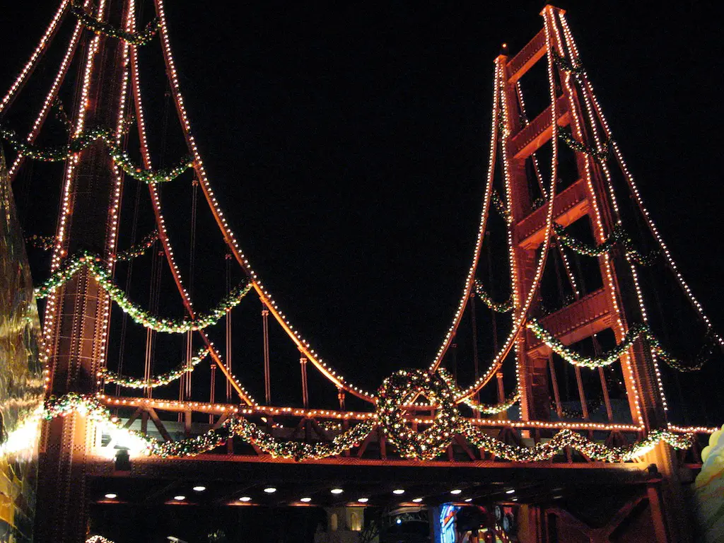 Walls of the buildings had murals of California sights, all brightly painted. Music filled the air with tunes from different decades, all highlighting various California culture and places. Across the middle of the entry boulevard was the iconic Golden Gate Bridge that served as a way for the Monorail to journey across. Once you got into the main area of the plaza and park, a couple of notable icons sat for enjoyment.