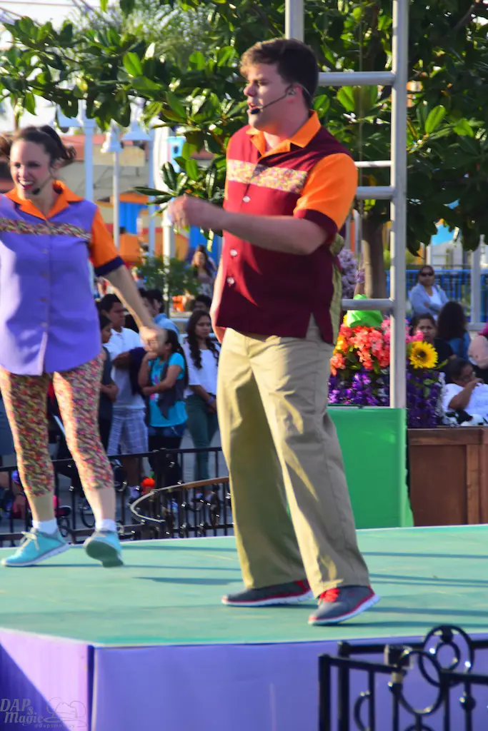 The show had some great songs in use. There was a great blend of it being modern pop songs with definite rock beats, but had some country bluegrass thrown in to add a county fair atmosphere. The decorations also gave that vibe as banners were strewn across the fountain, while small covered wagons sat below the stage. It was a fun show that had a great interactive element for kids.