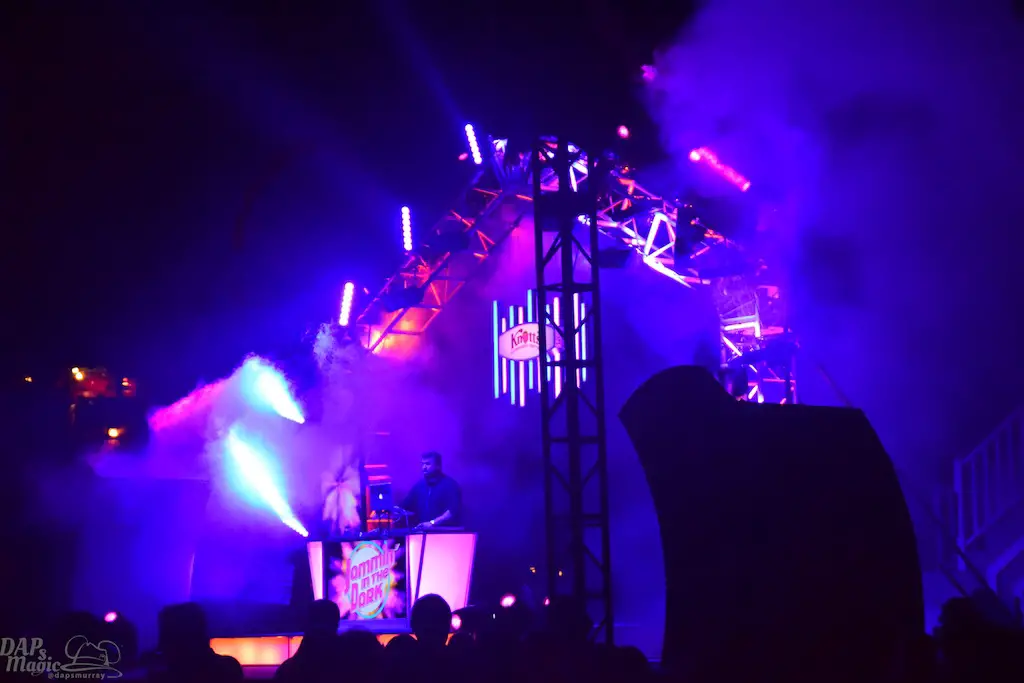 Over in Calico Square was Jammin’ in the Dark, which returns again for the festival. A DJ spins songs while lights shine on the dance floor. Timed “smoke” shoots up from the stage at appropriate moments. This location is a terrific choice for the dance fest. There’s plenty of open space and a true stage for the DJ. Last year it was at Boardwalk Circle, which made use of the circular stage, but didn’t have quite the central dance floor that this location has. The effects gave a club-like environment. It was hard to resist to dance along, and especially that many were having a great time dancing. It’s the kind of thing that tops a night off well at the park.