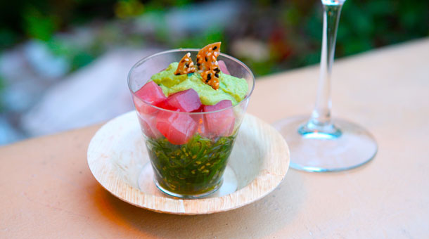 - Chilled Ahi Poke with avocado crème and Wakame salad, topped with sesame tuile