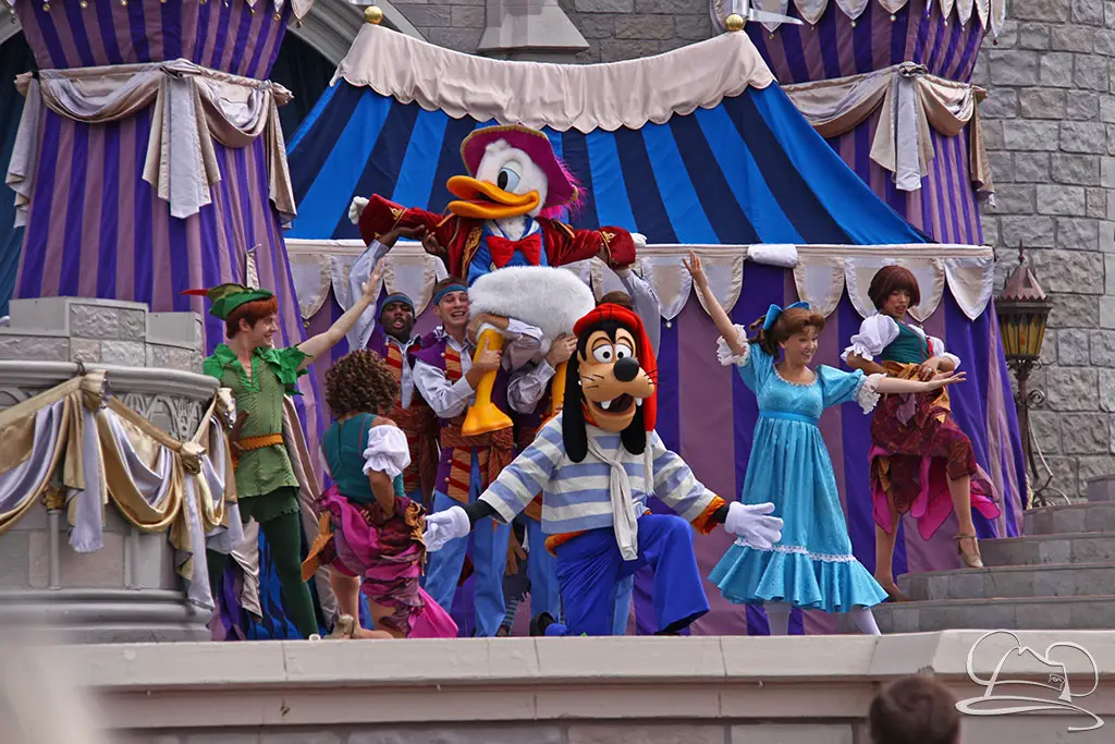 Along the way, they face Captain Hook with Mr. Smee and Maleficent. They are also joined by Aurora, Cinderella, Snow White and their princes. Peter Pan and Wendy also join the party. Full of heart, this show added magic daily to those visiting the Magic Kingdom.