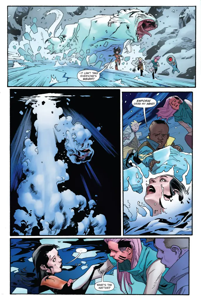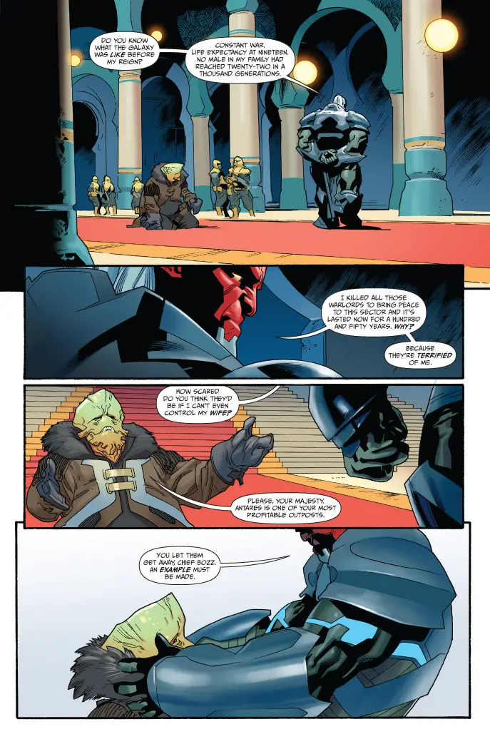 Outmatched and on the run, Queen Emporia and her and her children are racing to break away from the clutches of vengeful dictator Morax. Oh, and did we mention he’s her husband? With Morax’s new fleet of security nipping at their heels as they teleport between alien war zones, dead worlds and the lairs of intergalactic beasts – can they escape in time? Find out when EMPRESS #3 comes to comic shops and digital devices this June!