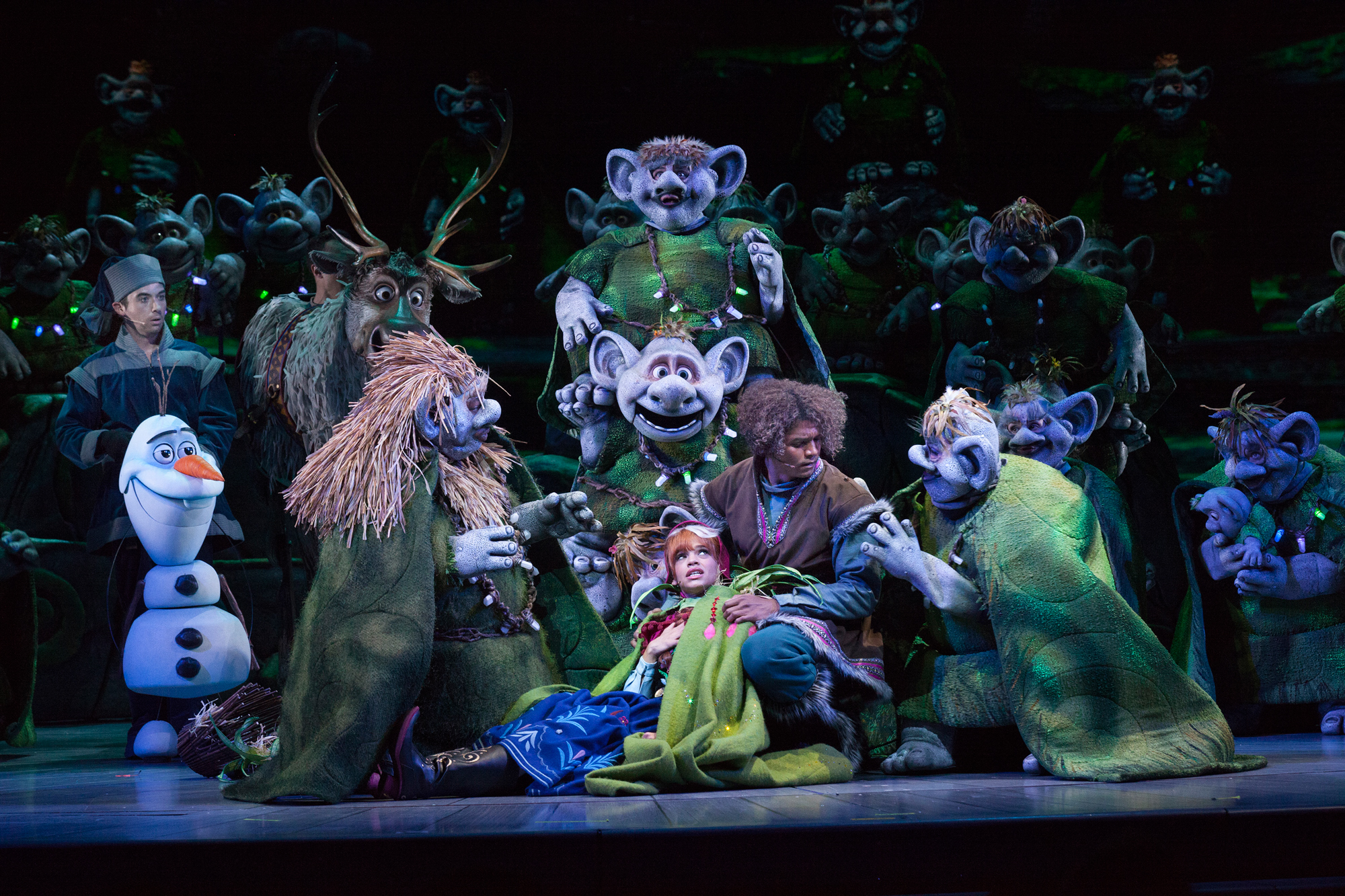 KRISTOFF TAKES ANNA TO THE TROLLS IN ‘FROZEN – LIVE AT THE HYPERION’ — A new theatrical interpretation for the stage based on Disney’s animated blockbuster film, Frozen is now playing at the Hyperion Theater at Disney California Adventure Park. The show immerses audiences in the emotional journey of Anna and Elsa with all of the excitement of live theater, including elaborate costumes and sets, stunning special effects and show-stopping production numbers. (Scott Brinegar/Disneyland Resort)