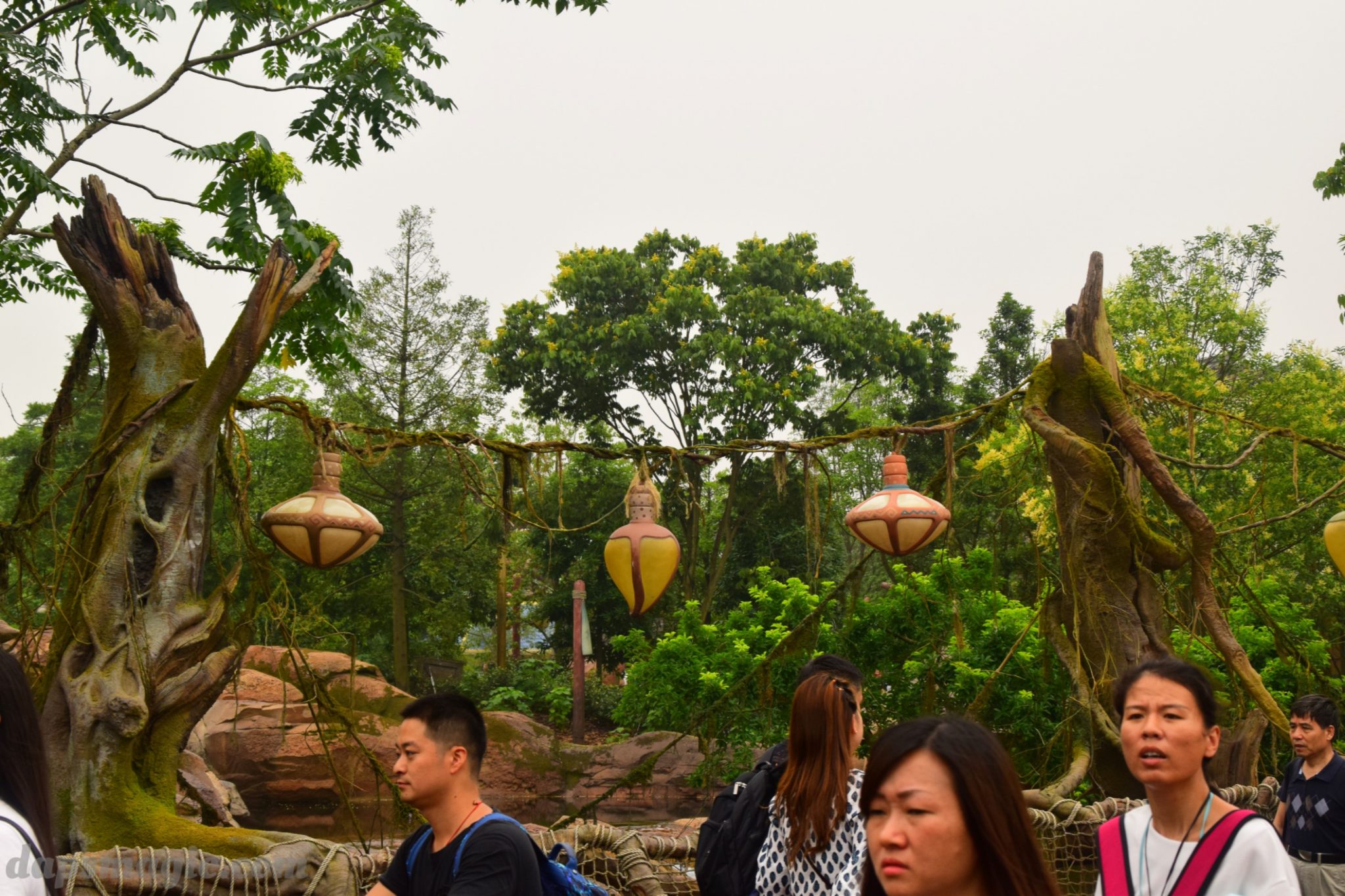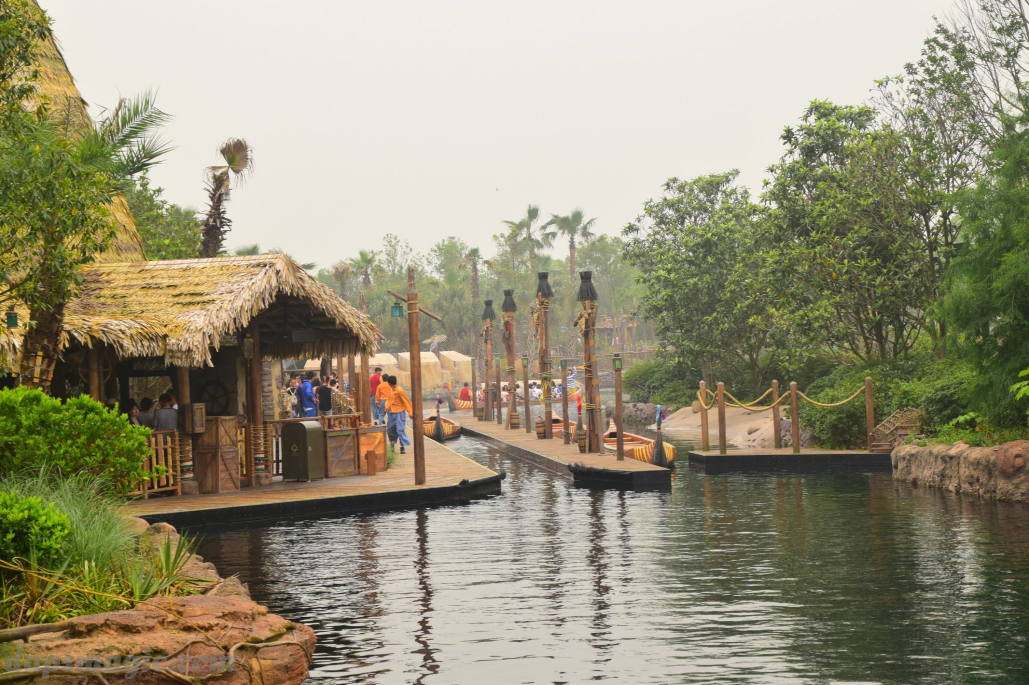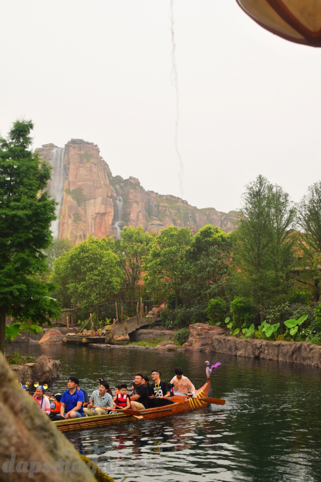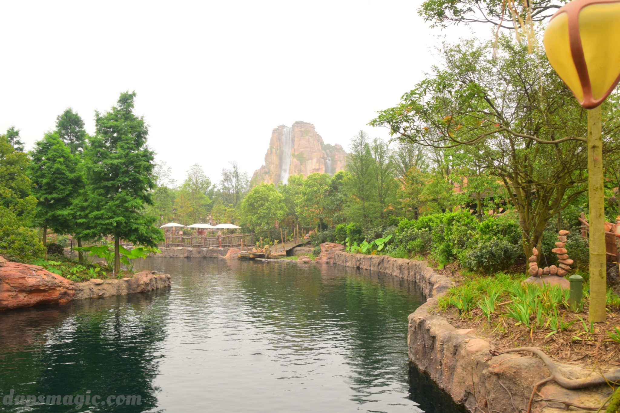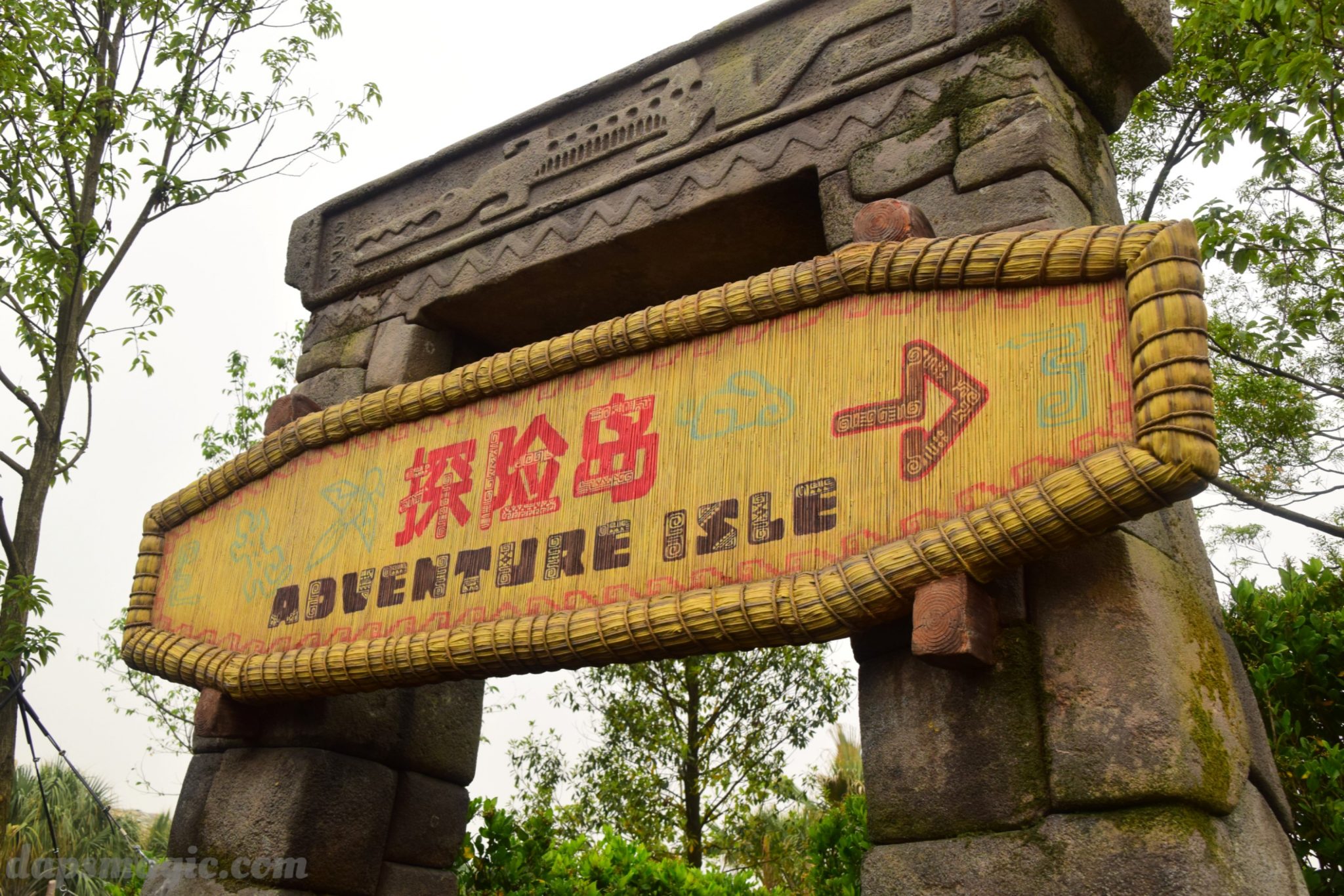 Adventure Isle feels like one of the most mysterious places ever constructed by Walt Disney Imagineering. Entering under the Adventure Isle sign guests are greeted by lush vegetation and a big mountain, translated in English to “Roaring Mountain.” This mountain is grand, and the highest in all of Shanghai…but that’s like saying Splash Mountain is the highest mountain in Florida. As you start to go down the paths of the isle, a river coming from the waterfall of the mountain serves as home to Explorer Canoes. In all, this land has a natural environment with man made structure built in. It’s a gorgeous landscape that makes it feel like a true jungle environment.