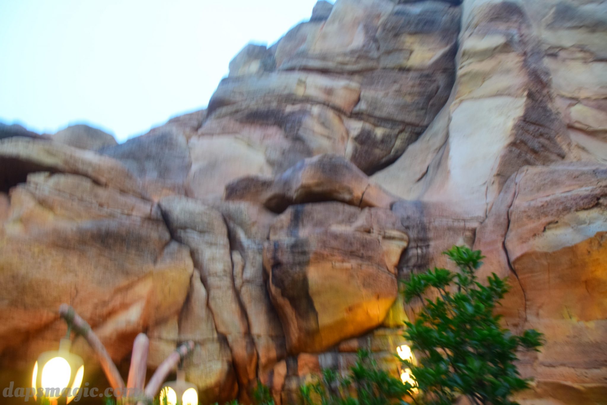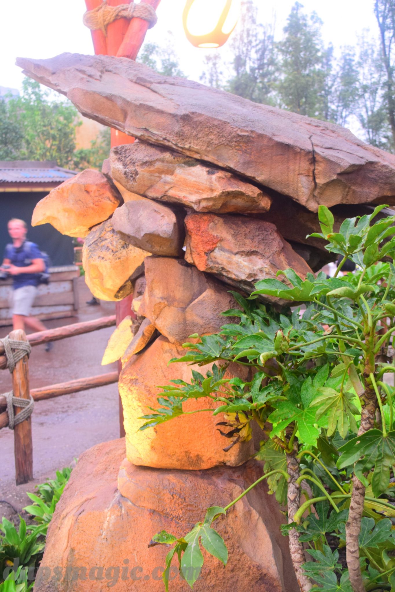 Besides the jungle plant life, there are other elements that make this feel like an adventurous area. Evidence of this being a community village is all around, from the lamps that light paths, to rock sculptures of animals littered throughout the place. These are all indicators that the natives are trying to have a balance to nature and thrive in it. But, there’s a bit of a dangerous feel to it all. In the distance, and sometimes along the river, a roar can be heard that would stop anyone in their tracks. This is the Q’aráq, a crocodile-like creature that lives in the mountain. He greets visitors at Roaring Rapids, but can be heard throughout Adventure Isle.