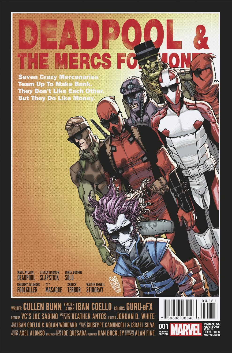 New York, NY—June 24th, 2016 — The fans have spoken and the Mercs for Money are back in business. This July, Wade Wilson and his lovable band are back in an all-new DEADPOOL AND THE MERCS FOR MONEY #1 – now an ongoing series! Coming in July, returning writer Cullen Bunn joins incoming artist Iban Coello for an all-out brawl-out as Deadpool, Solo, Slapstick, Foolkiller, Stingray, Terror and Masacre (and even a few surprises members!) hit the Marvel Universe in search of cold, hard cash! Deadpool may be one of the best mercenaries on the planet. He may even be a passable Avenger. Know what he isn’t? A good leader. Don’t believe us? Ask the Mercs for Money! But they’ll have to work as a team when a big job with an even bigger payday falls into their laps. The job? Rid the Marvel Universe of its radioactive super villains. Easier said than done – especially when only one of them has a healing factor. Sorry, everyone but Deadpool. If you’ve got a pile of cash you’re not overly fond of, and you can find them – maybe you can hire these miscreant mercenaries. Or you catch the exciting first issue of this ongoing series when DEADPOOL AND THE MERCS FOR MONEY #1 embarks on a new adventure this July!