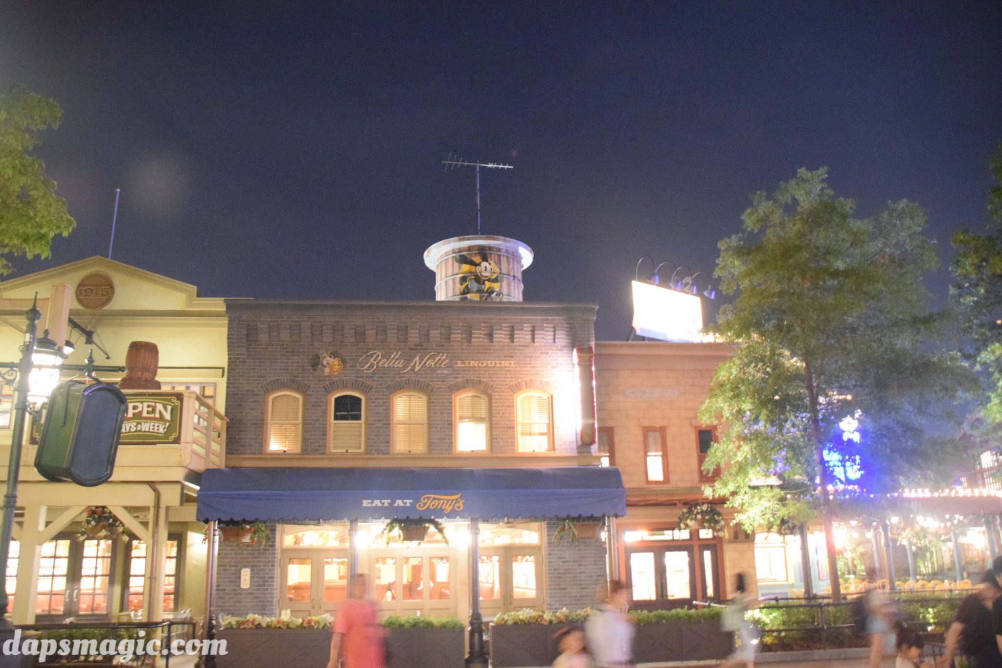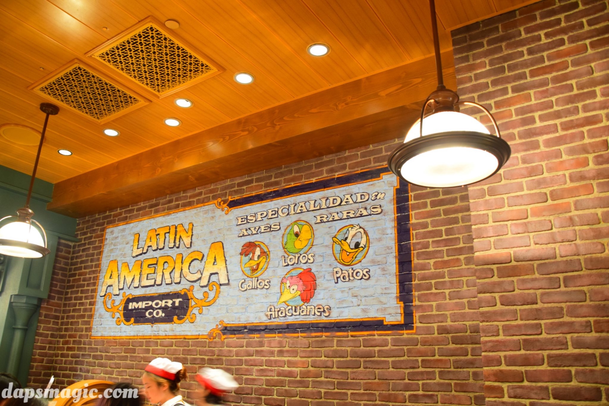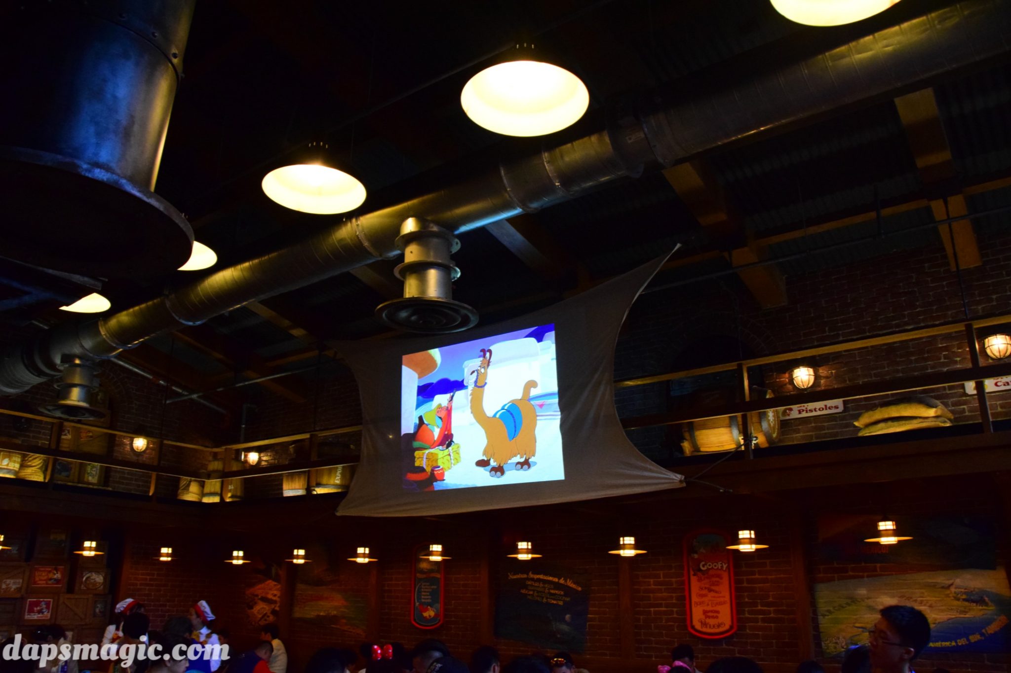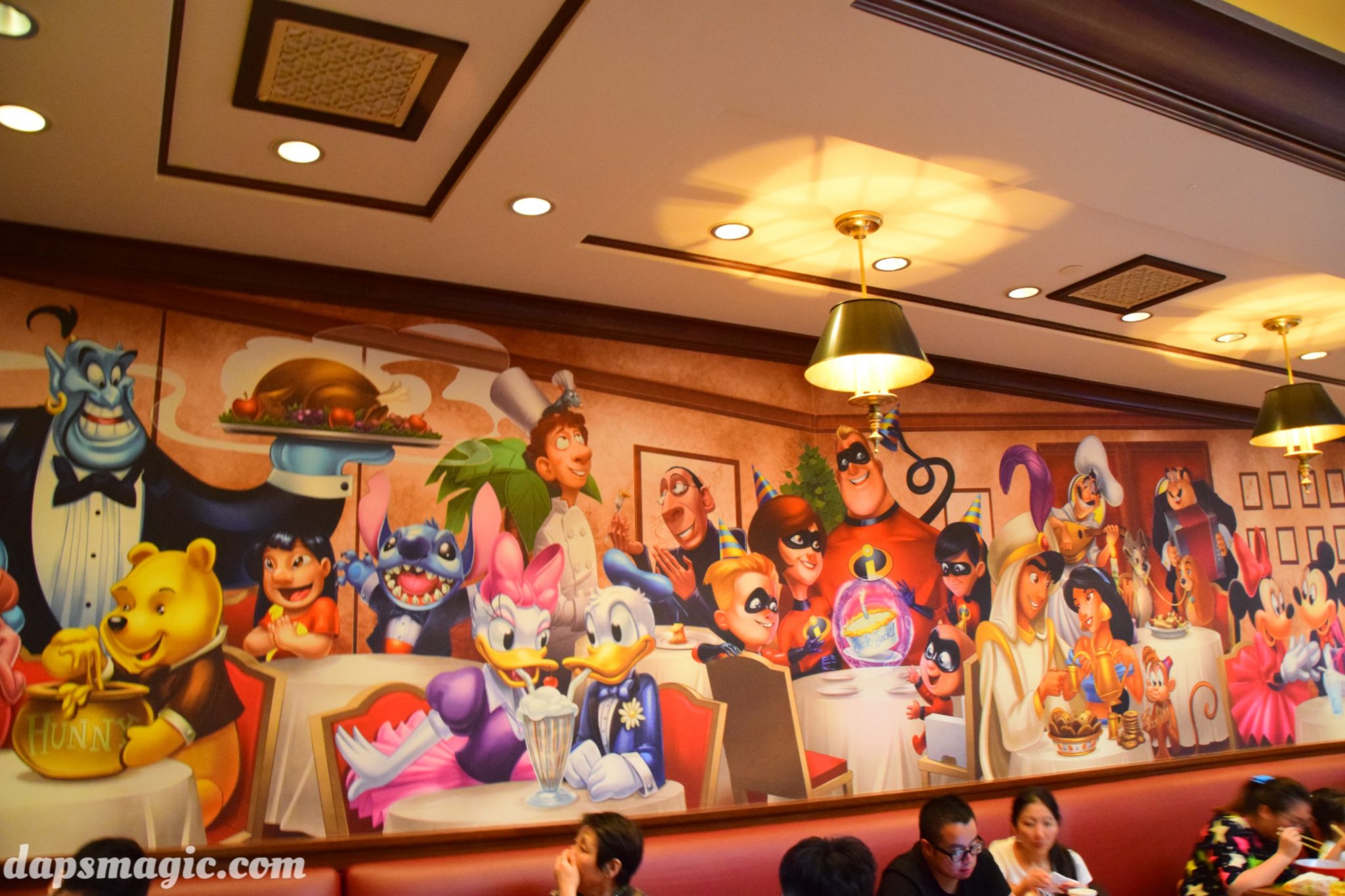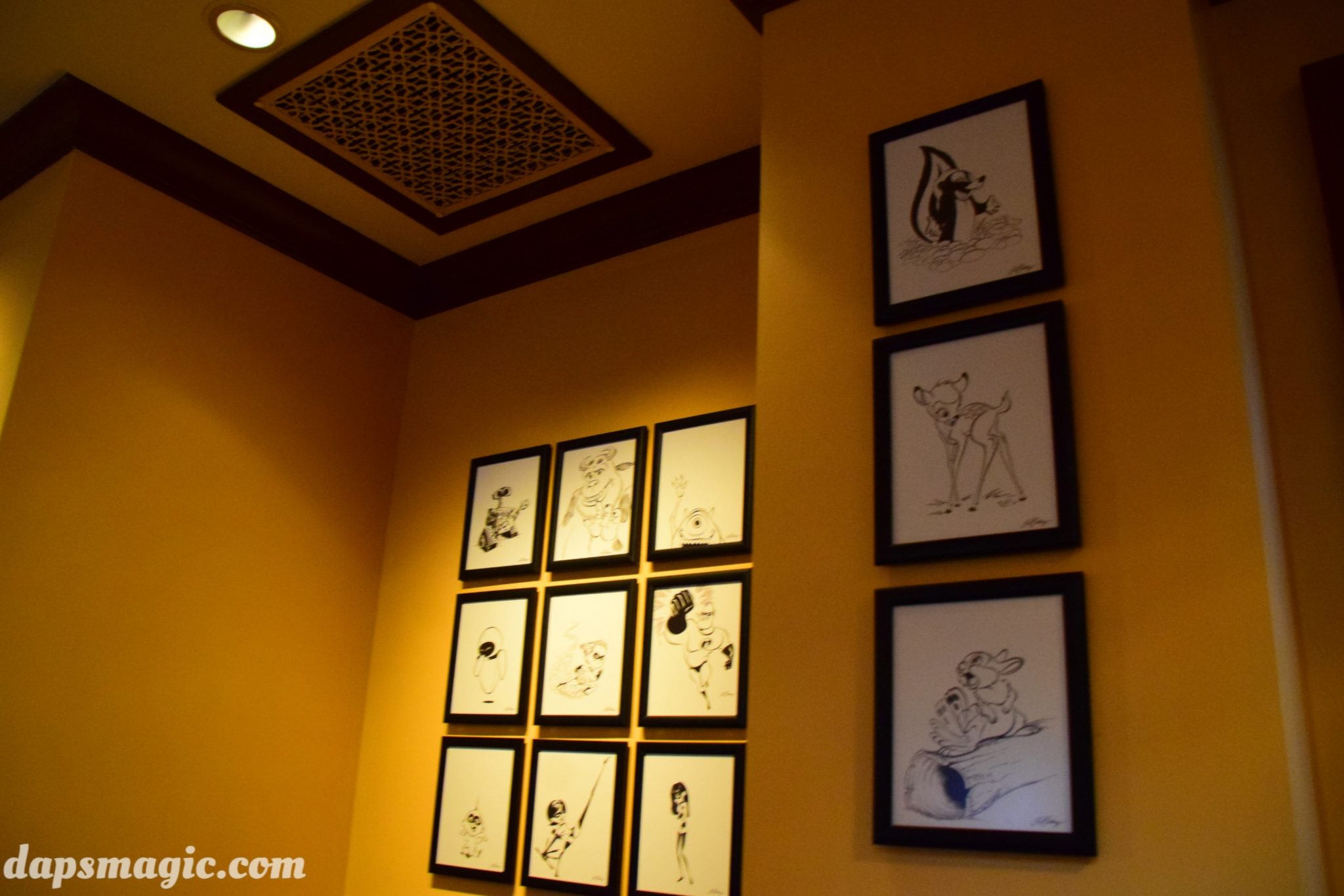 Three Caballeros, and has appropriate props to signify this. On one of the walls plays cartoons from the more Latin flavored animated films by Walt Disney. The most amazing dining room is the Tony’s section. This Tony’s is the same Tony’s from Lady and the Tramp. It’s the first time the inside of the restaurant has been realized! With some Italian restaurant decor, the other theme idea is taken from the Brown Derby, where caricatures of celebrities that have eaten there adorn the walls. Tony’s has several portraits of Disney characters that show who’s frequented Tony’s.