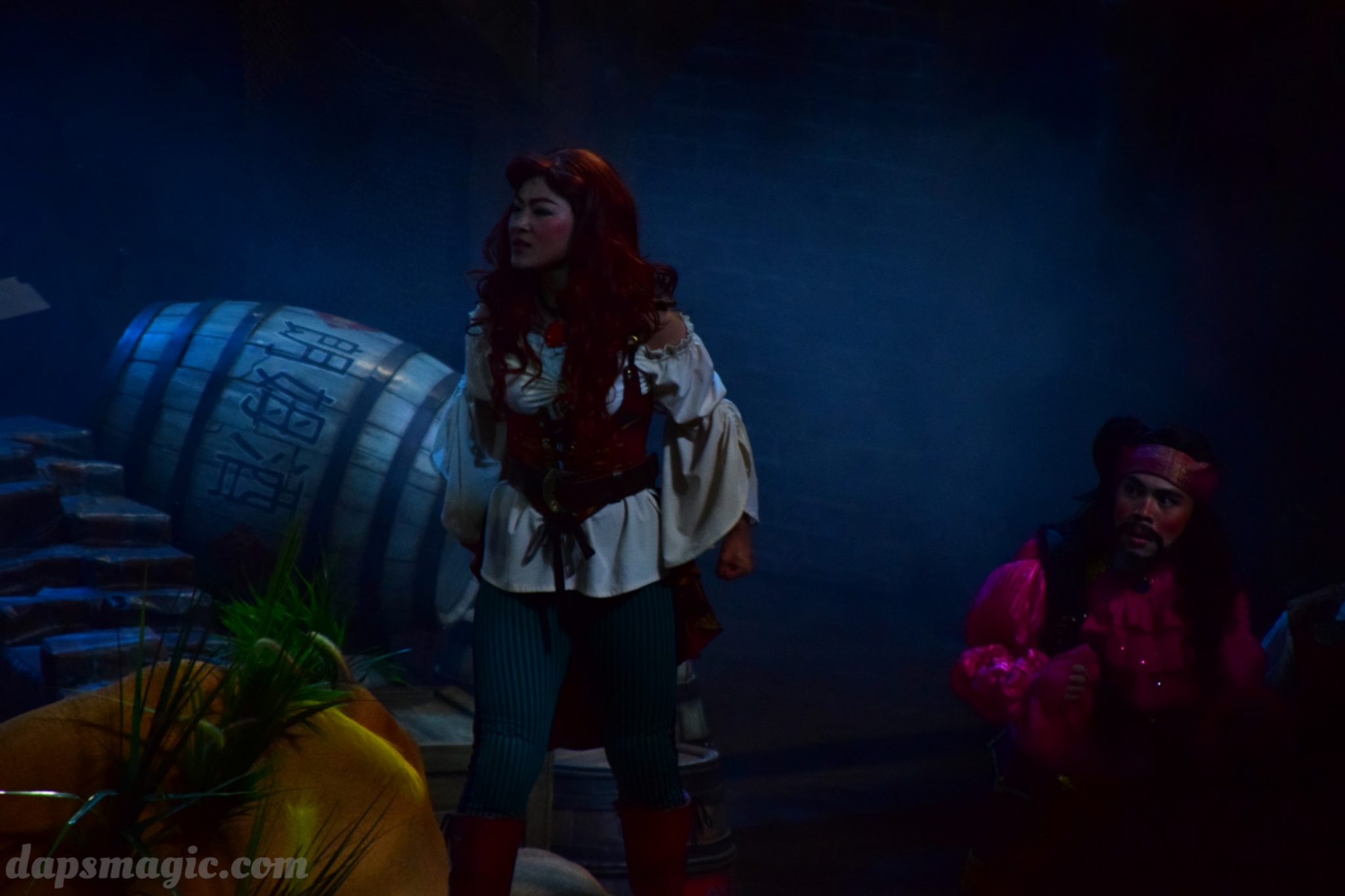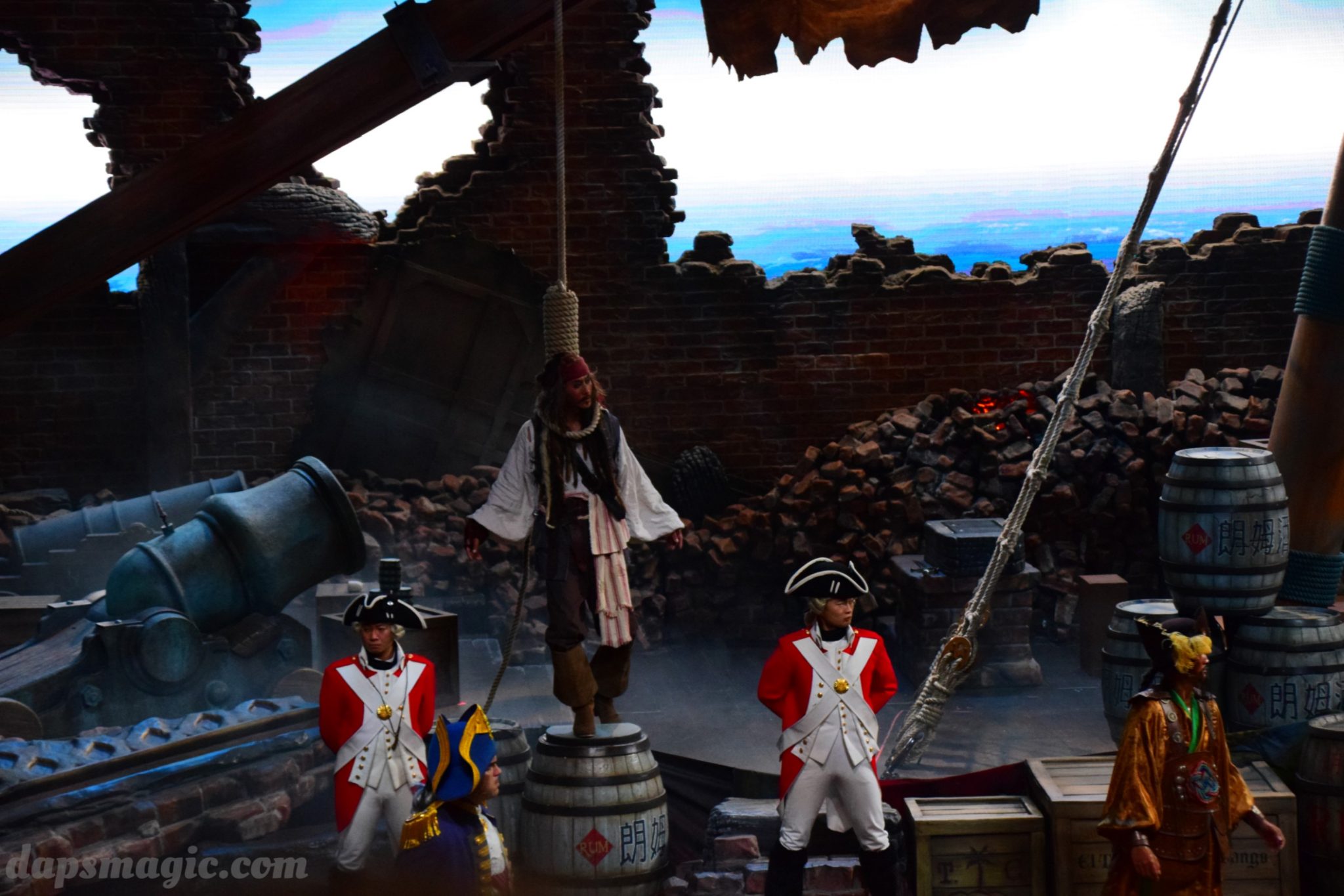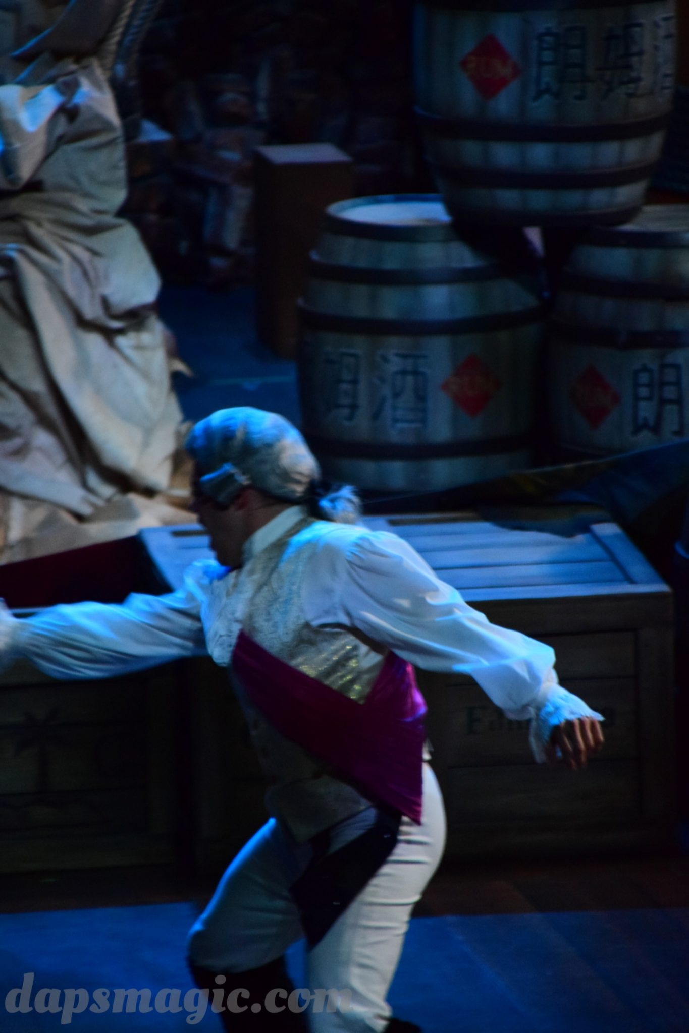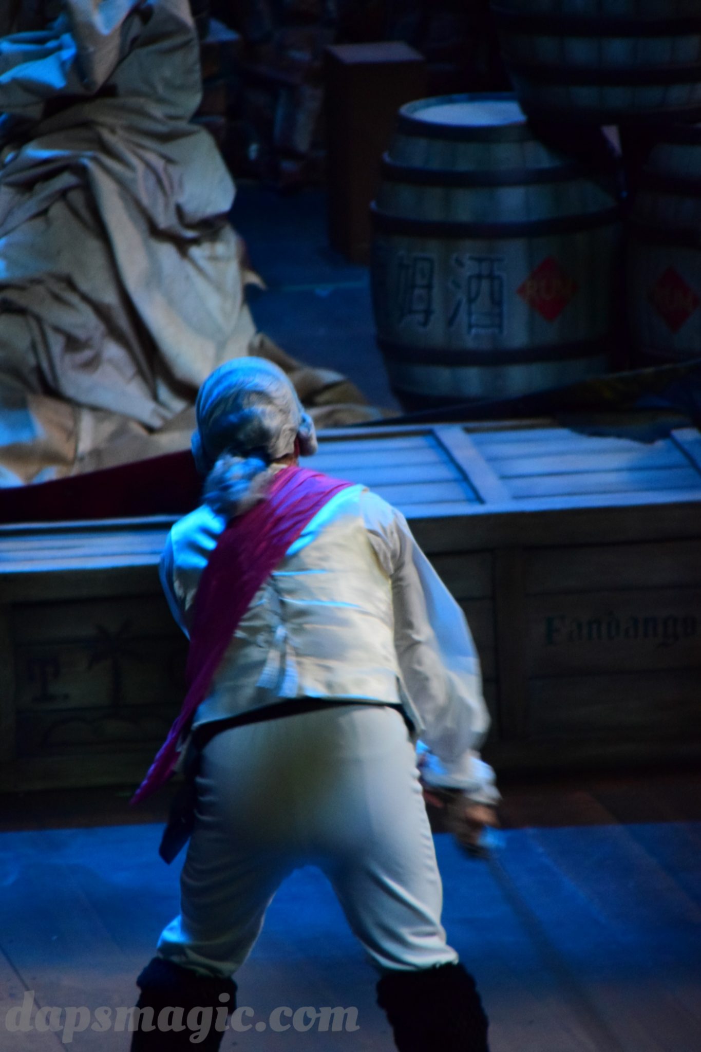 One of the main attractions is a stunt show starring Jack Sparrow. It is entirely in Chinese, so understanding is a bit difficult. From what I can tell, some pirates have infiltrated a theater and want to star in the production. Everyone hates the Admiral, who is the commander of the police force for Treasure Cove. As the play goes on, Jack Sparrow, who is wanted by the British navy and not liked by others, hides in the theater during the production. The Admiral shows up and lays siege to the theater, blowing it up and revealing a storm brewing outside. As a battle unfolds, it’s up to Jack to save the day.