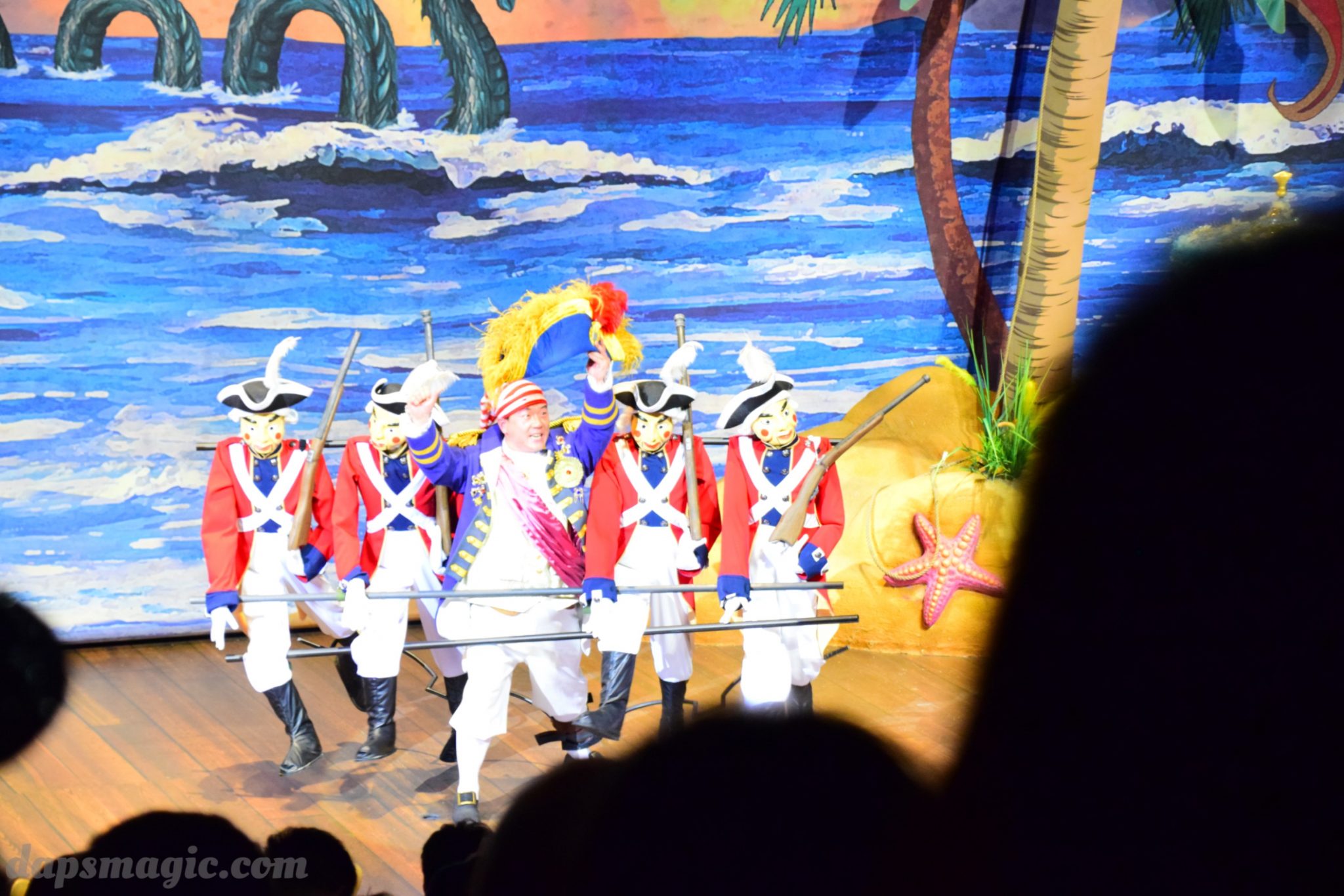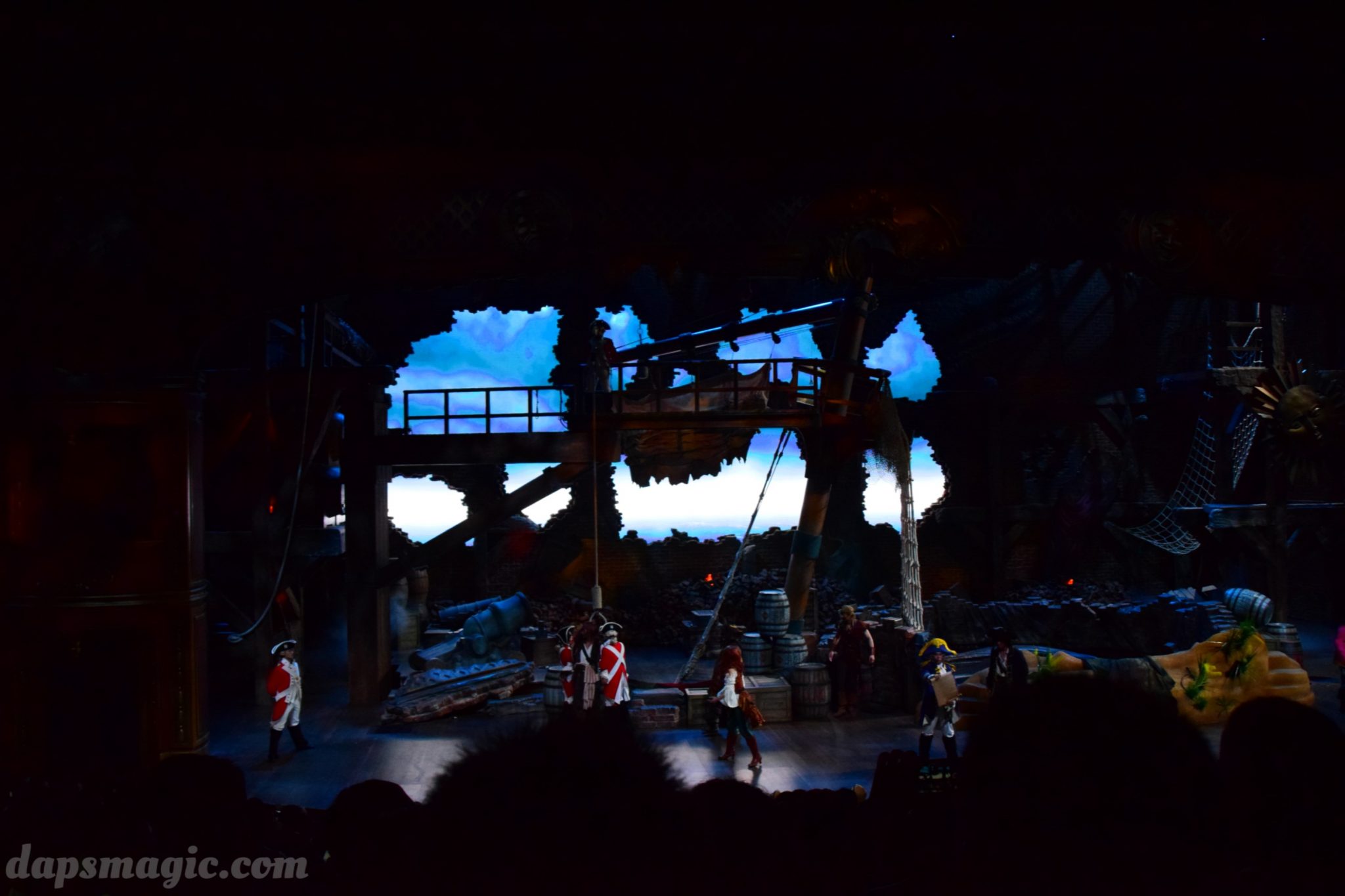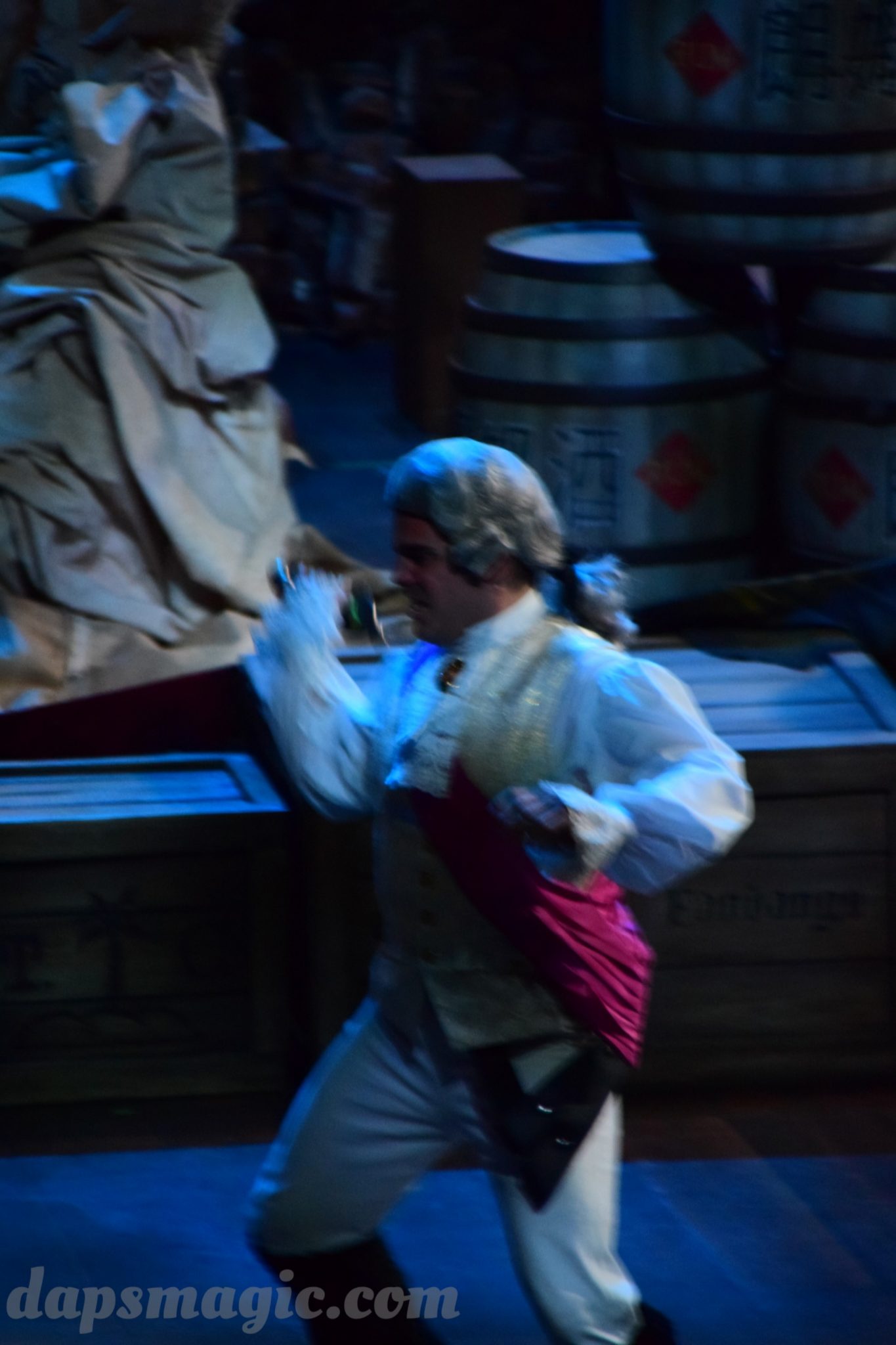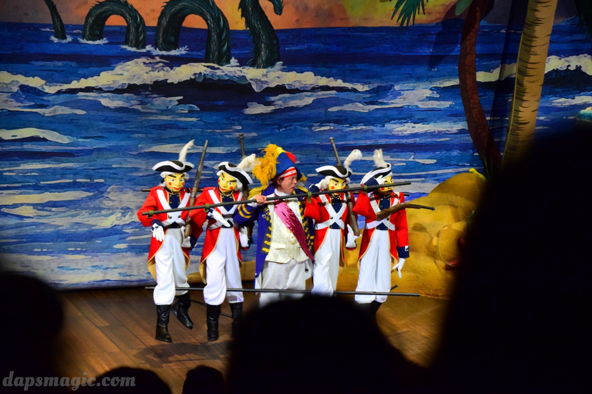 One of the main attractions is a stunt show starring Jack Sparrow. It is entirely in Chinese, so understanding is a bit difficult. From what I can tell, some pirates have infiltrated a theater and want to star in the production. Everyone hates the Admiral, who is the commander of the police force for Treasure Cove. As the play goes on, Jack Sparrow, who is wanted by the British navy and not liked by others, hides in the theater during the production. The Admiral shows up and lays siege to the theater, blowing it up and revealing a storm brewing outside. As a battle unfolds, it’s up to Jack to save the day.