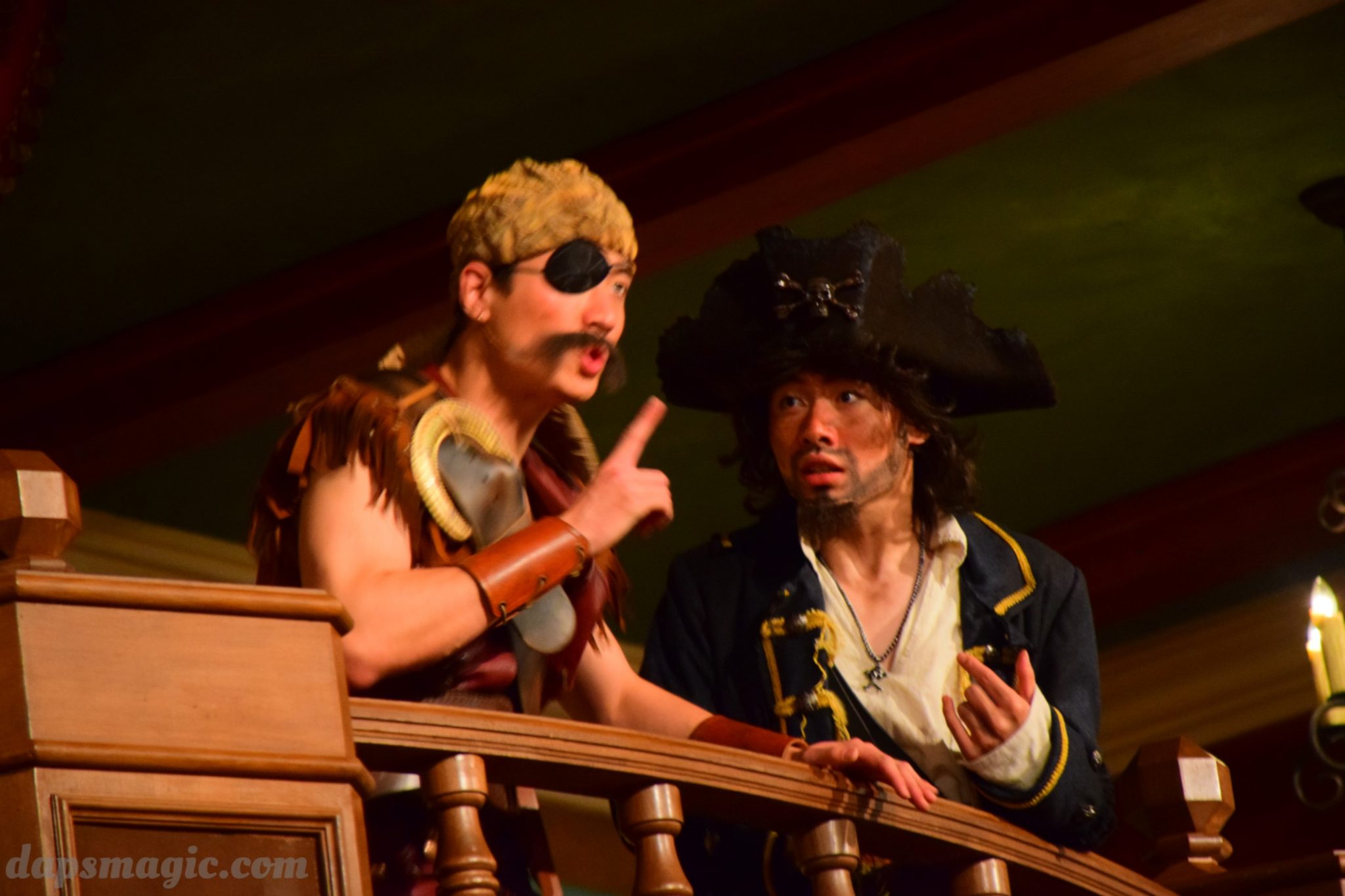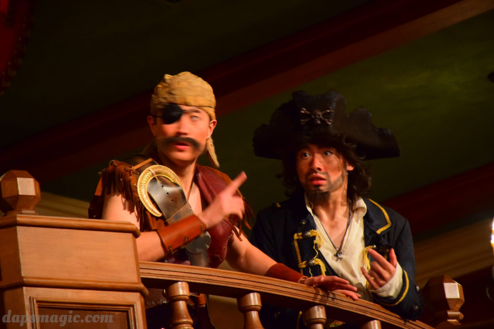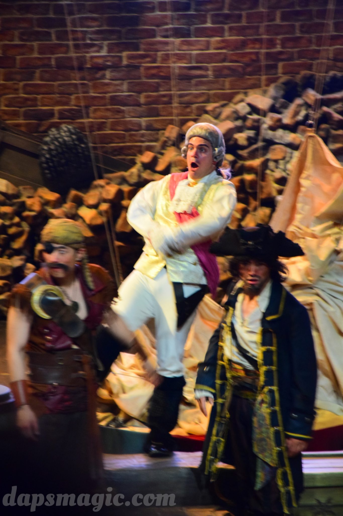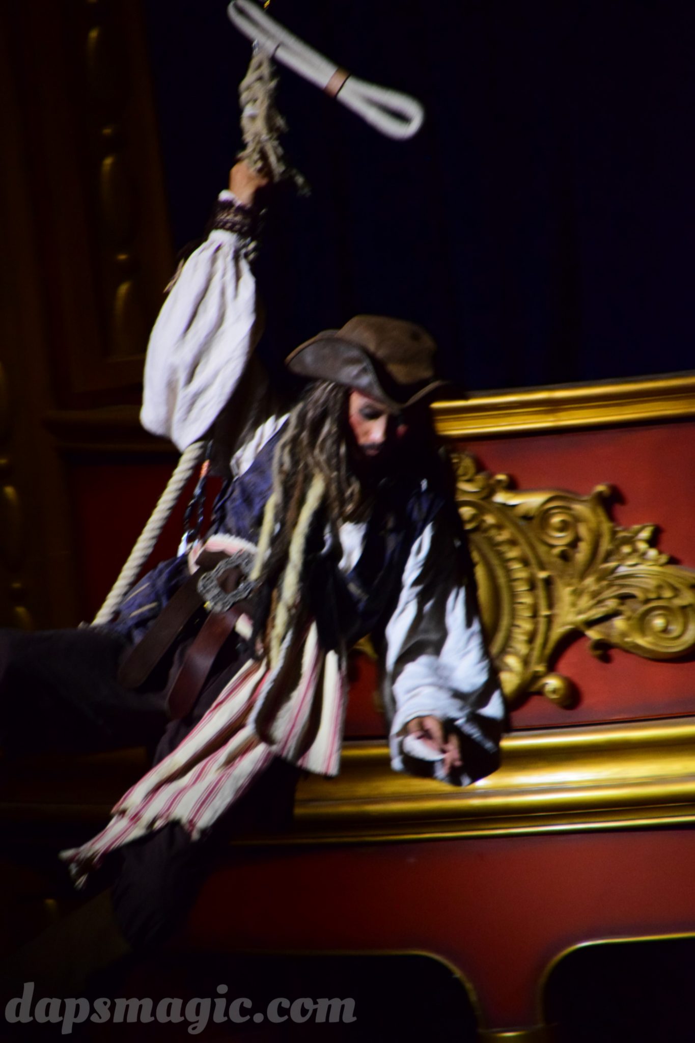 One of the main attractions is a stunt show starring Jack Sparrow. It is entirely in Chinese, so understanding is a bit difficult. From what I can tell, some pirates have infiltrated a theater and want to star in the production. Everyone hates the Admiral, who is the commander of the police force for Treasure Cove. As the play goes on, Jack Sparrow, who is wanted by the British navy and not liked by others, hides in the theater during the production. The Admiral shows up and lays siege to the theater, blowing it up and revealing a storm brewing outside. As a battle unfolds, it’s up to Jack to save the day.