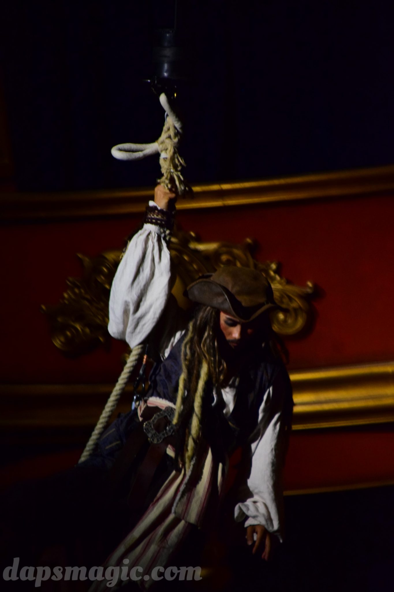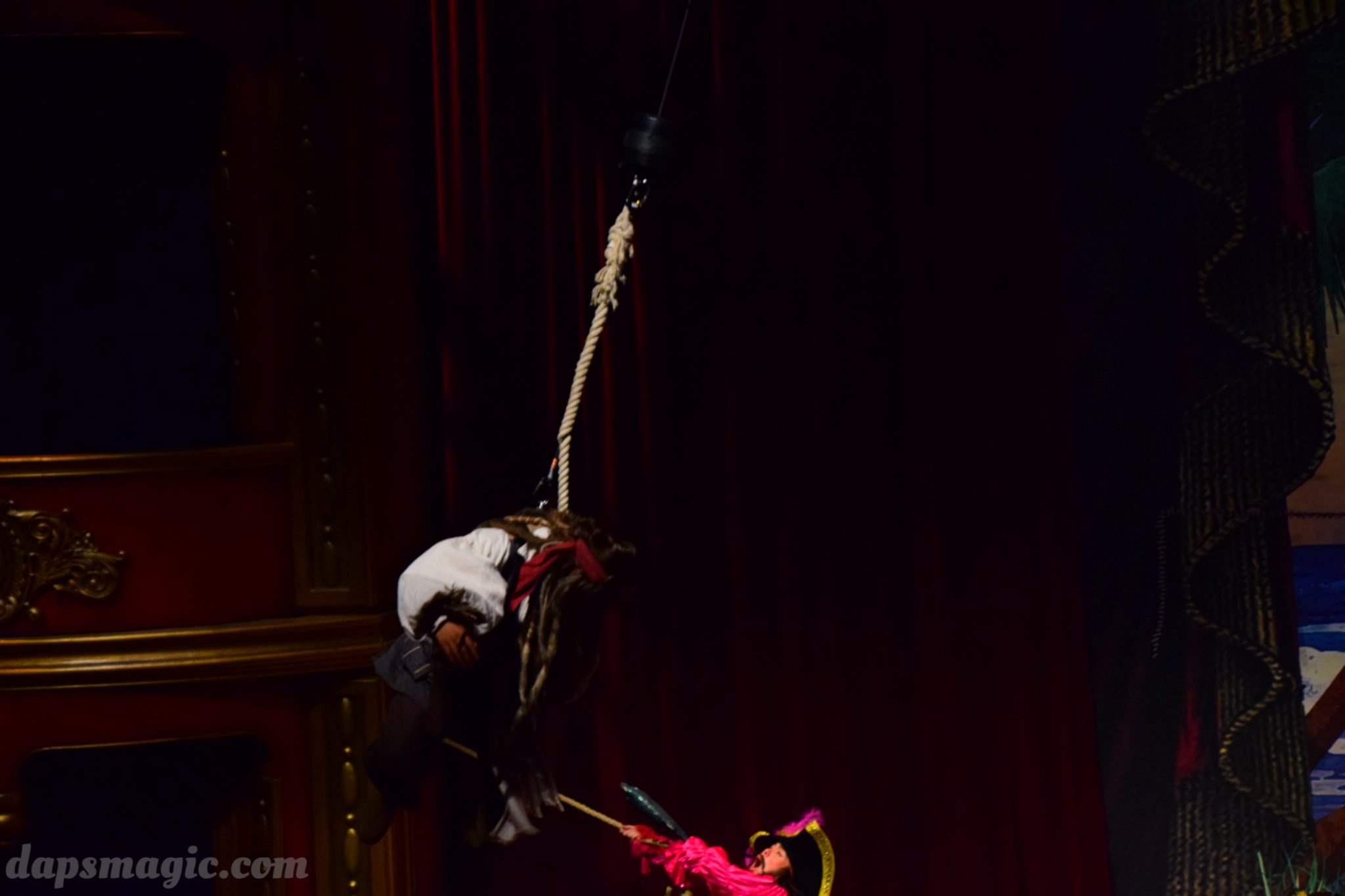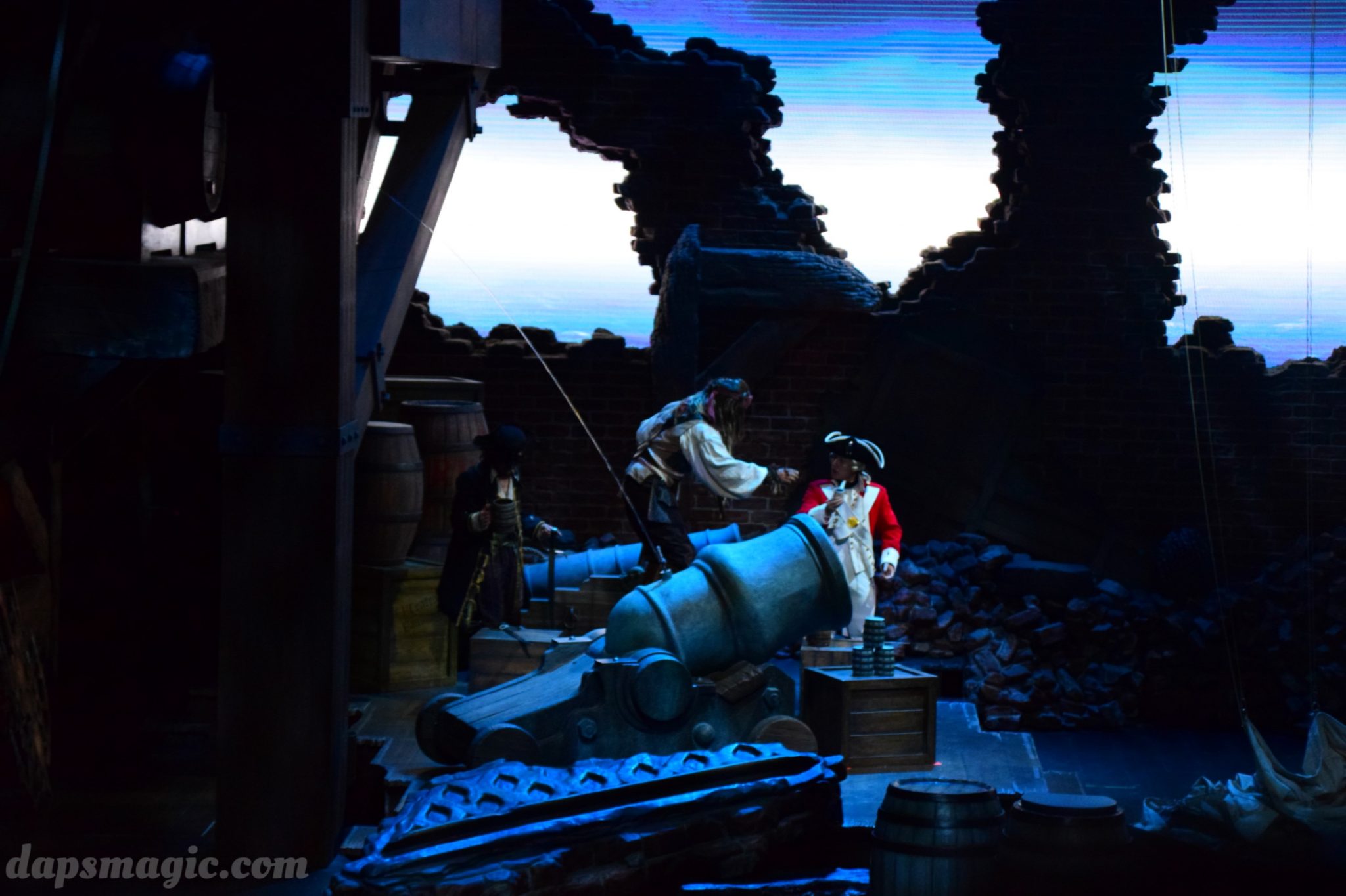 I’ve seen many stunt shows, and many ways to do finales that have people leaving amazed, but they get to be somewhat the same. Eye of the Storm provided something different: a battle in a tornado. Yes. A tornado. A vertical wind tunnel made for a battleground for Captain Jack Sparrow and the Admiral. An up and down fist fight while twisting and turning made this truly spectacular. It was like nothing I had ever seen before and made me think that these guys really knew what they were doing through many rehearsals.