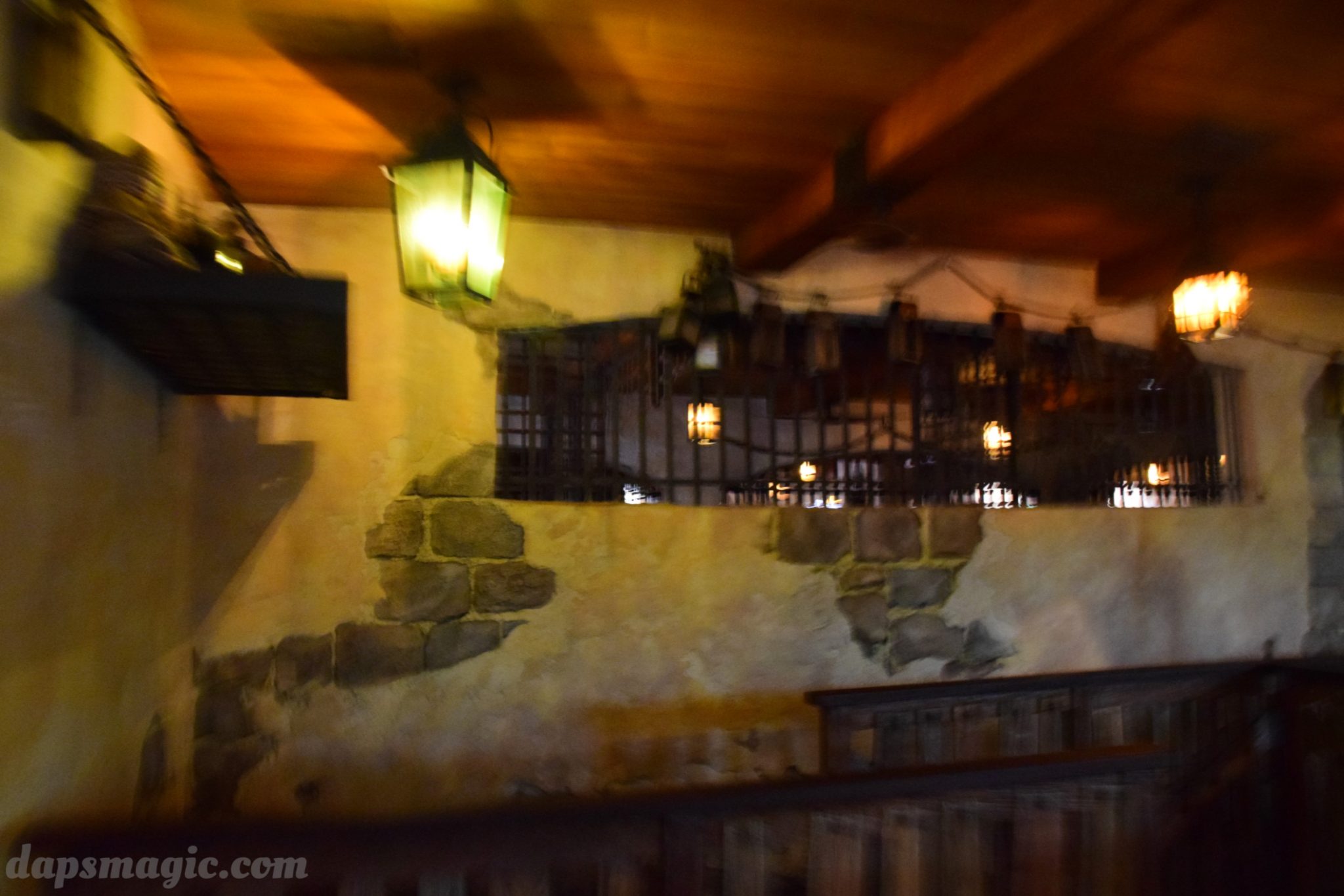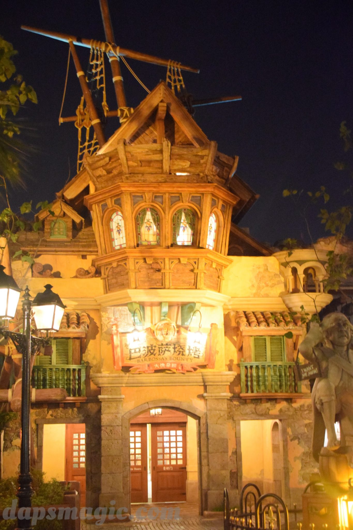 Besides what there is to do, there is a great place to eat: Barbossa’s Bounty. This quick service restaurant is set up to be like eating in different parts of the village. So, not only does it have great food, but great decoration and atmosphere. One of the dining areas overlooks the Pirates of the Caribbean attraction, in Blue Bayou style. It made for one of the better places to eat in the park in all. I had two of the possible meals, and even tried the specialty drink. It was all very appetizing.