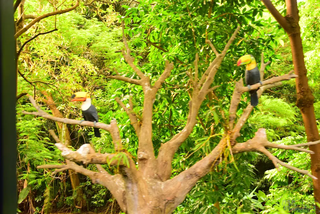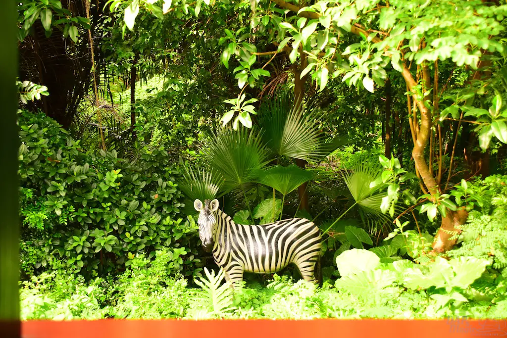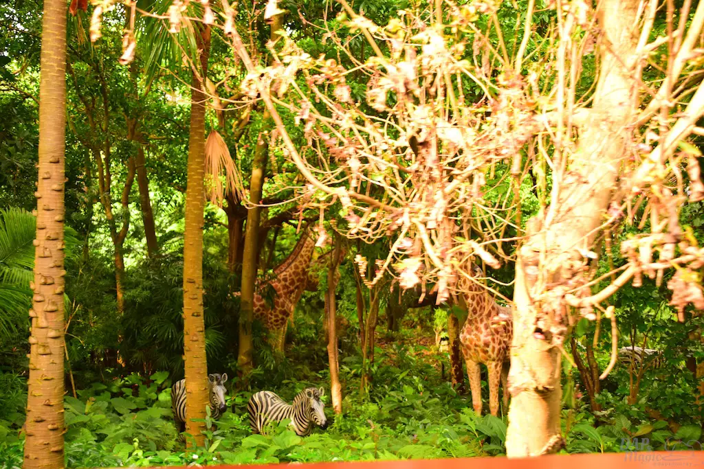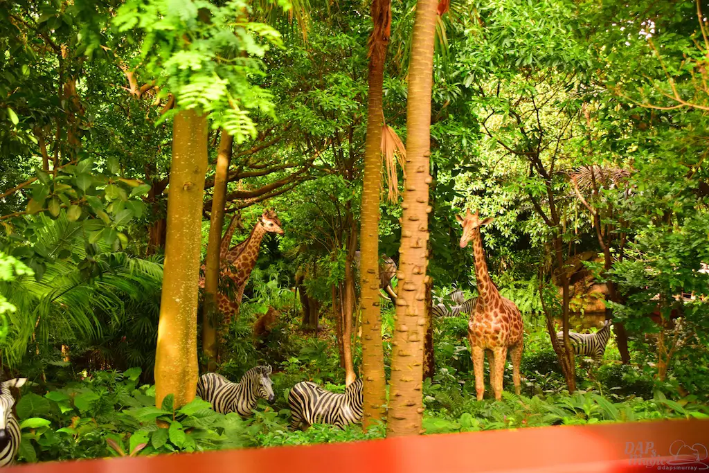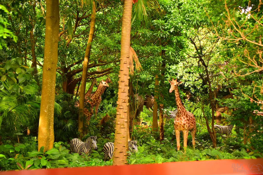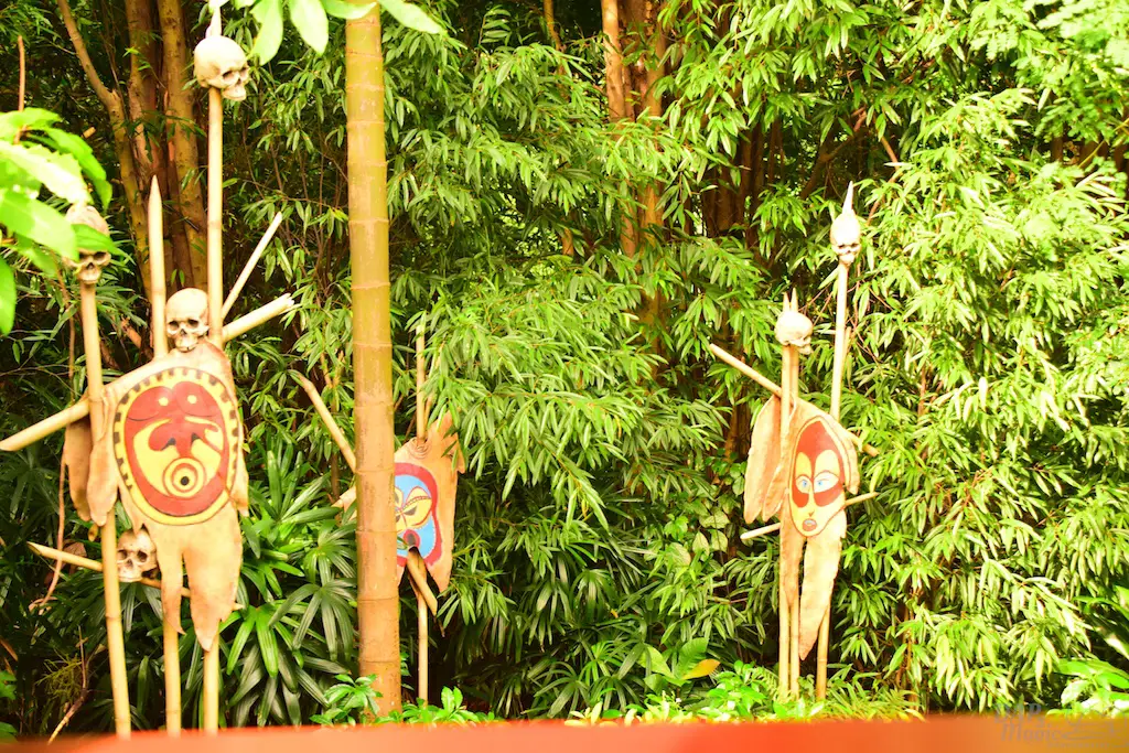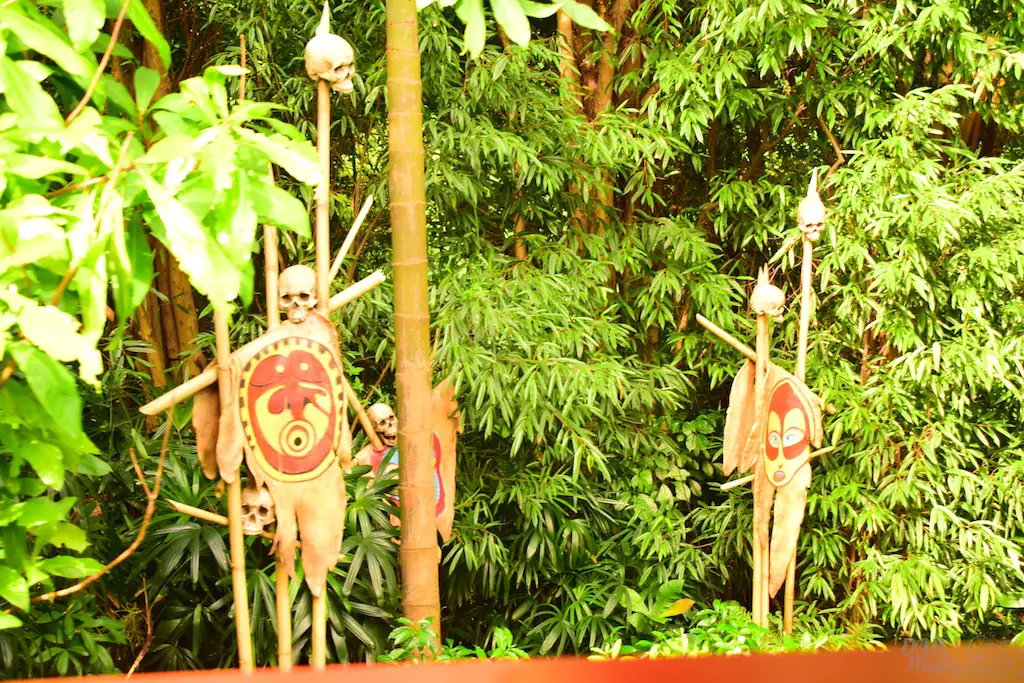 The trains first go past Adventureland, a similar route to the original. But, this jungle atmosphere has some animals that seemed to escape the Jungle River attraction. Not only that, but signs of natives are abound. Through the trees you can see some of the river attractions that exist in the adventure area.