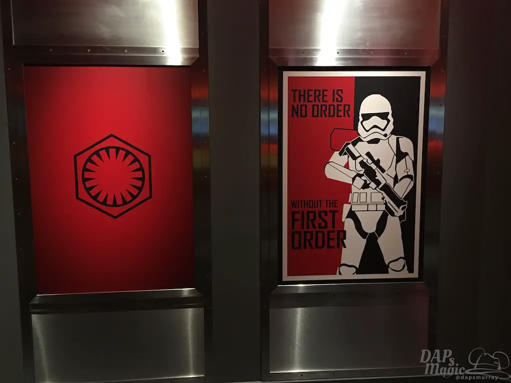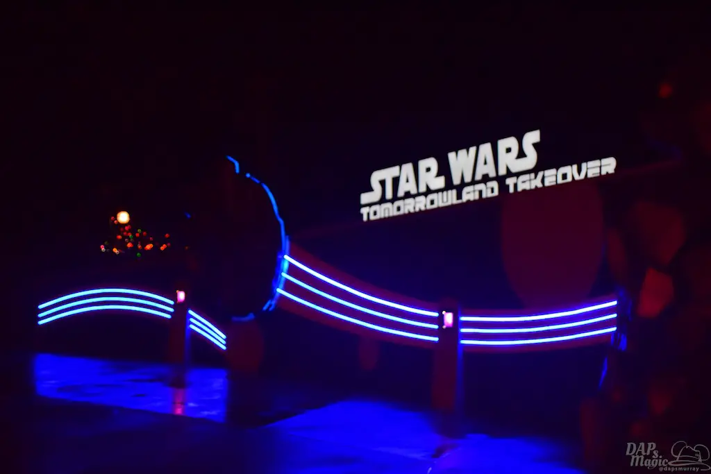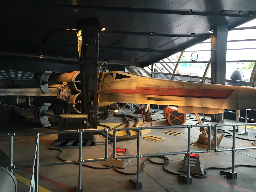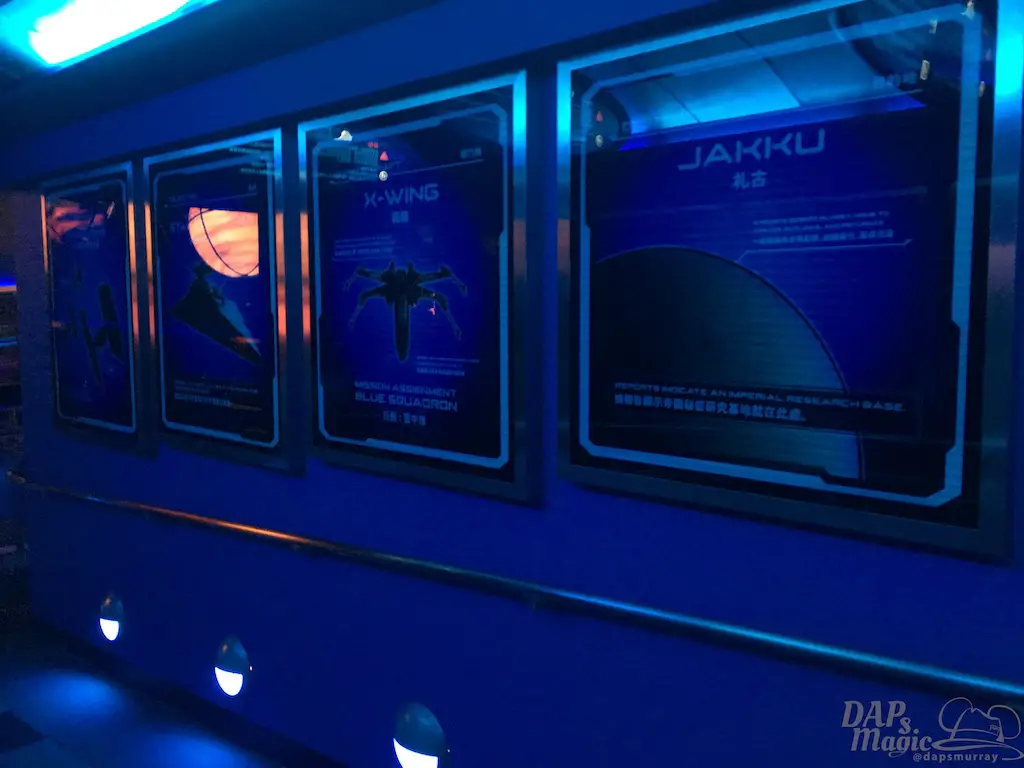 Before getting to the vehicles is shorter than most other Space Mountains I’ve been on. The outside queue does contain a great X-Wing prop featured in a hangar. With that the placemaking is great and effective to transplant you in the world of Star Wars. Inside, monitors constantly have Admiral Ackbar explain the mission at hand. Graphics on the wall also tell of the impending battle ahead. It’s a great setting for a great ride.
