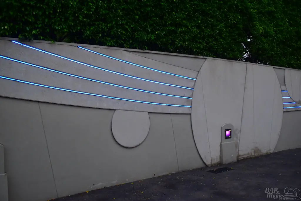 Approaching Fantasyland’s station has a few glimpses into the land. One is of the new Fairy Tale Forest walkthrough attraction. The station is near it’s a small world and the Mad Tea Party ride. After stopping at this part of the attraction, more of Fantasyland is displayed, including a view of Mickey and the Wondrous Book’s queue.