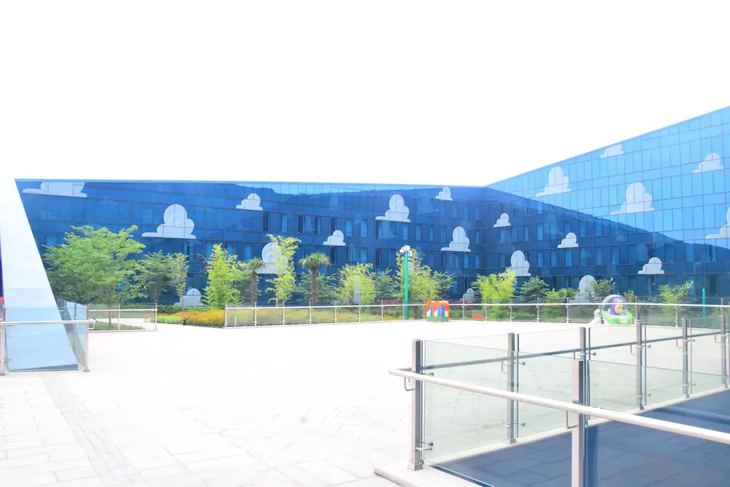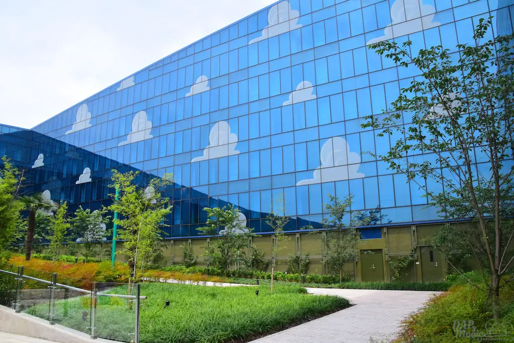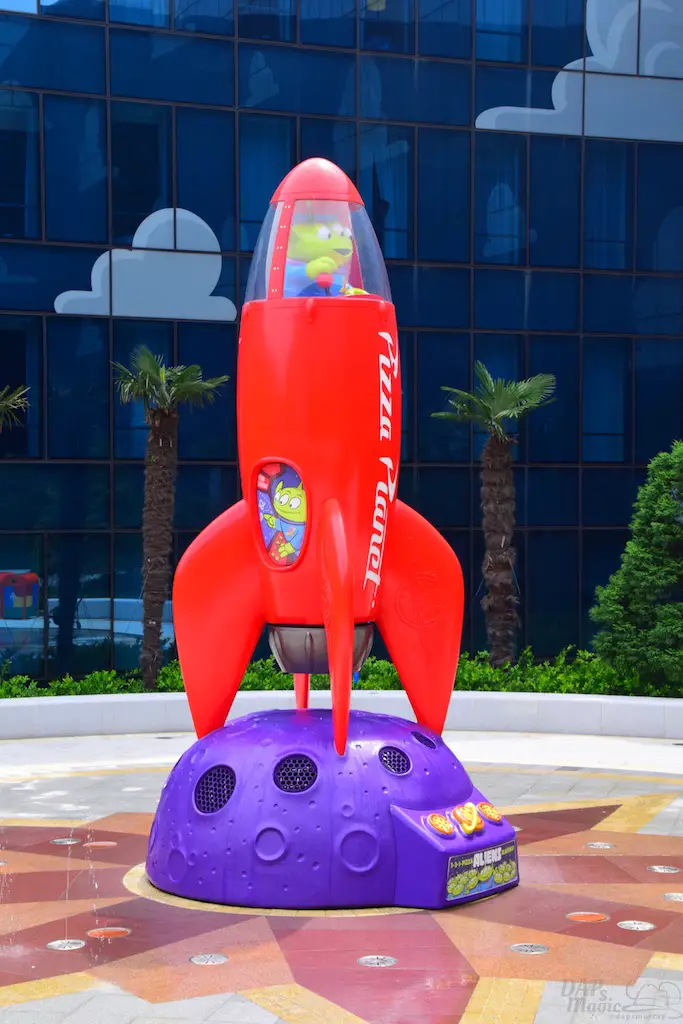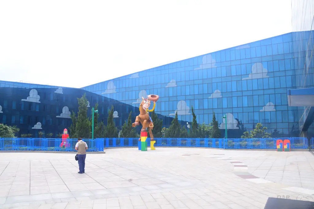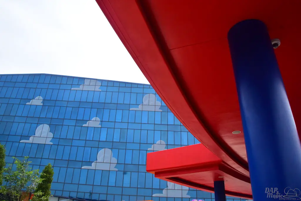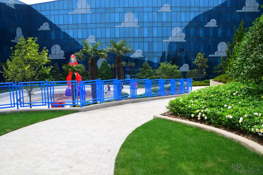 Outside on some courtyards of the hotel were a few great features. First, you get a good glimpse of the design of the hotel. Though it’s reflective, you can clearly see the painted clouds that sit in the shimmering blue. Then there’s actual grass on the roofs. Or, at least, the “ramp downs” had them which made me think it goes all the way around. Then there’s the giant statues of Woody and Bullseye, and Buzz. For having two courtyards that looked almost identical, these helped identify where you were at. In the Woody courtyard was where the characters would appear and pose for photos. In the Buzz area was a small water tower playground with the LGM’s.