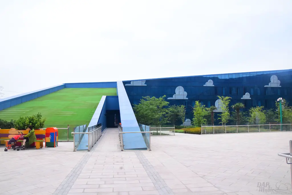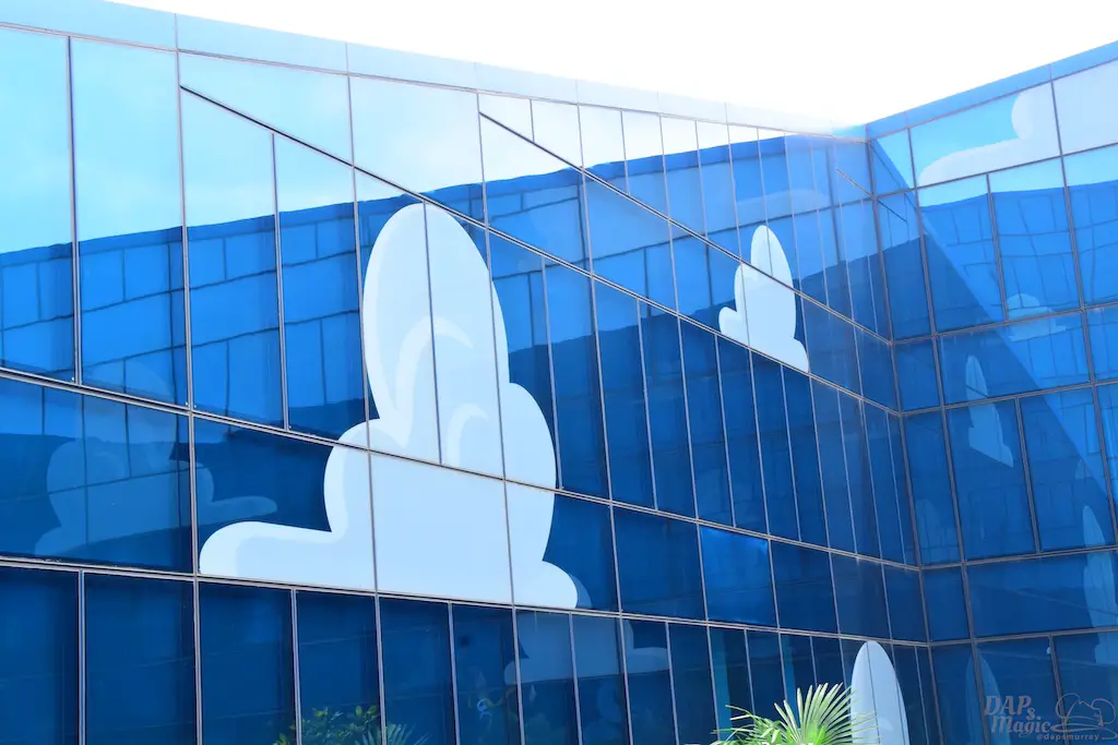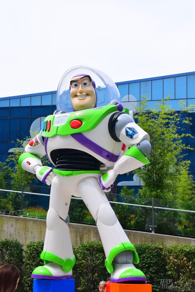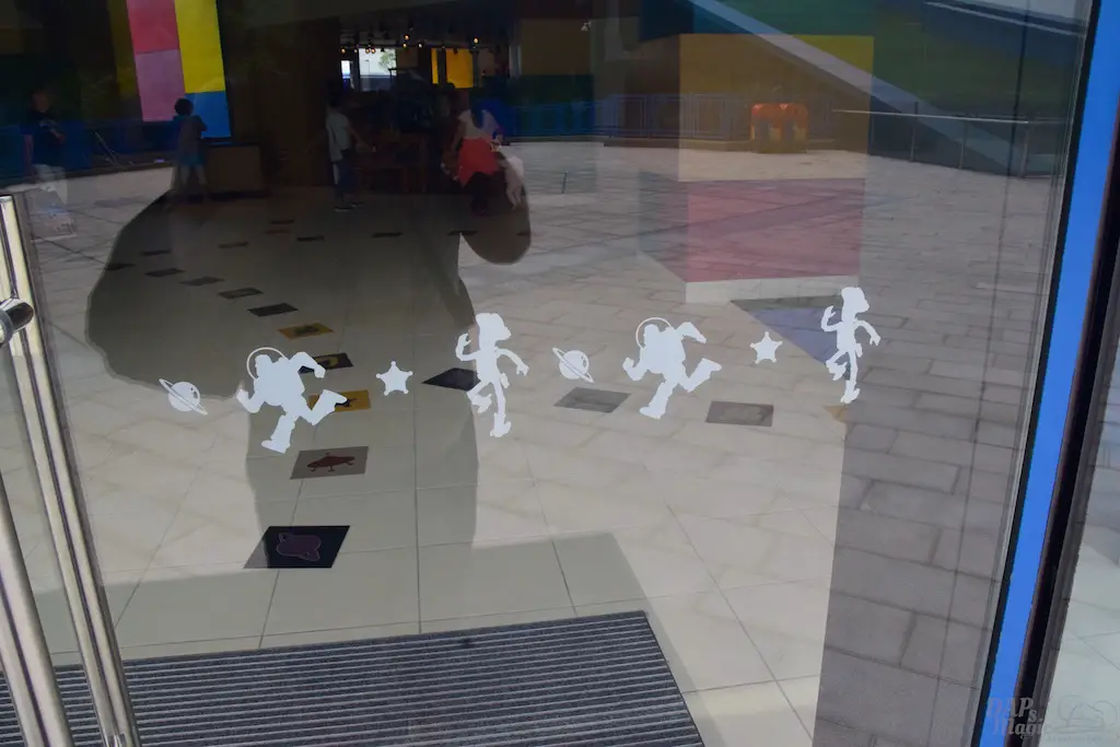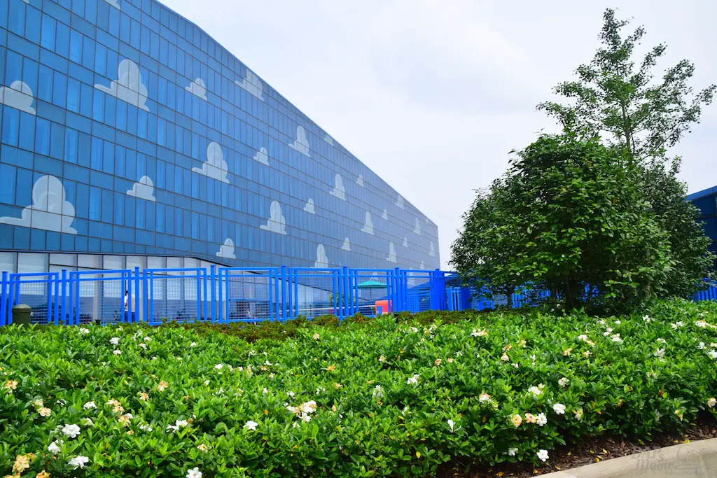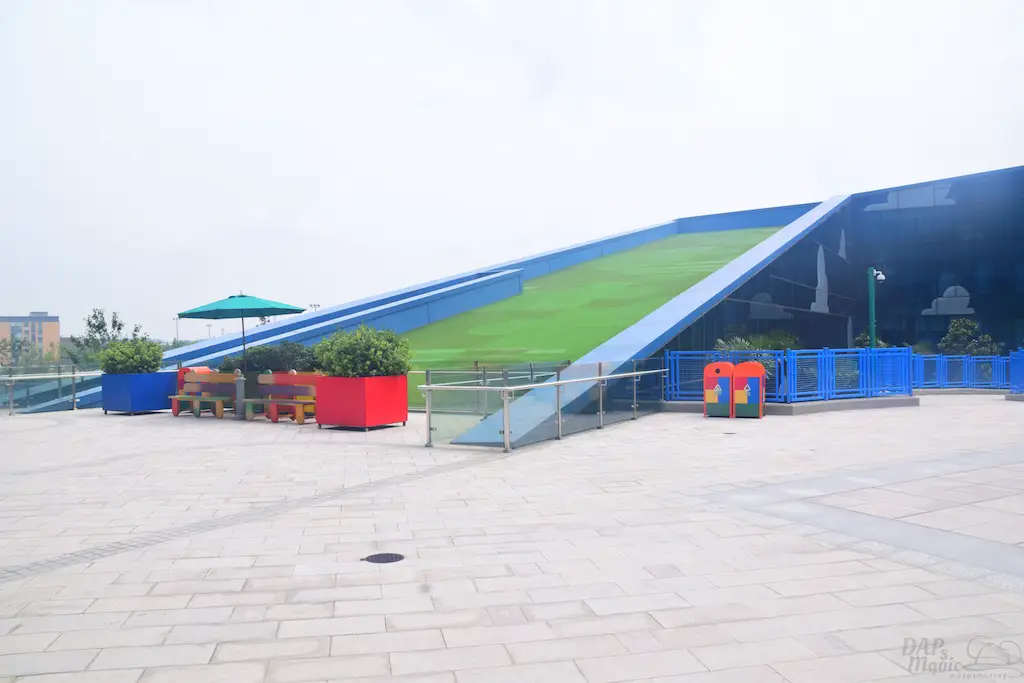 Outside on some courtyards of the hotel were a few great features. First, you get a good glimpse of the design of the hotel. Though it’s reflective, you can clearly see the painted clouds that sit in the shimmering blue. Then there’s actual grass on the roofs. Or, at least, the “ramp downs” had them which made me think it goes all the way around. Then there’s the giant statues of Woody and Bullseye, and Buzz. For having two courtyards that looked almost identical, these helped identify where you were at. In the Woody courtyard was where the characters would appear and pose for photos. In the Buzz area was a small water tower playground with the LGM’s.