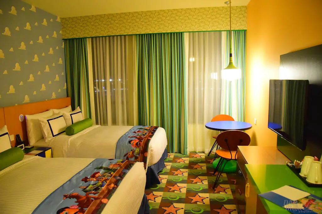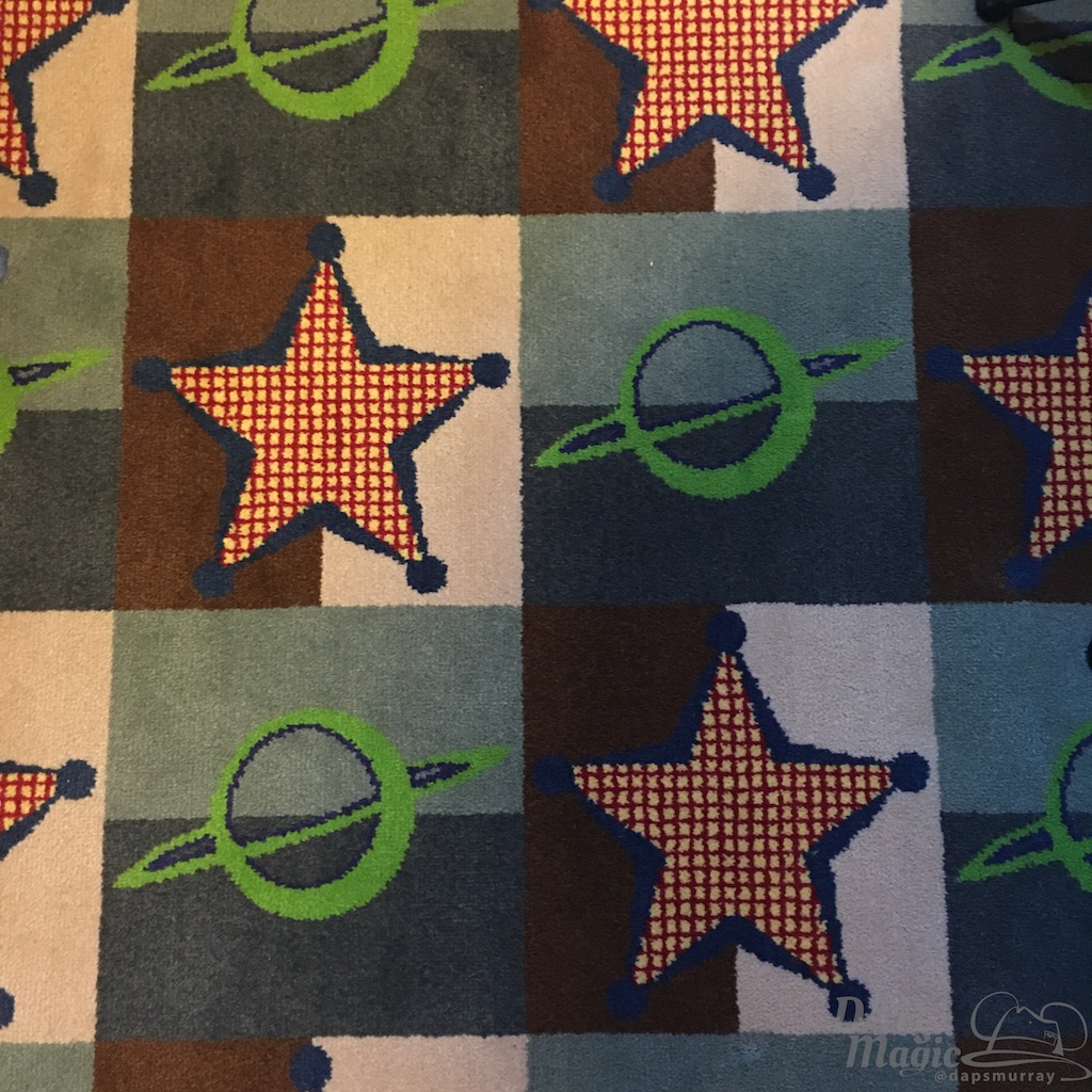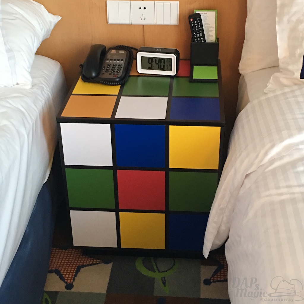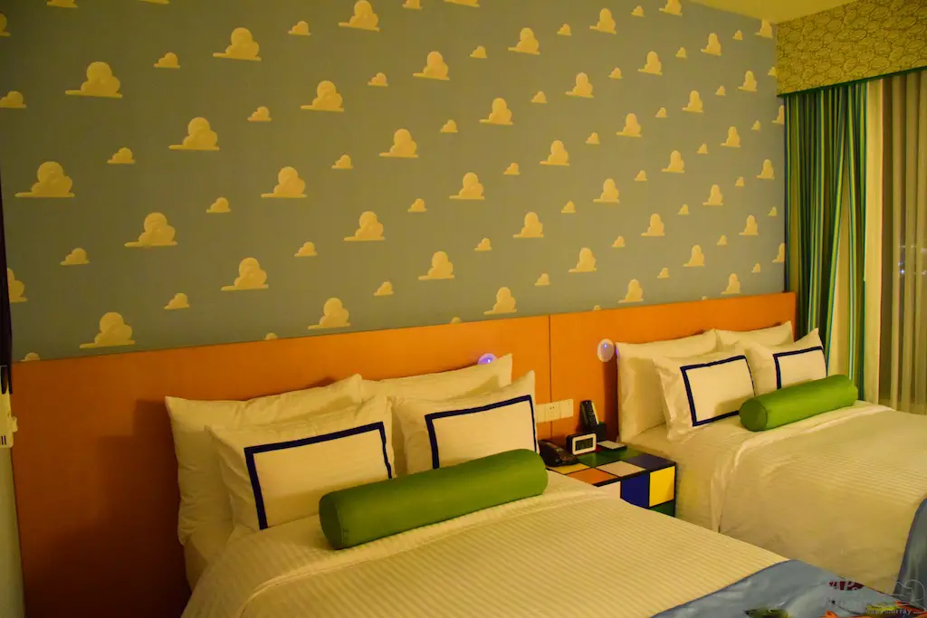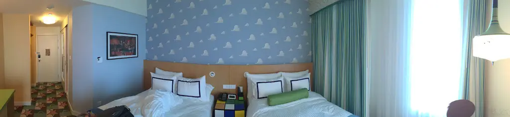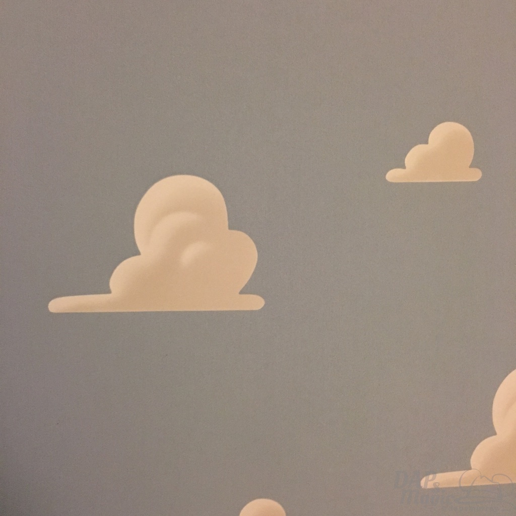 In the room was what I hoped for: A hotel suite fit for Andy and his toys! There were so many parts that payed homage to the franchise. The main light had Slinky Dog running around it. The nightstand was a Rubik’s cube. The bedding looked like what Andy would have. Shower curtains displayed sketches of the famous characters from the movie. And, the wallpaper was the famous blue sky with clouds. It was a fun and dynamic room!