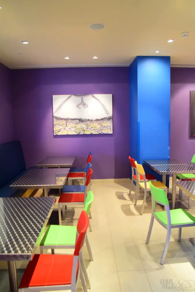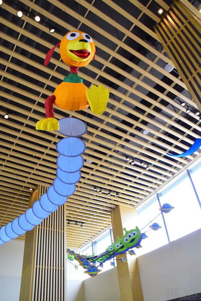 There are two places to grab food and drinks at the hotel. One is the Sunnyside Cafe, and the other is the Sunnyside Market. It may seem like these are one and the same, but the only thing in common is proximity. The Market has pastries as the main items, and a great selection of drinks. It’s more the grab and go for snack options, though a few meal items. The Cafe is the food court type option. It has meals for breakfast, lunch and dinner. Both seemed to share an area to sit down and enjoy the food, but there were more appropriate seats for the Market across from it. Lots of artwork sat on the walls of the dining rooms. Much of it were concept sketches from the films. Overhead were beautiful kites depicting Slinky Dog, an LGM, and a few others from the movies. It was quite colorful and playful for an eating establishment.