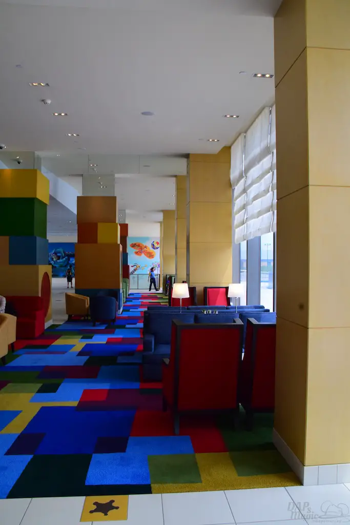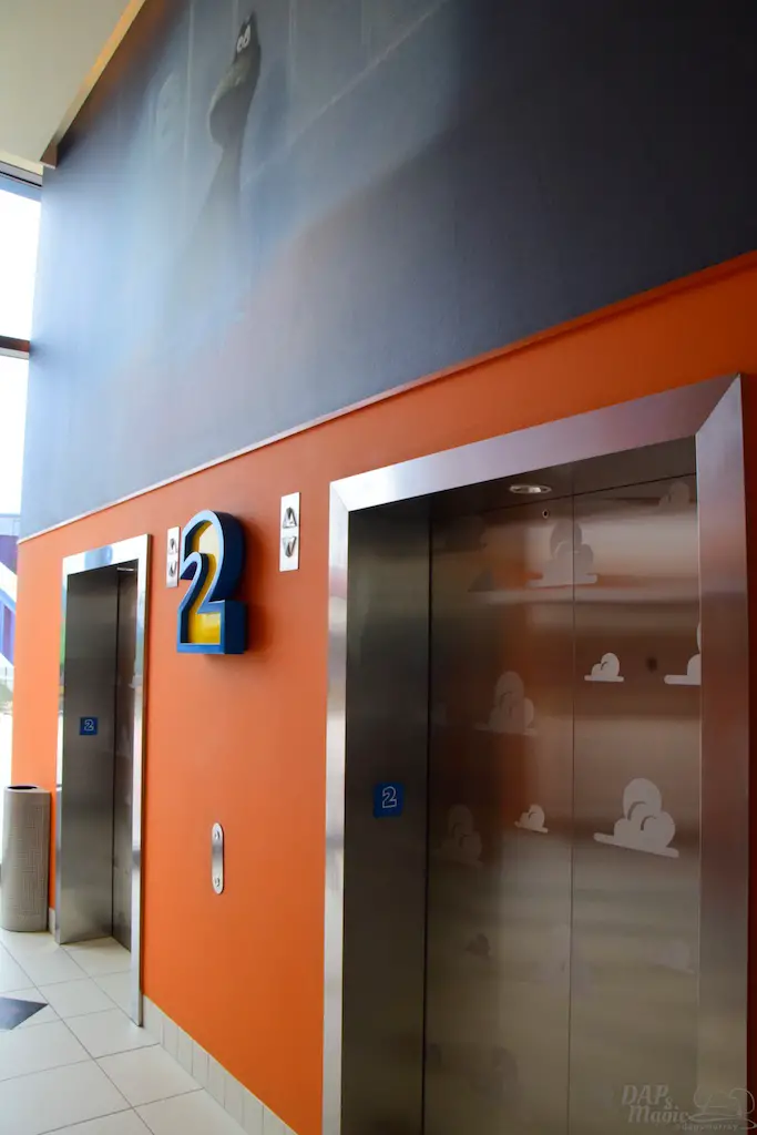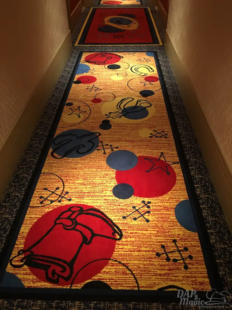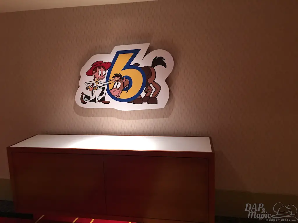 Inside was a colorful lobby with building blocks for posts, tinker toy signs, and several of the Toy Story characters. I will say there was a bit of a line to check-in since I had chosen the park closing as the time to do so. With that, I recommend taking a break from the park to do the check-in if you need to. But, back to the details. Artwork with the characters denoted the appropriate wings. On one end is the Woody and Jessie wing, and the other is the Buzz themed one. The way the hotel doesn’t make you have to walk clear from one end to the other to find rooms is that it’s divided between these two arms of the hotel, with a set of elevators in the middle of each branch. Cast members directed me to the Woody wing, as that was where my room was located…