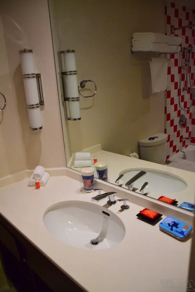 Some of the nice amenities included lights on the headboards. And, there was a nice light the shot up the wallpaper to make it look like a sunrise or sunset depending on the time of day you have it on. Complimentary toiletries, like toothbrushes, were in a miniature Buzz lunchbox. These were all nice touches that made the room sparkle.