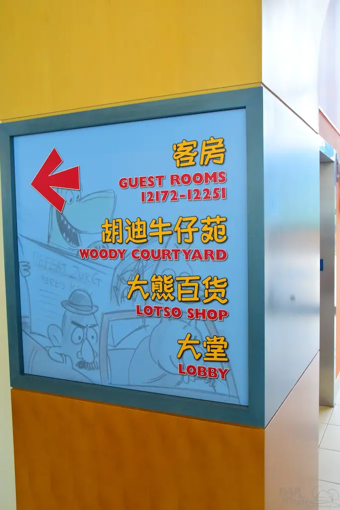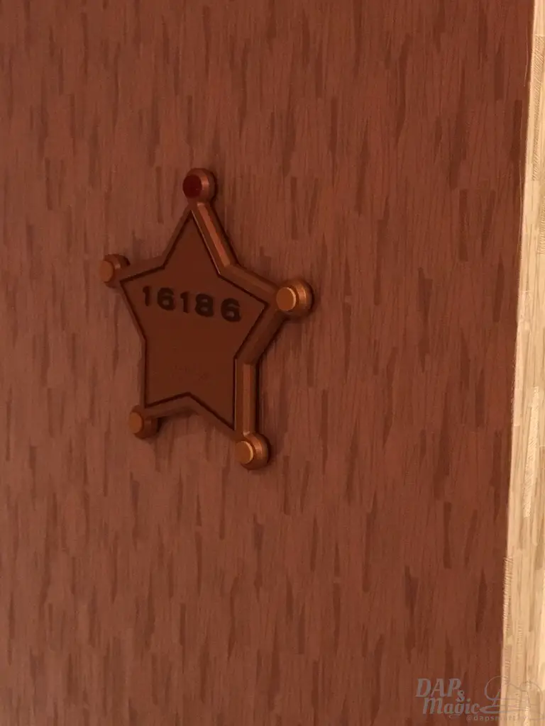 Before getting to the room, I took note of the atmosphere as I went on my way. The elevators spoke the floors, both in Chinese and English. Jessie narrated this wing’s elevator. The hallway had earthy brown tone to it, which fit the sienna based cowboy color palette of Woody and Jessie. Door numbers were located on sheriff stars. Kid print horseshoes and stars were on the carpet. It wasn’t too child-like, but very child-friendly to get to the room.