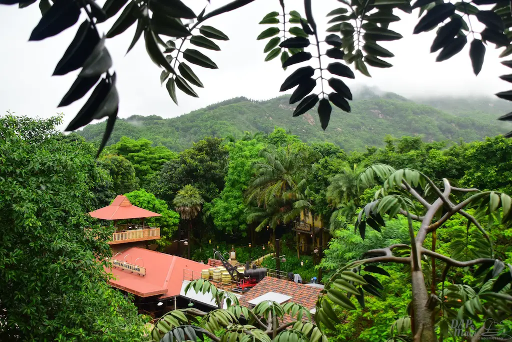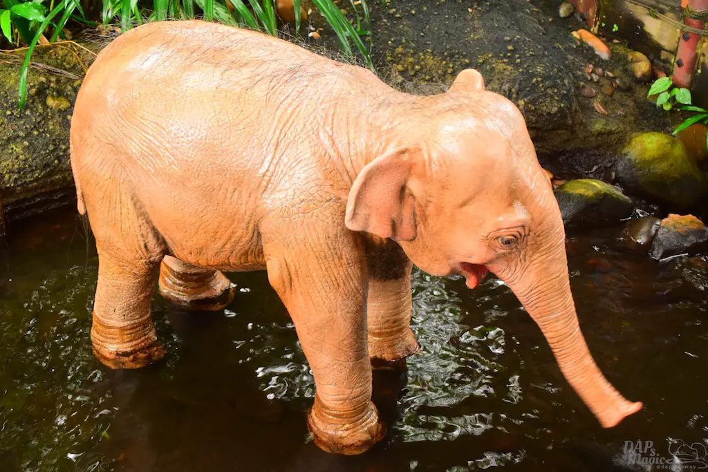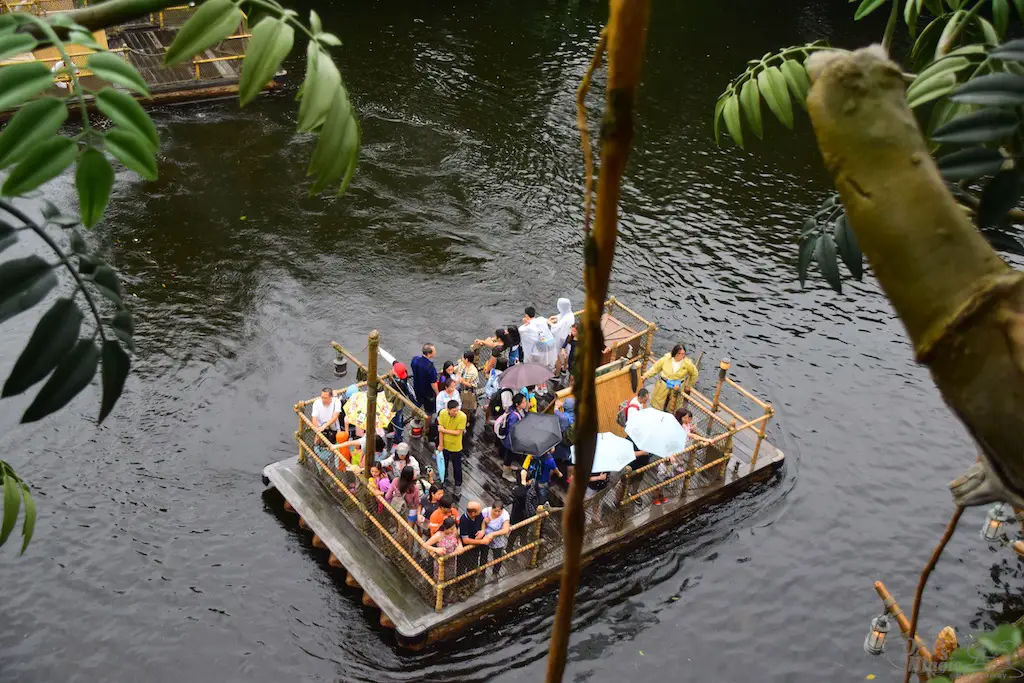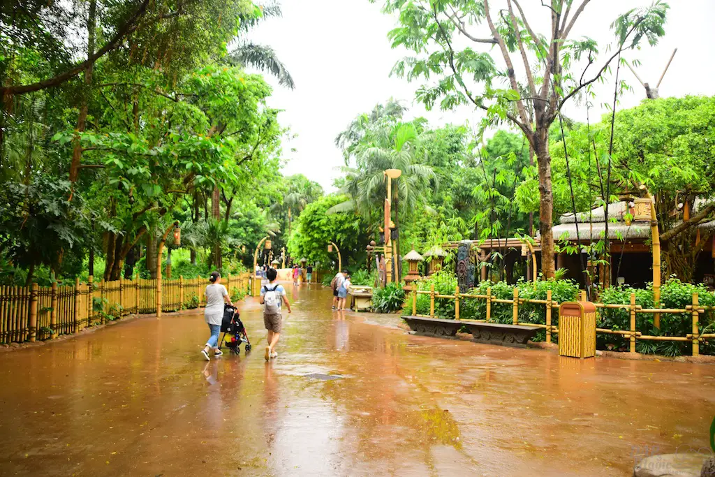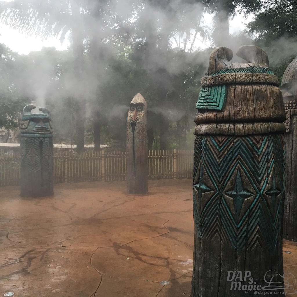 One thing marked as an attraction, but not what you would expect, is the Leaky Tikis. In the States we’re used to something like this being just a feature of a land, but not an attraction. In Hong Kong, a fountain water play area is an attraction. The reason? It gets very very hot on the island. I can attest to that. So, water spouting tiki statues are a great experience to have on the many hot days. Though they are tikis, there aren’t any birds that sing words. This both serves as an homage and the one tiki attraction in the land.