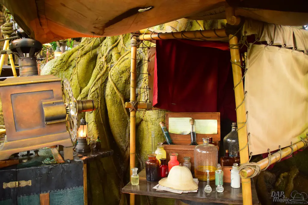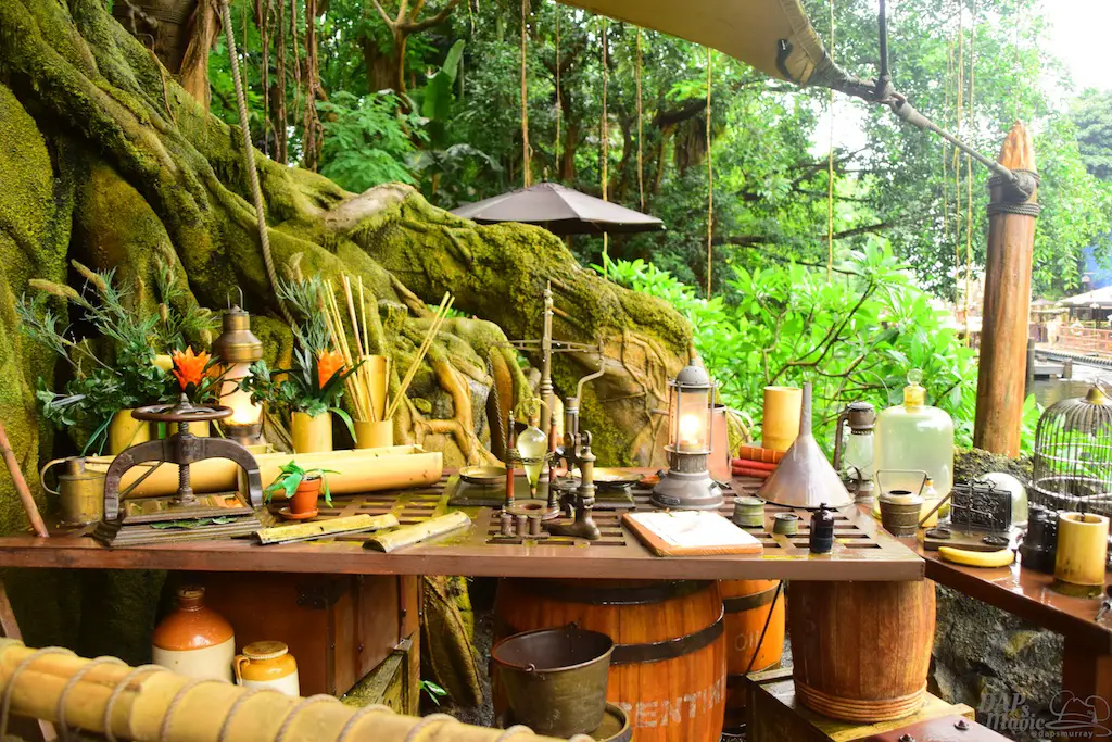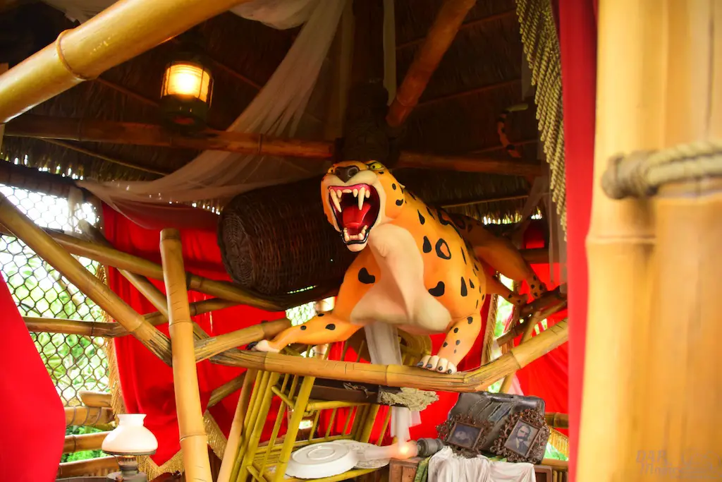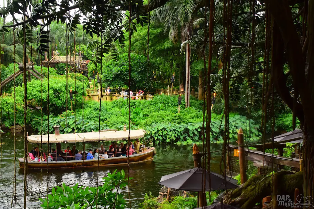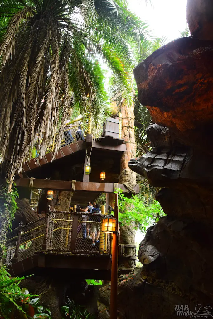 One of the big characteristics of this Adventureland is the large river that takes up most of the area. There are two attractions nestled in it: Jungle River Cruise and Tarzan’s Treehouse.