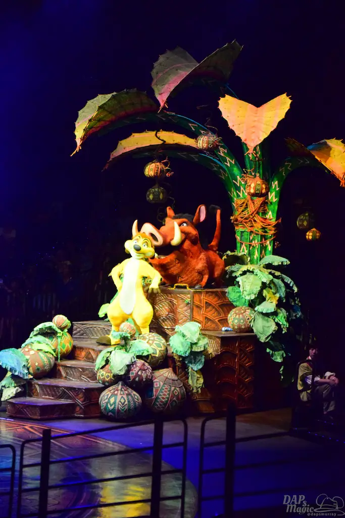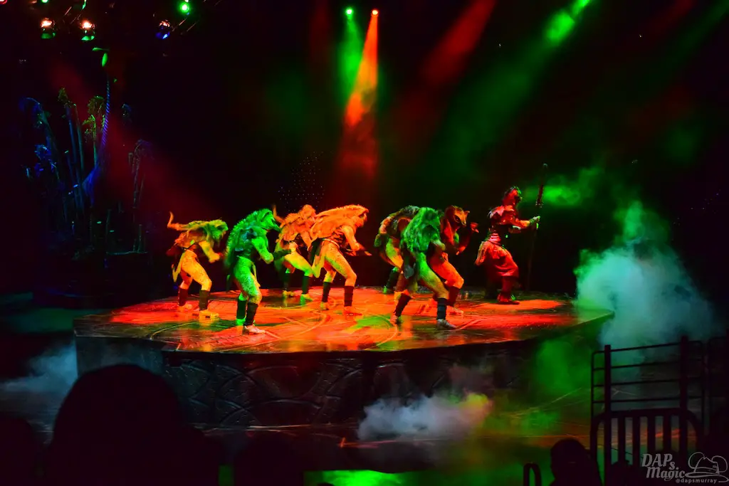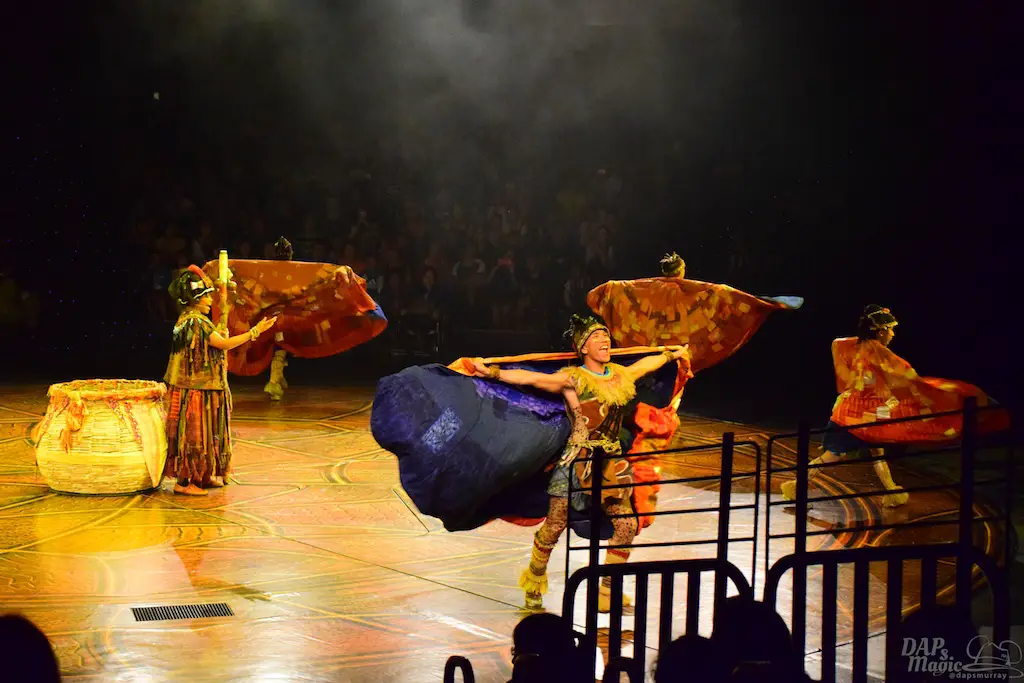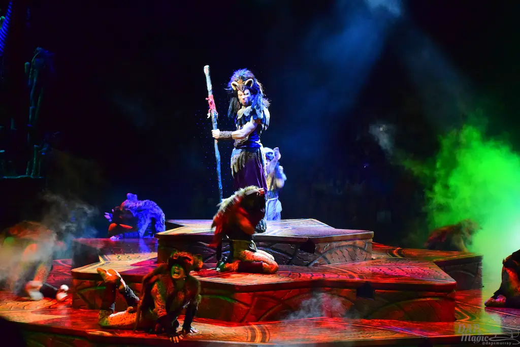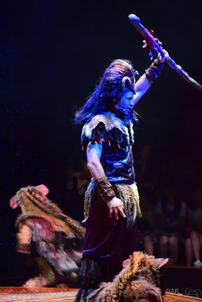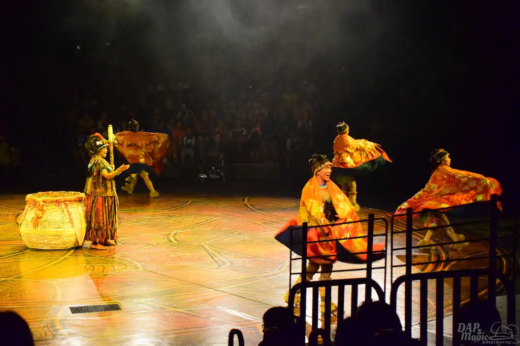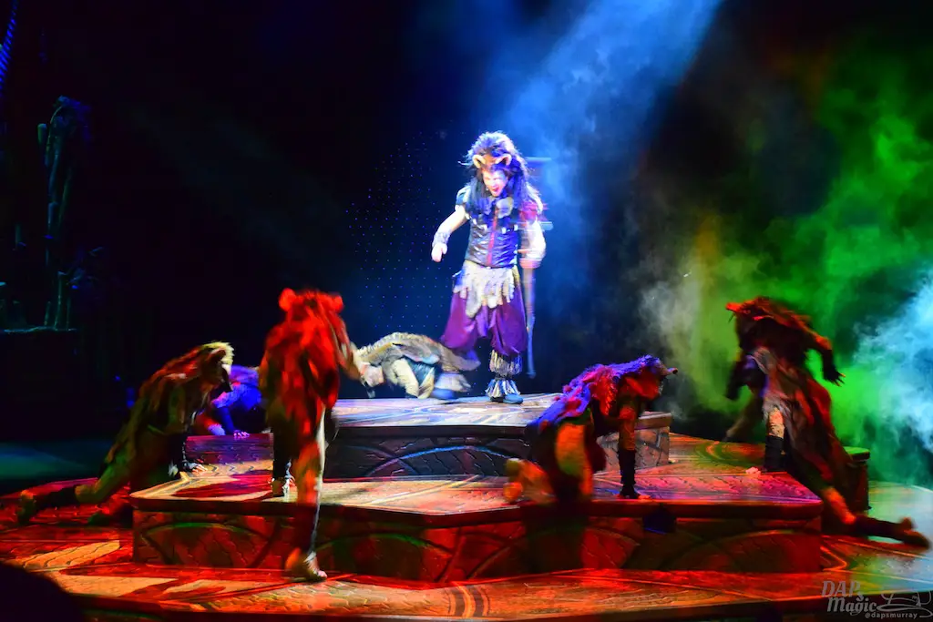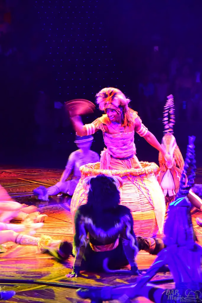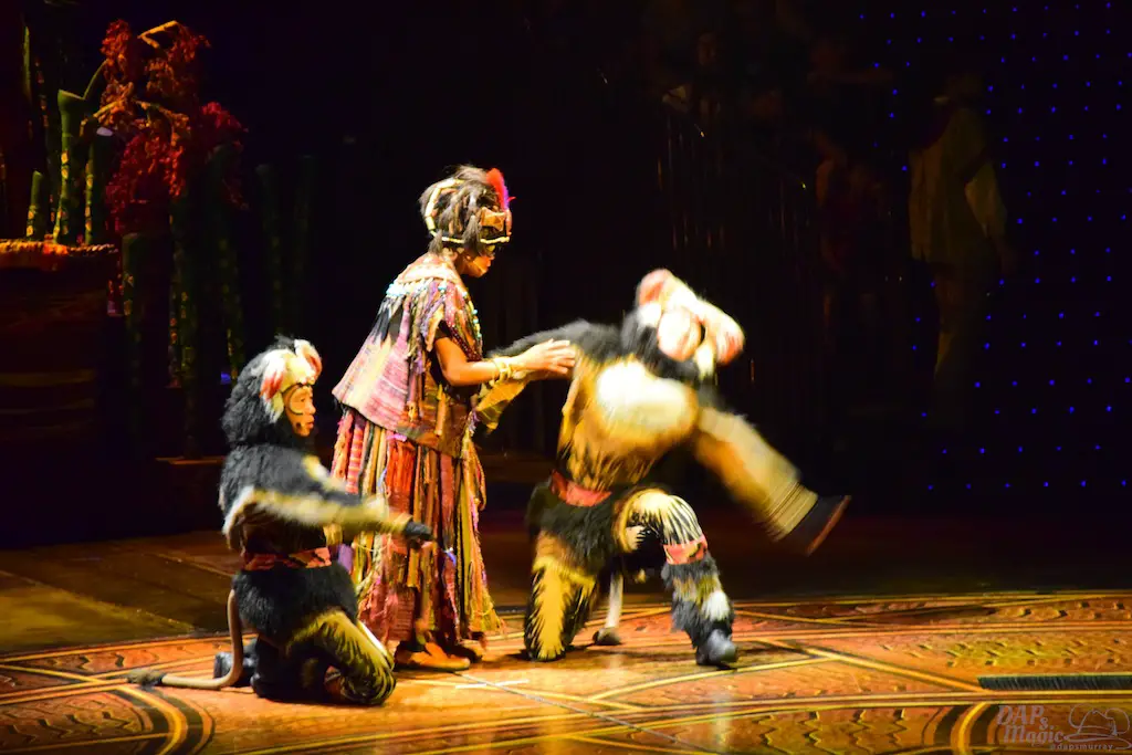 And, here’s where things differ. There’s a linear plot for the show, and some acts have the same performances as the Florida show, they are all about the telling of the movie plot. Musical numbers take place with the songs from the film. The main 4 performers are each cast as the main characters – Simba, Nala, Scar and Rafiki. Timon is present to fulfill his role.