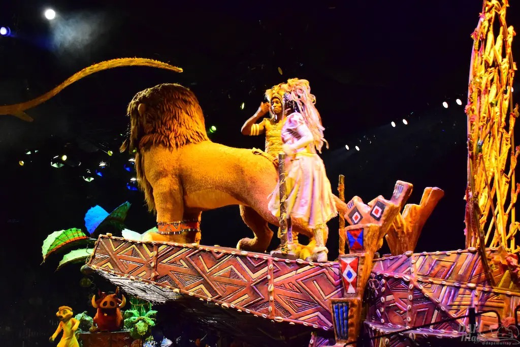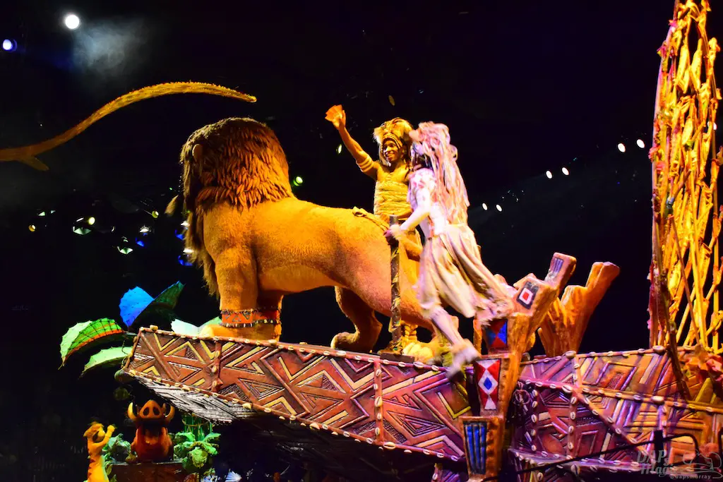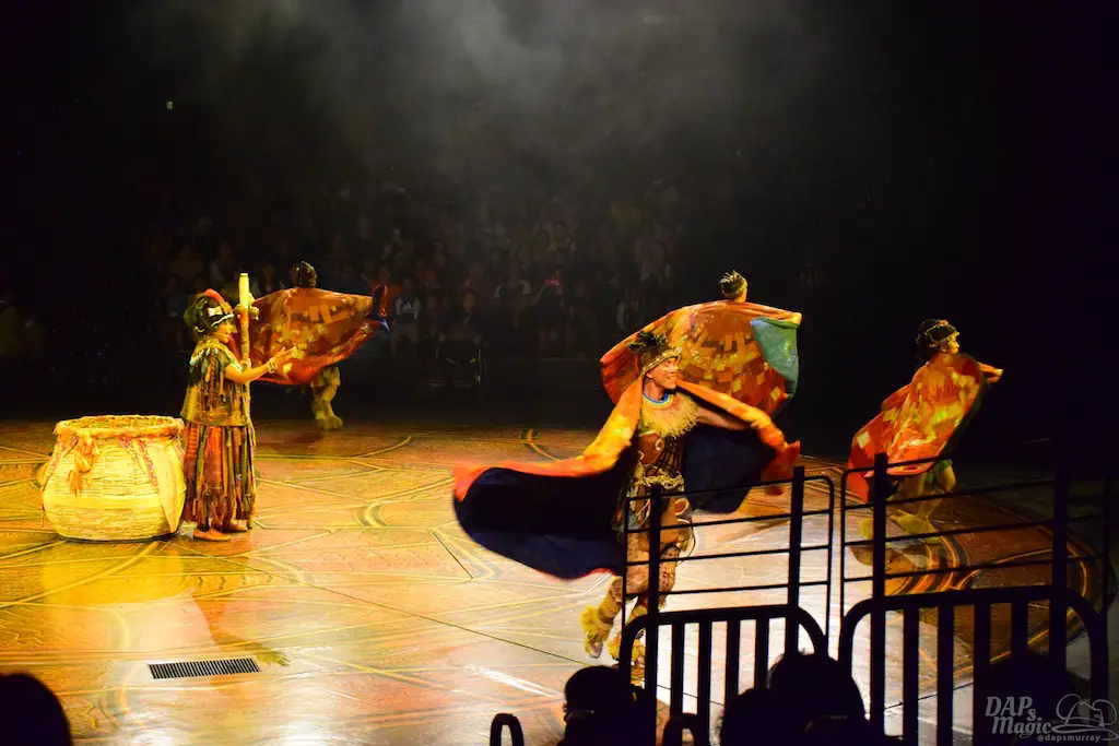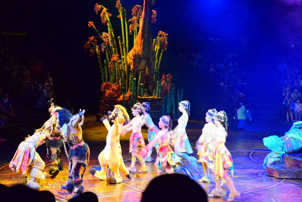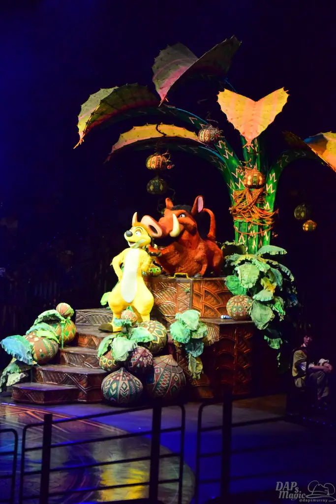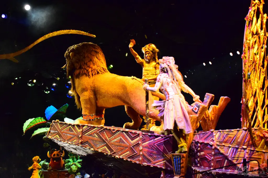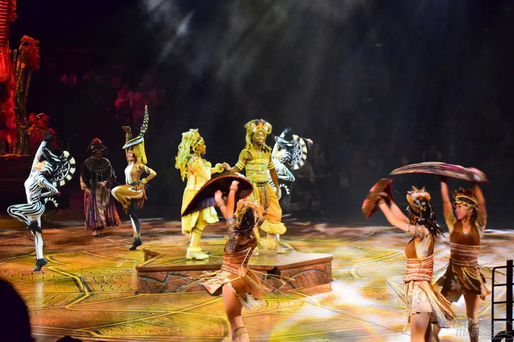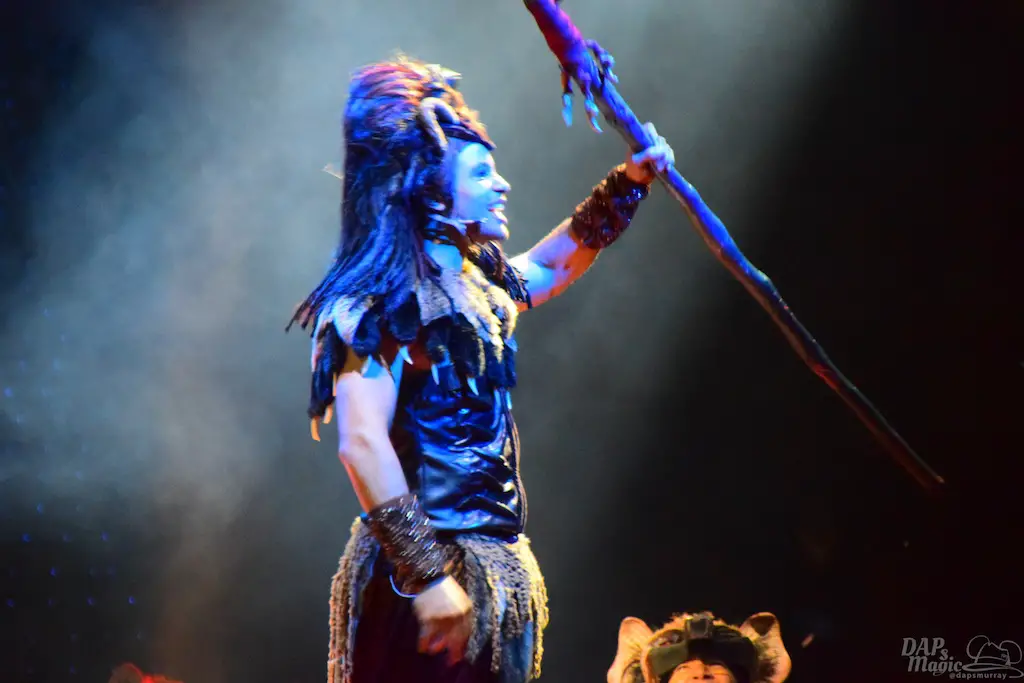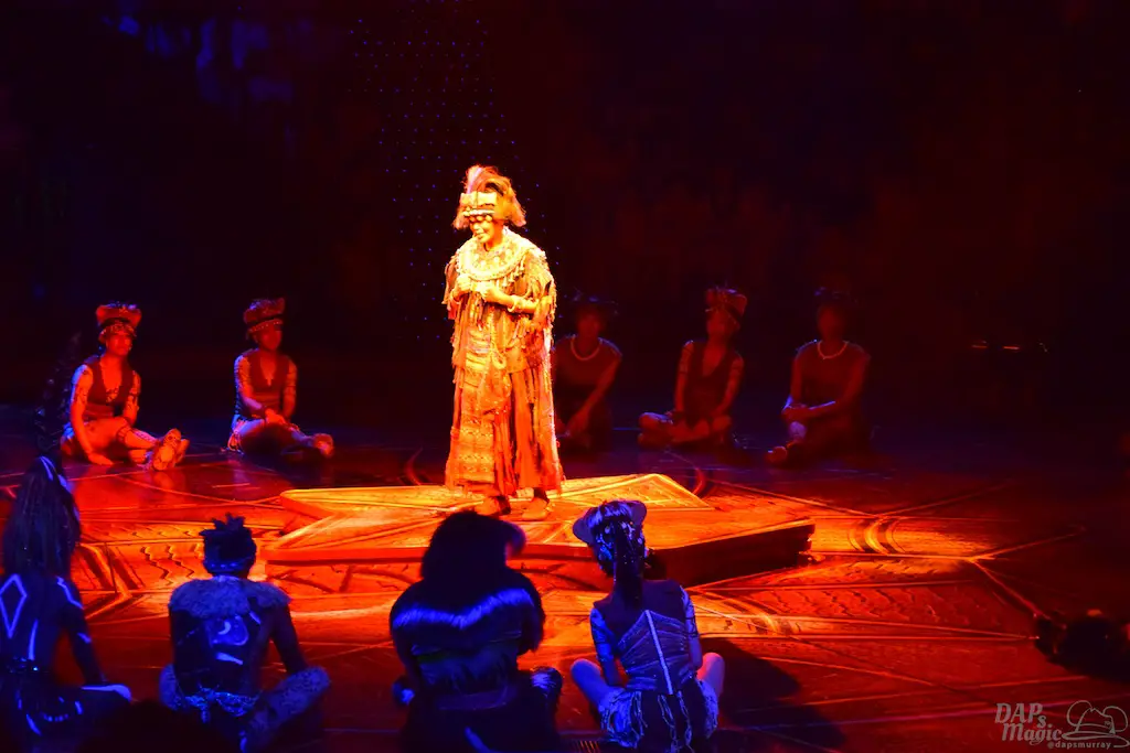 And, here’s where things differ. There’s a linear plot for the show, and some acts have the same performances as the Florida show, they are all about the telling of the movie plot. Musical numbers take place with the songs from the film. The main 4 performers are each cast as the main characters – Simba, Nala, Scar and Rafiki. Timon is present to fulfill his role.
