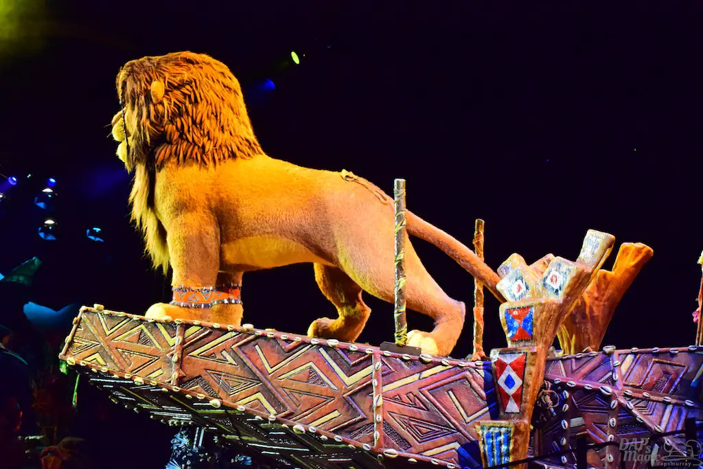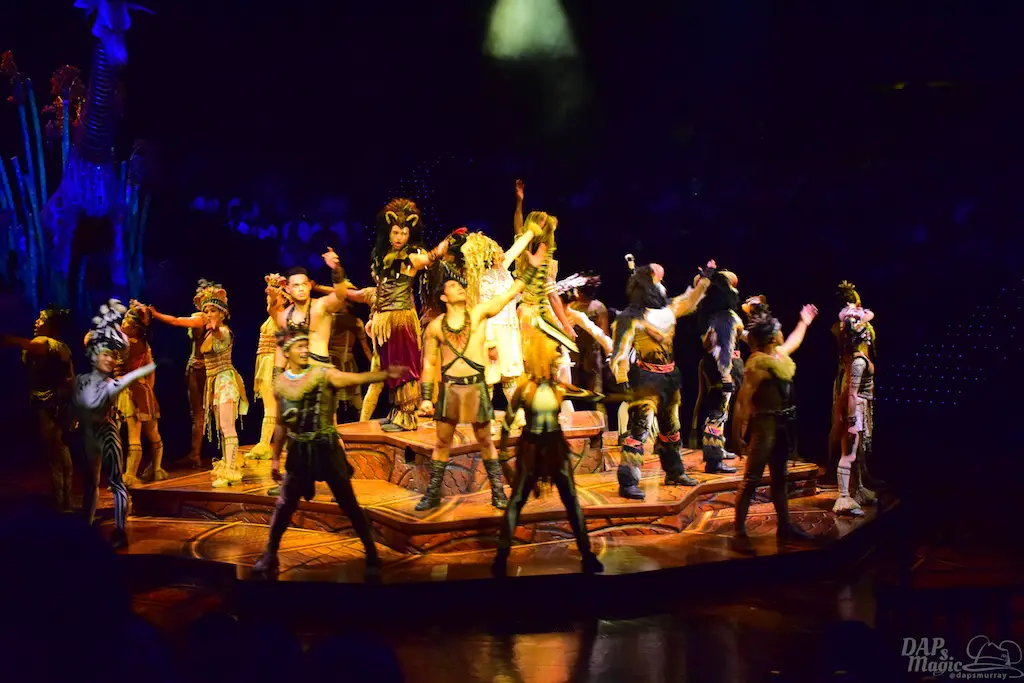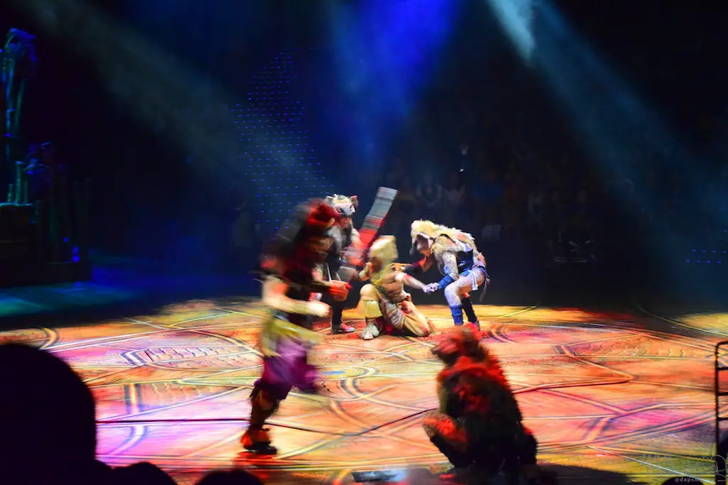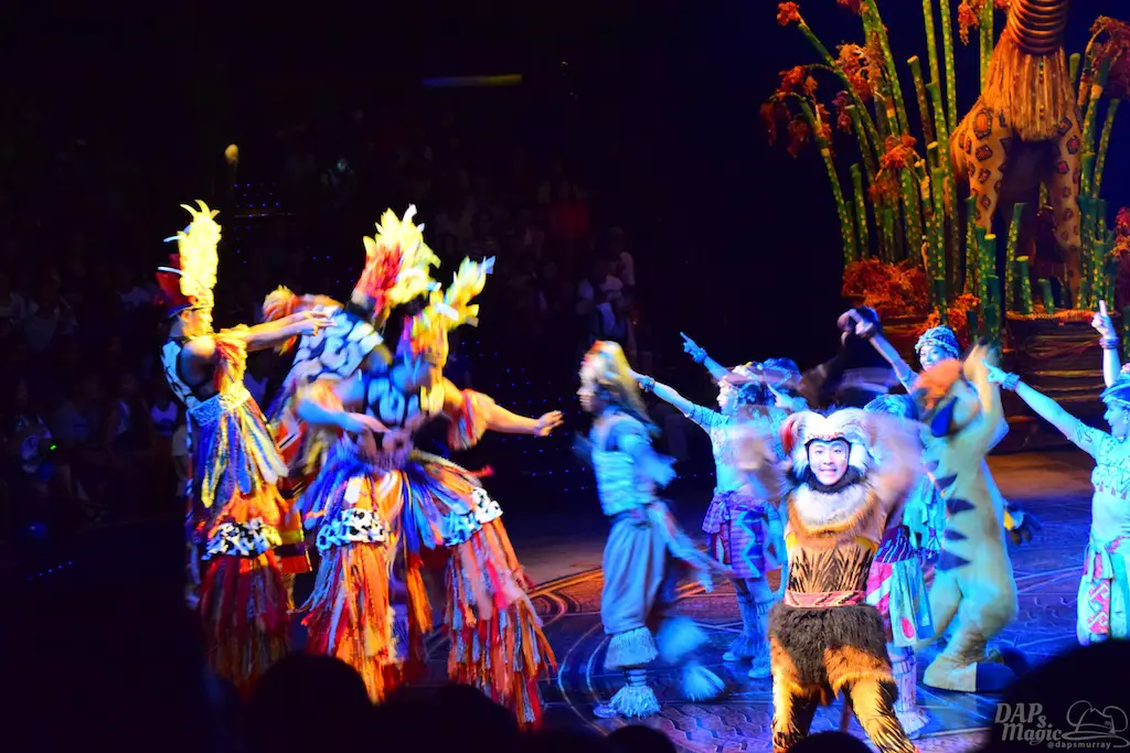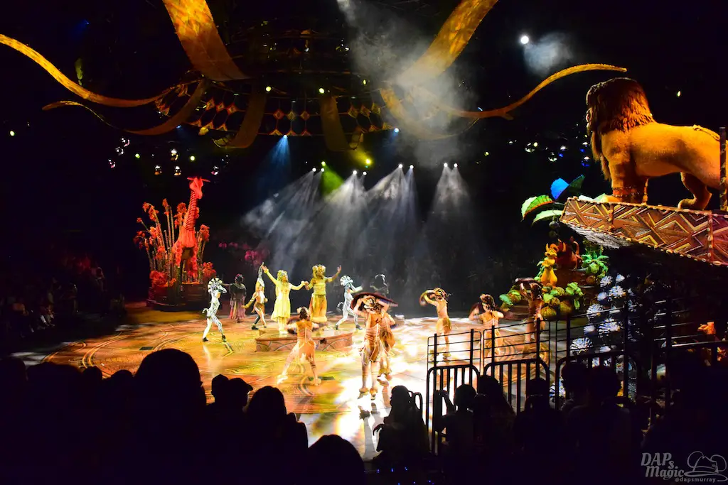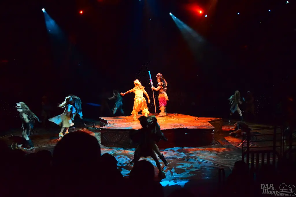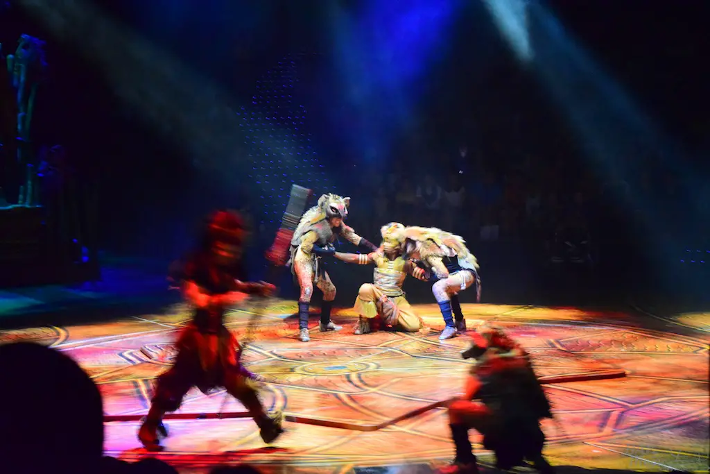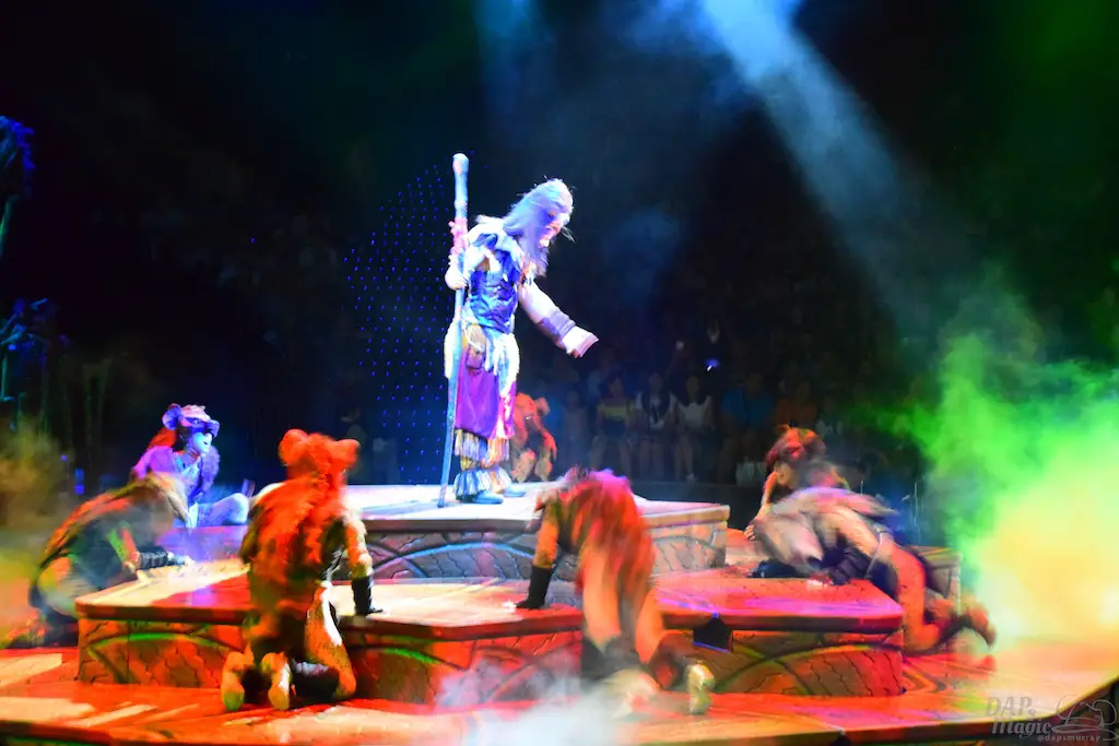 And, here’s where things differ. There’s a linear plot for the show, and some acts have the same performances as the Florida show, they are all about the telling of the movie plot. Musical numbers take place with the songs from the film. The main 4 performers are each cast as the main characters – Simba, Nala, Scar and Rafiki. Timon is present to fulfill his role.
