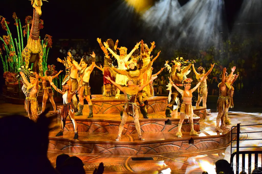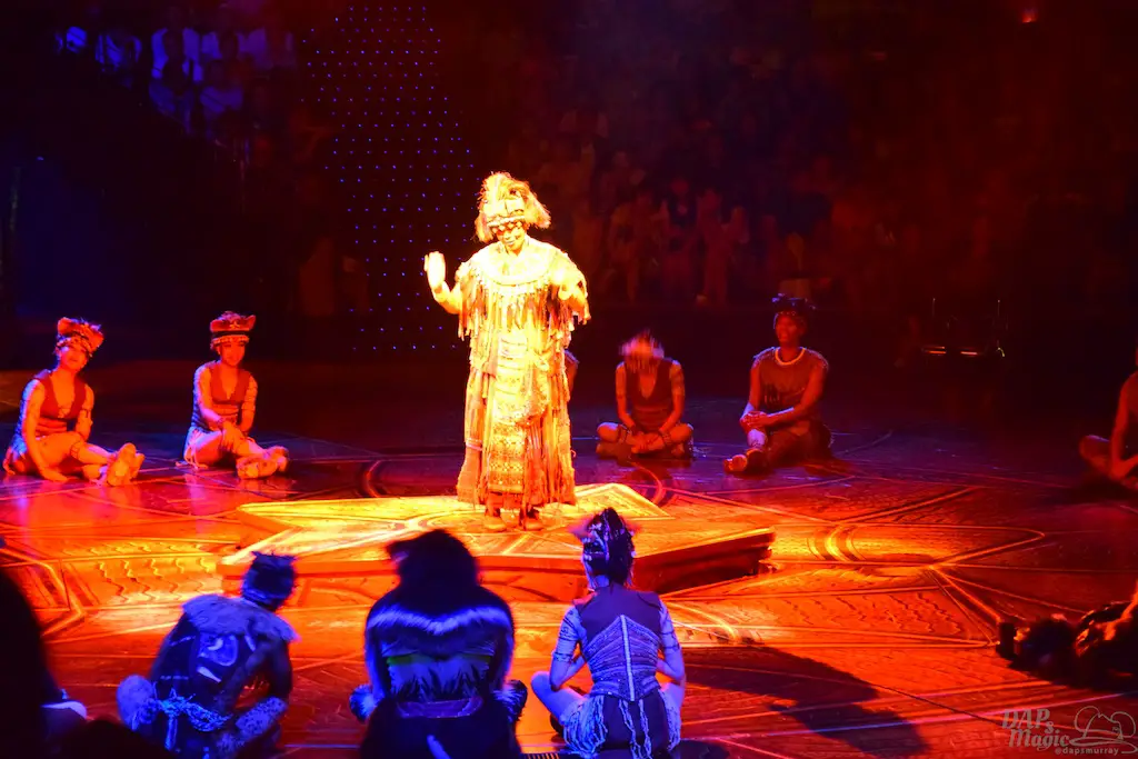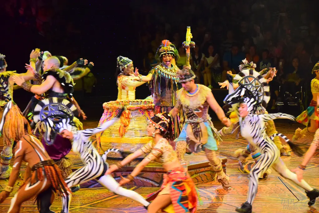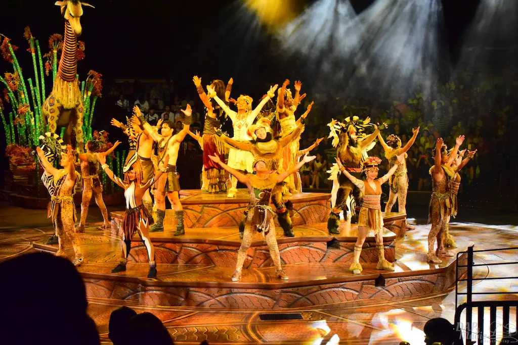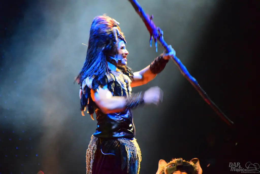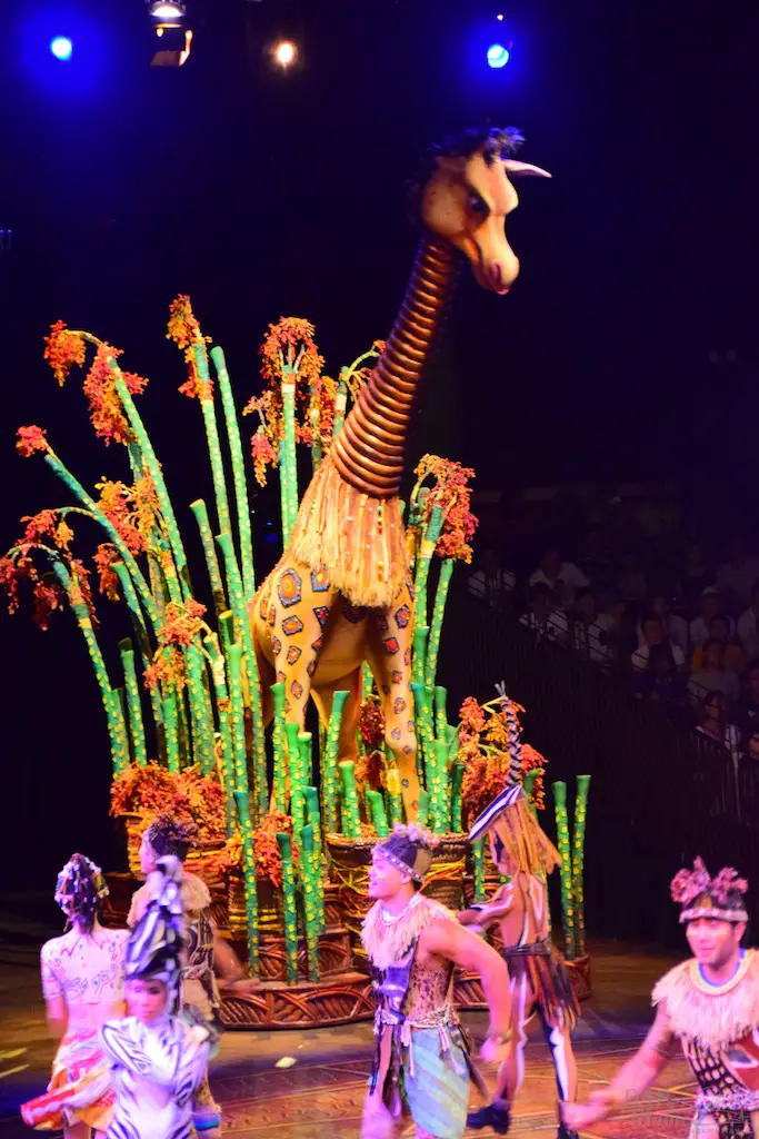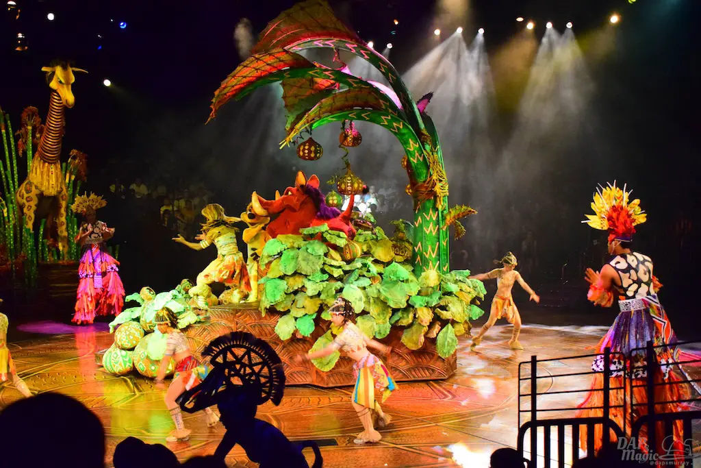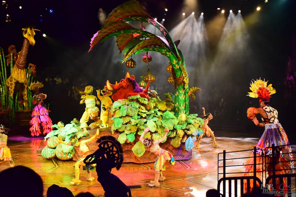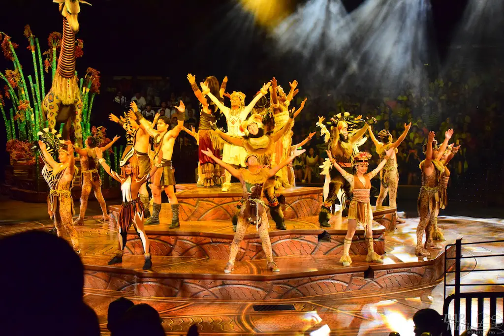 And, here’s where things differ. There’s a linear plot for the show, and some acts have the same performances as the Florida show, they are all about the telling of the movie plot. Musical numbers take place with the songs from the film. The main 4 performers are each cast as the main characters – Simba, Nala, Scar and Rafiki. Timon is present to fulfill his role.