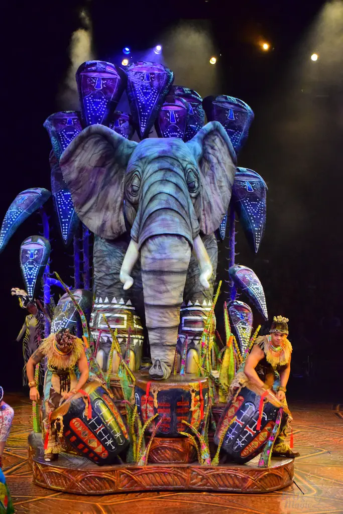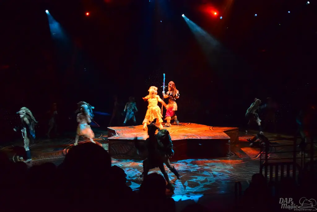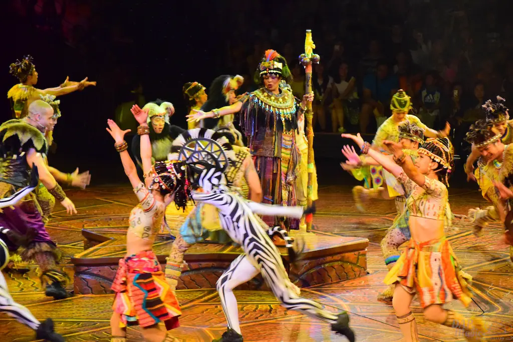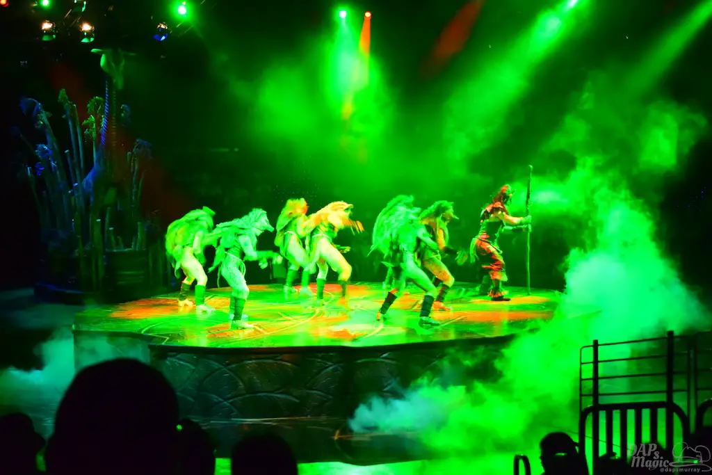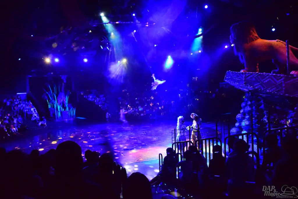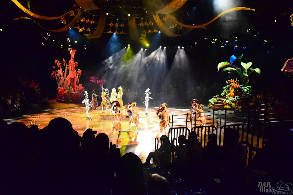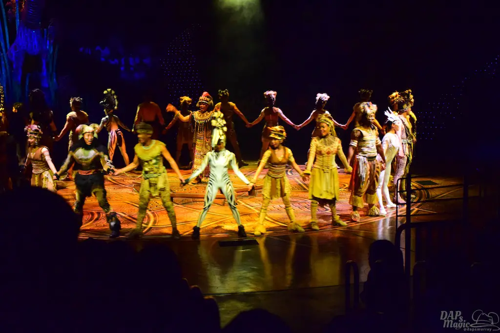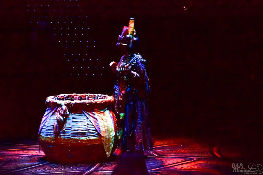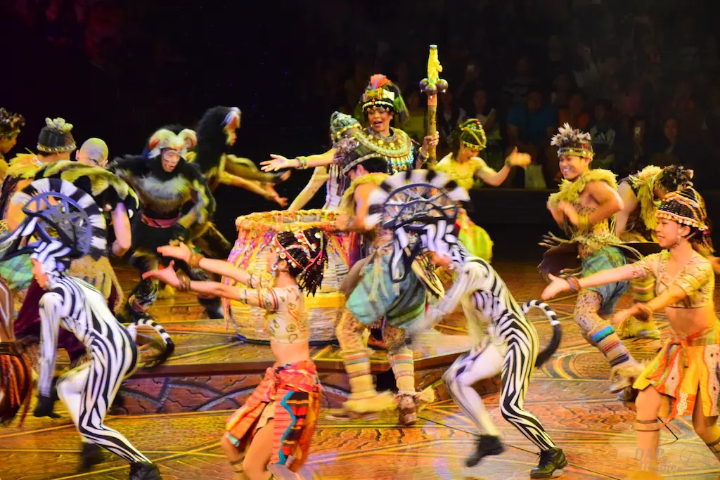 And, here’s where things differ. There’s a linear plot for the show, and some acts have the same performances as the Florida show, they are all about the telling of the movie plot. Musical numbers take place with the songs from the film. The main 4 performers are each cast as the main characters – Simba, Nala, Scar and Rafiki. Timon is present to fulfill his role.