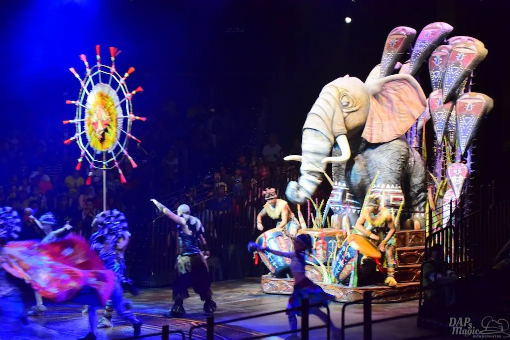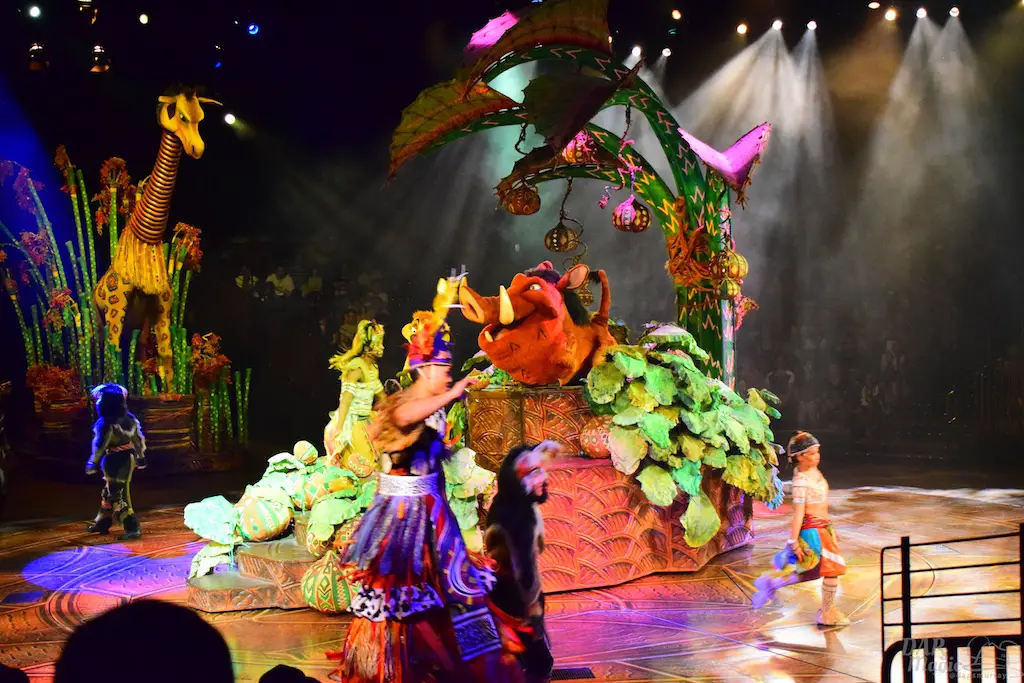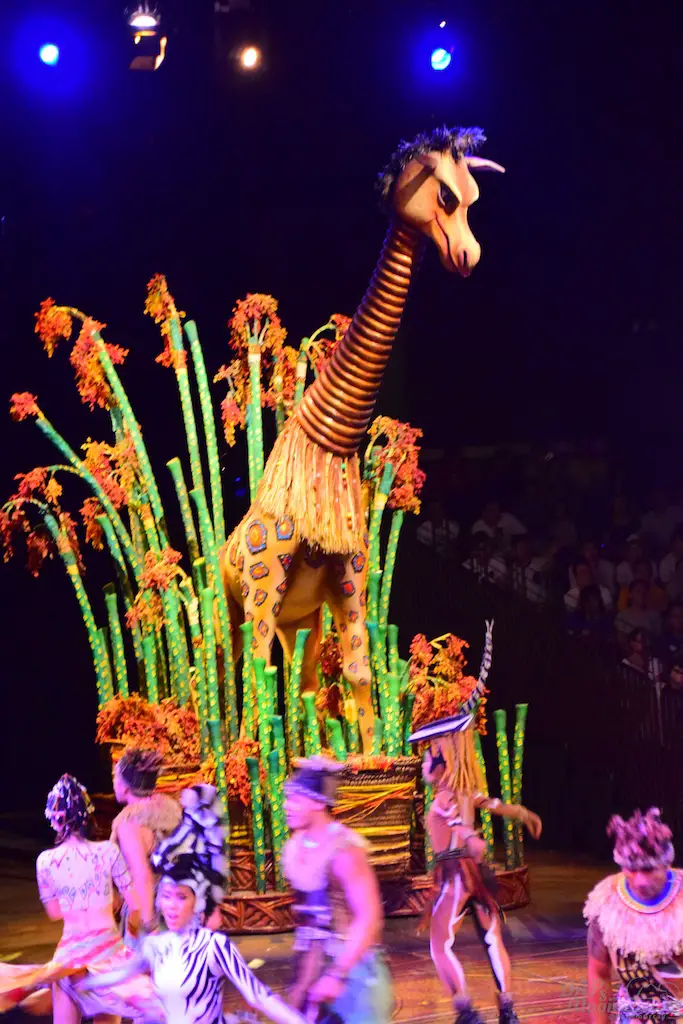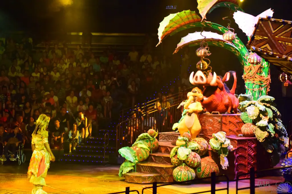 First, what is similar are floats that have animal characters from the movie. Simba is aboard one, Pumbaa on another, and a cartoon giraffe and elephant round out the other two. They are seated between the audience seats, as they are in the Animal Kingdom version. A group of performers are still the storytellers, and it does all center around celebrating Simba’s reign as king. But, instead of a few performances of various acts, the group will recall the story of the Lion King.