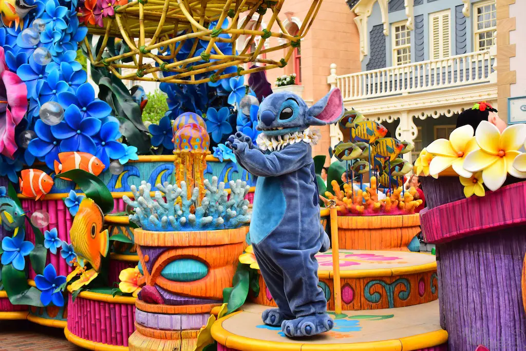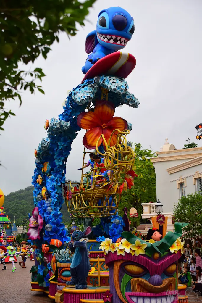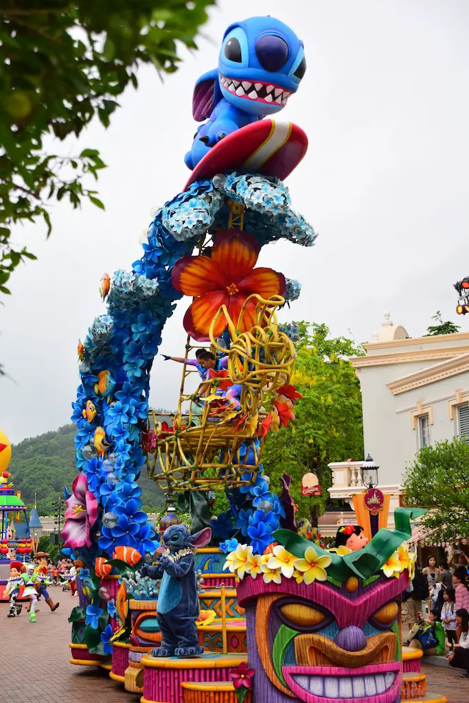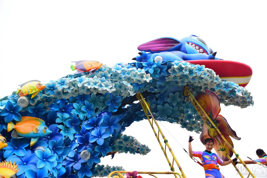 Tinkerbell and the fairies of Neverland have their own airship float. Lady bug cars let the fairies travel in style. Right behind them is a Hawaiian themed float with a large Stitch riding a wave atop it. Tiki masks sit under him, and a live Stitch greets those along the route.
