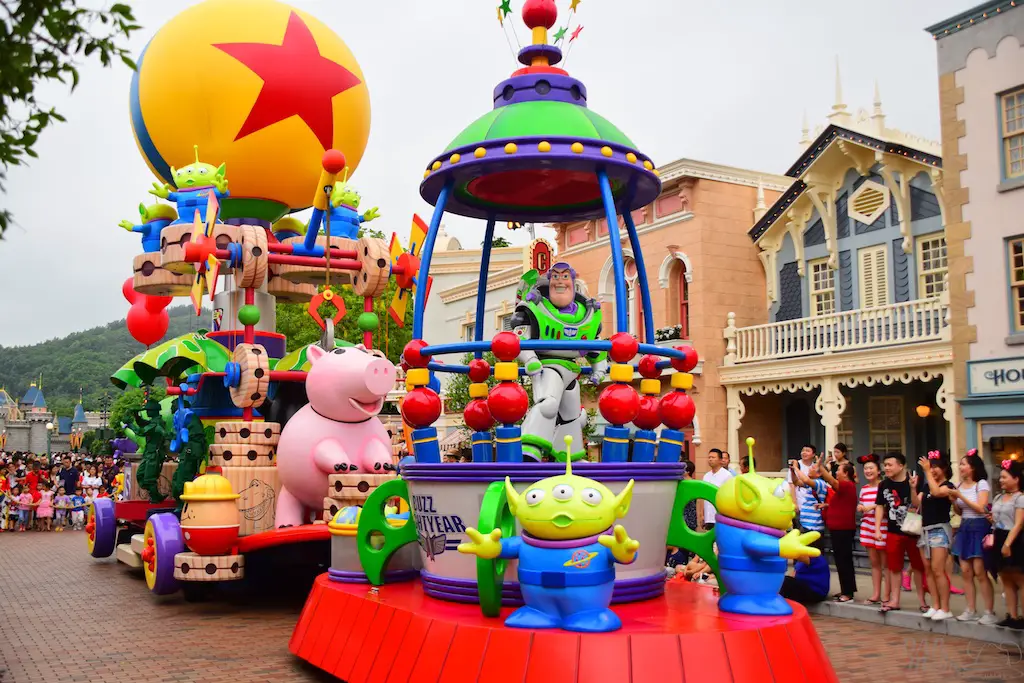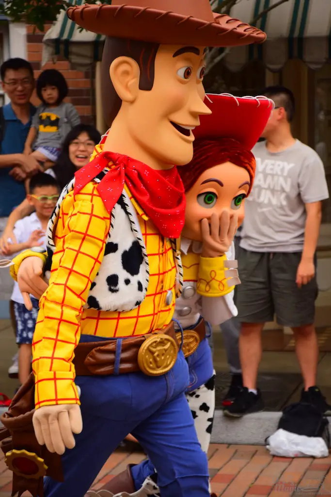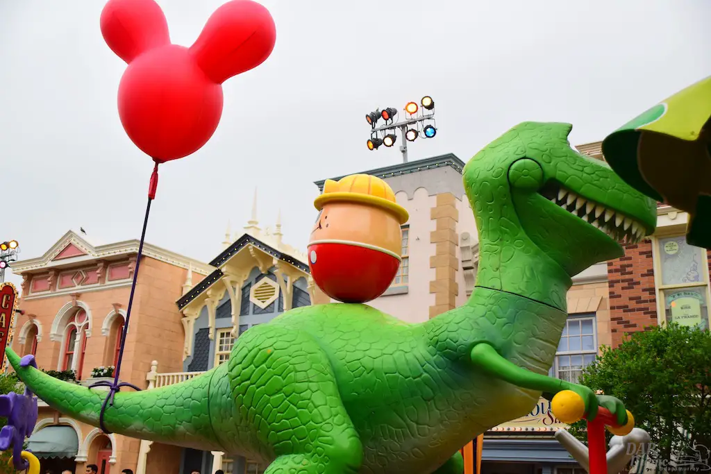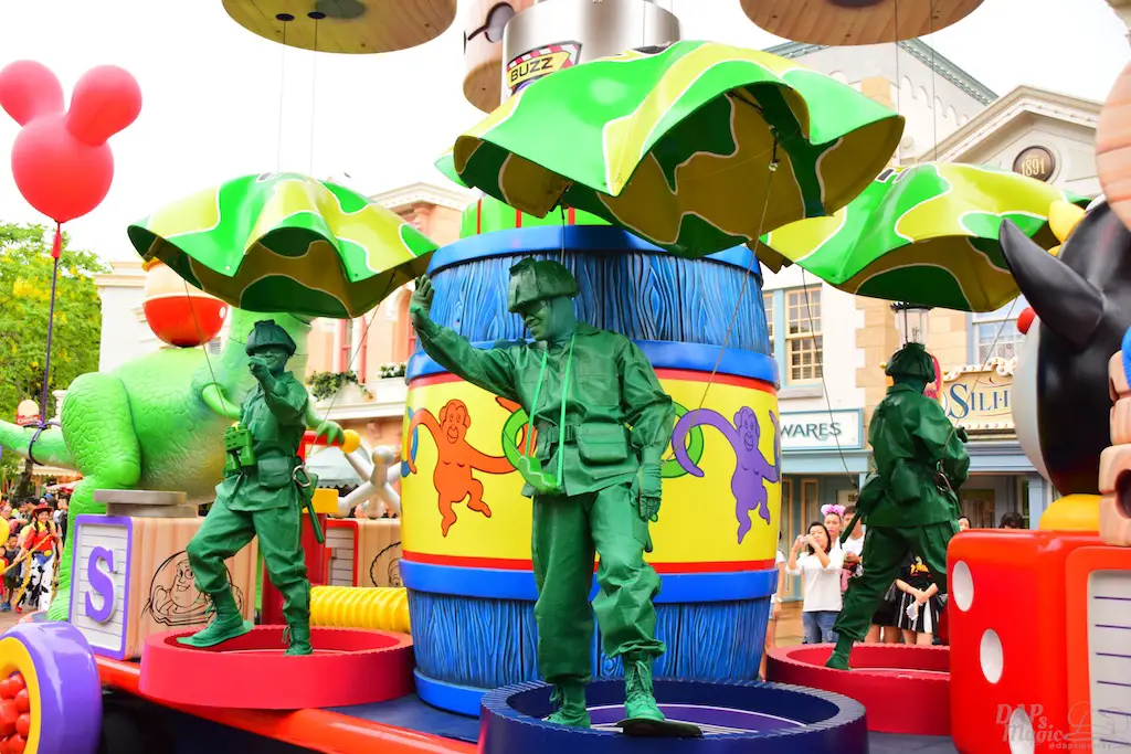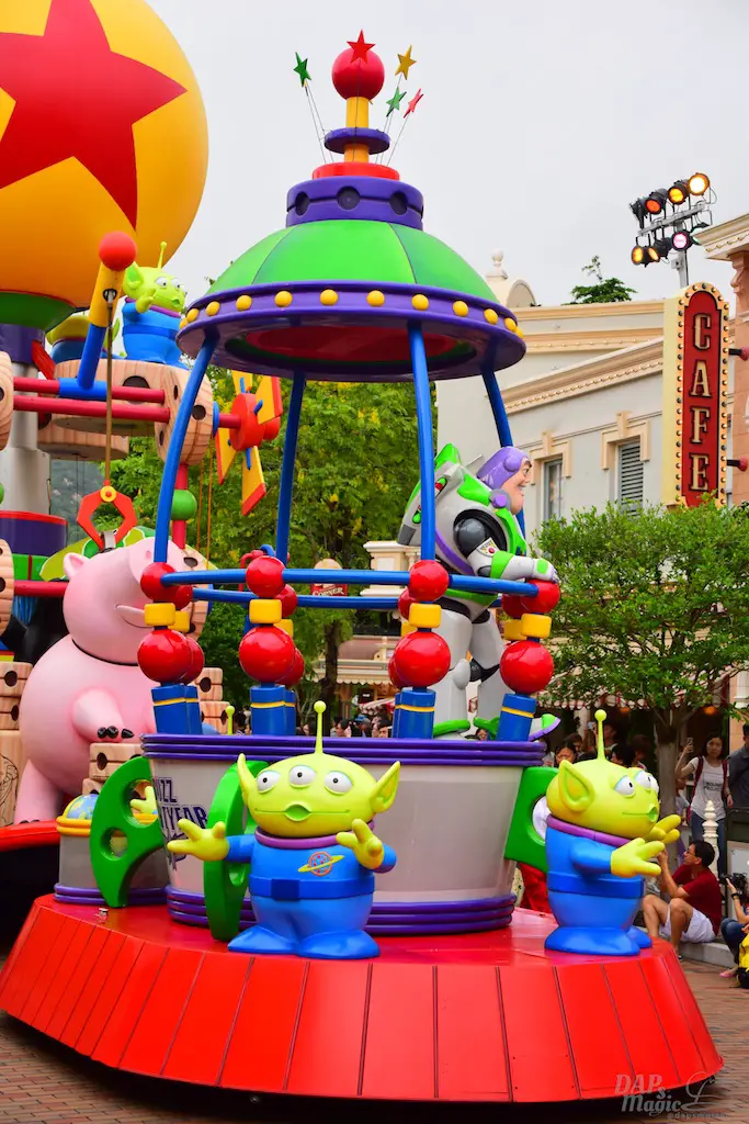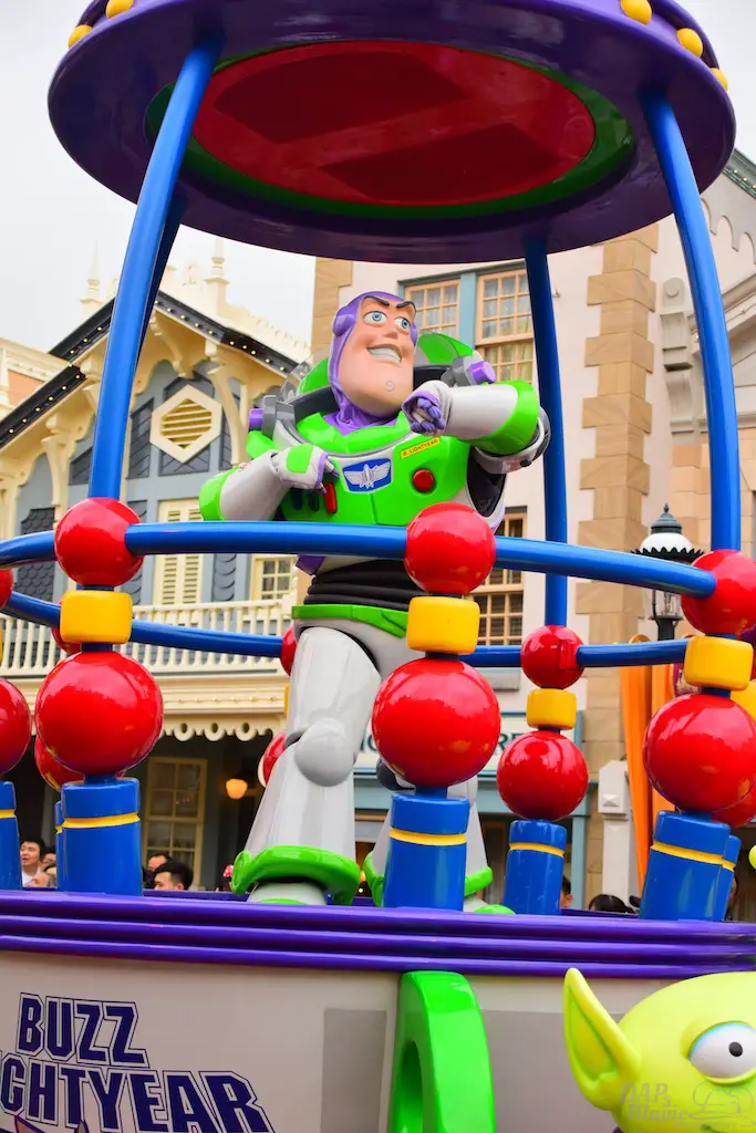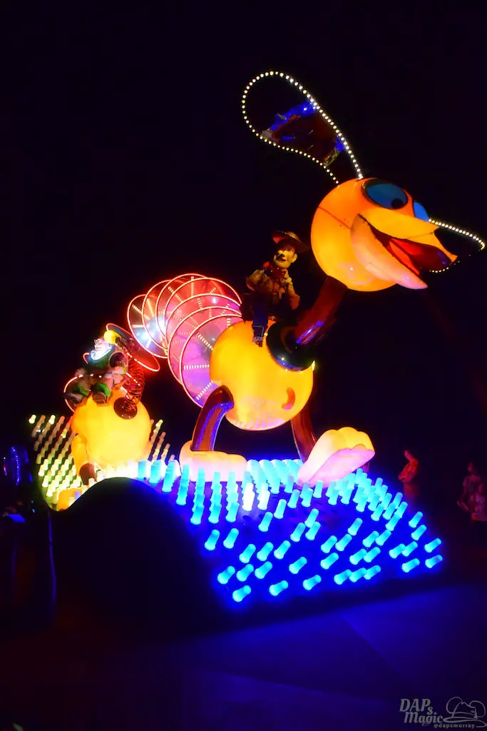 Finishing the parade is a Toy Story unit with Buzz in front in a space themed barge. Woody and Jessie are out front walking along the parade journey. Many of the other Toy Story favorites are in this section, with many toy props.