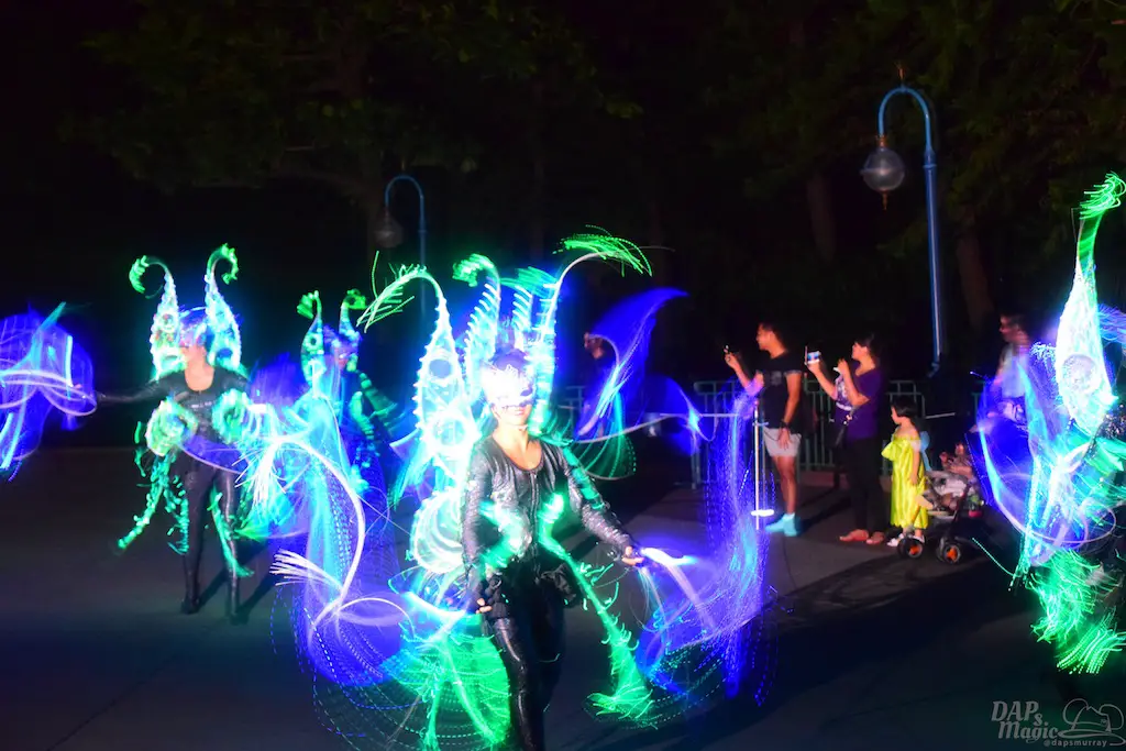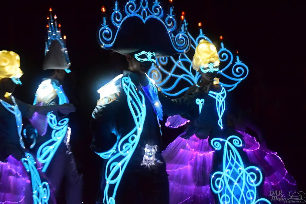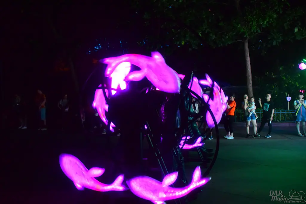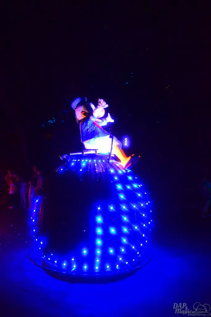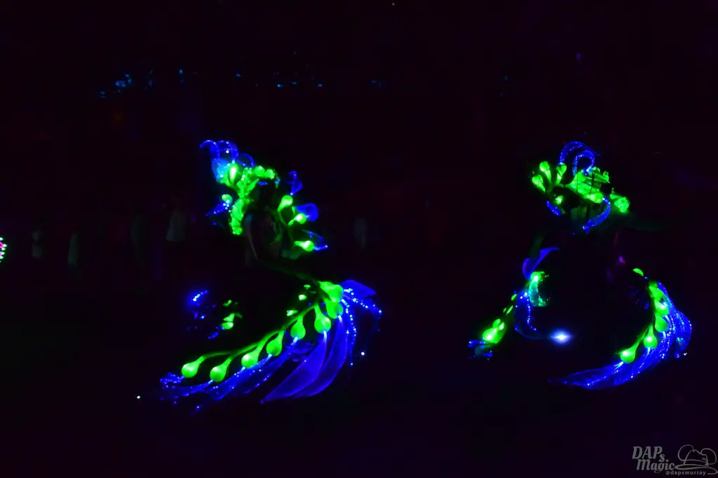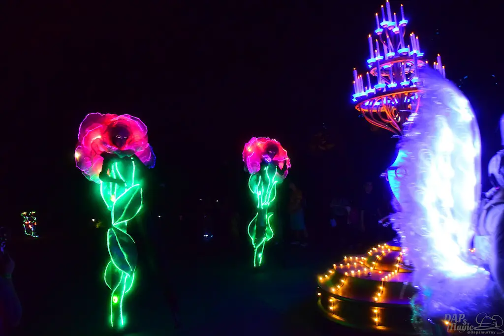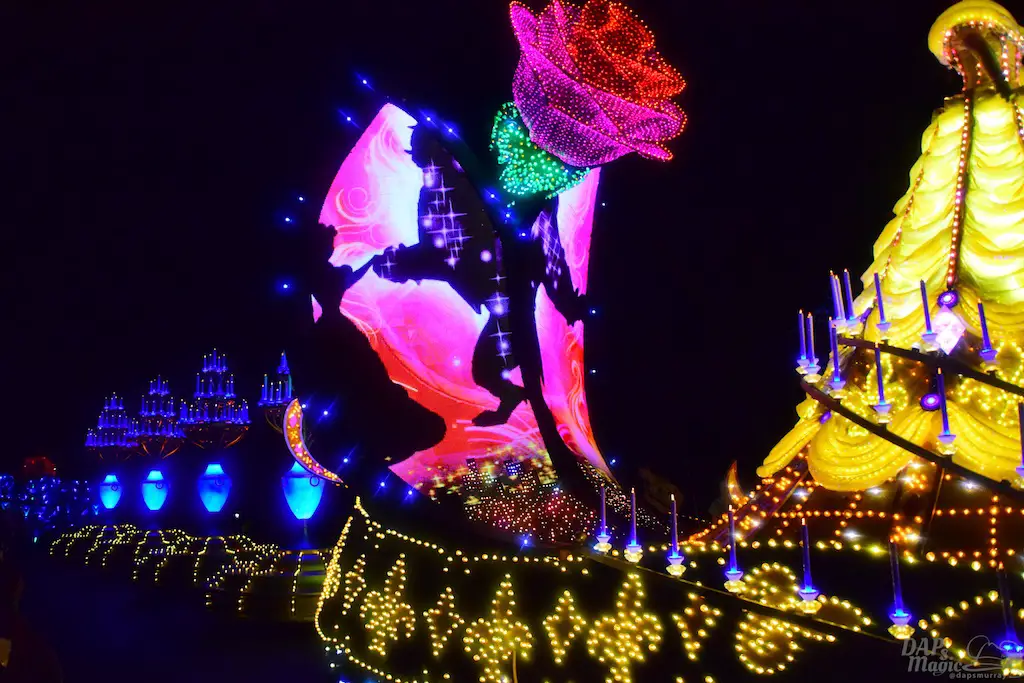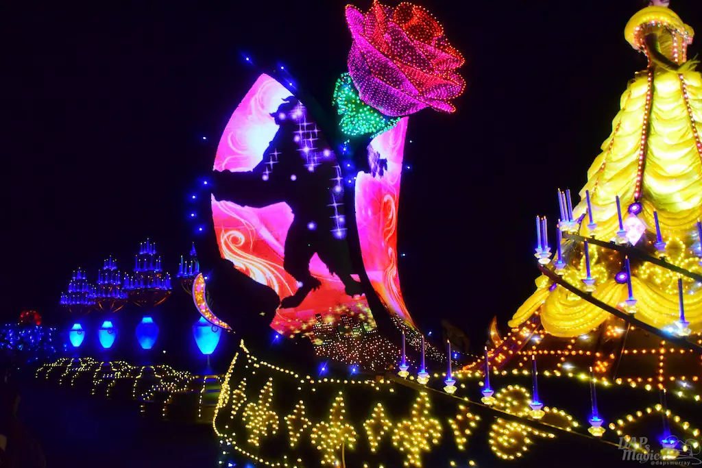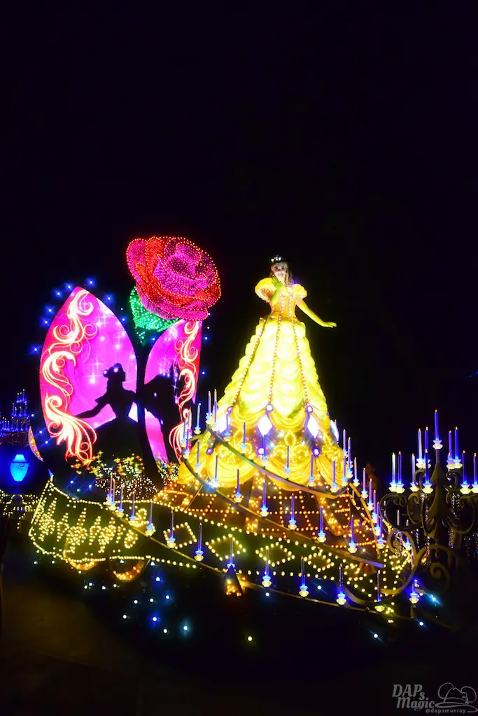 Tinkerbell is a solo float. Peter Pan and the large drum are not attached. Magical strands are attached in the rear of the funnel like float. For the Little Mermaid float, the performers before it have more of a variety to them. The colors are a little different than the one in California, and there’s some kelp dress adorned dancers. Instead of jellyfish and Nemo behind it there are fish that circle around walkers. Subtle color differences make up the ballroom dancers for Belle’s unit. The big difference, though, is that she isn’t dragging along smaller floats with Rapunzel and Cinderella. Candelabras are being dragged instead, and tall roses walk along. For Toy Story, lit up large yo-yos follow Slinky Dog. In the finale there are some different dancers than the pin wheel adorned ones that are in the one here in the States.