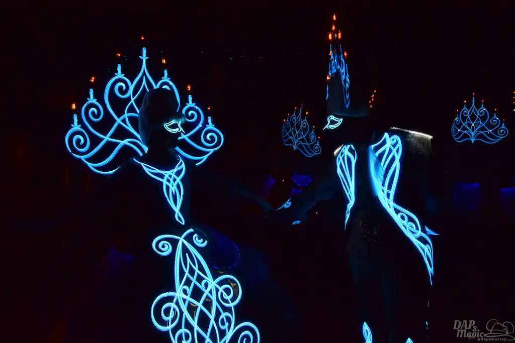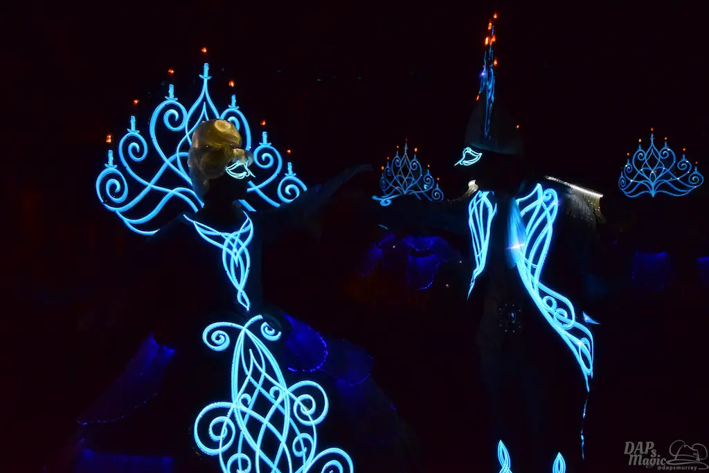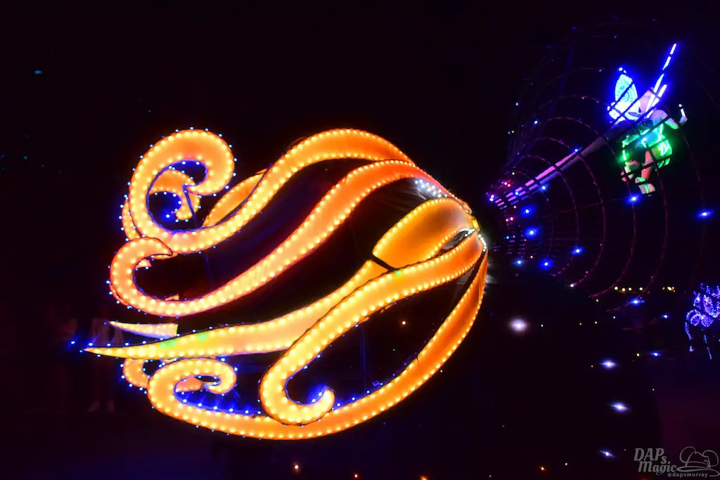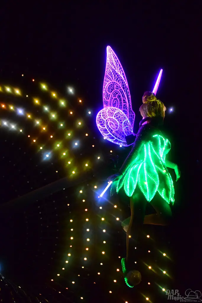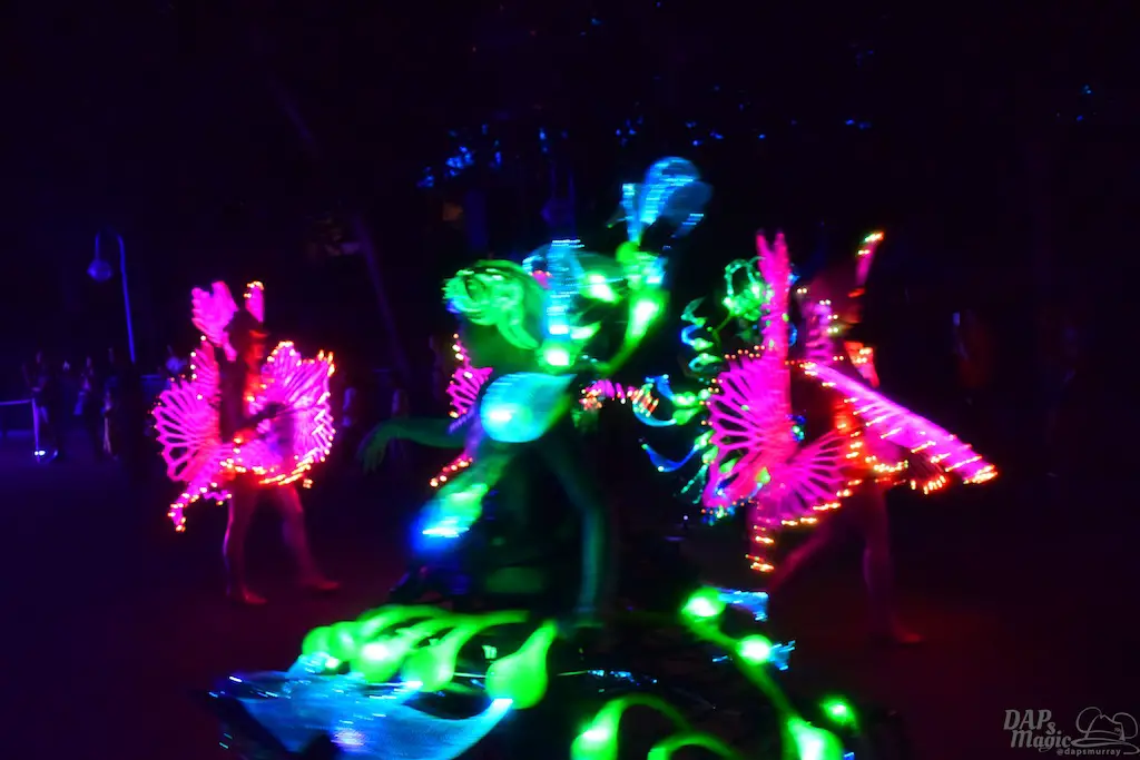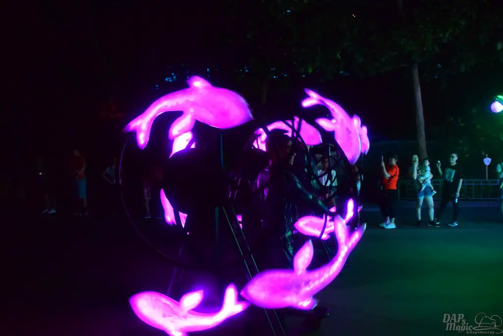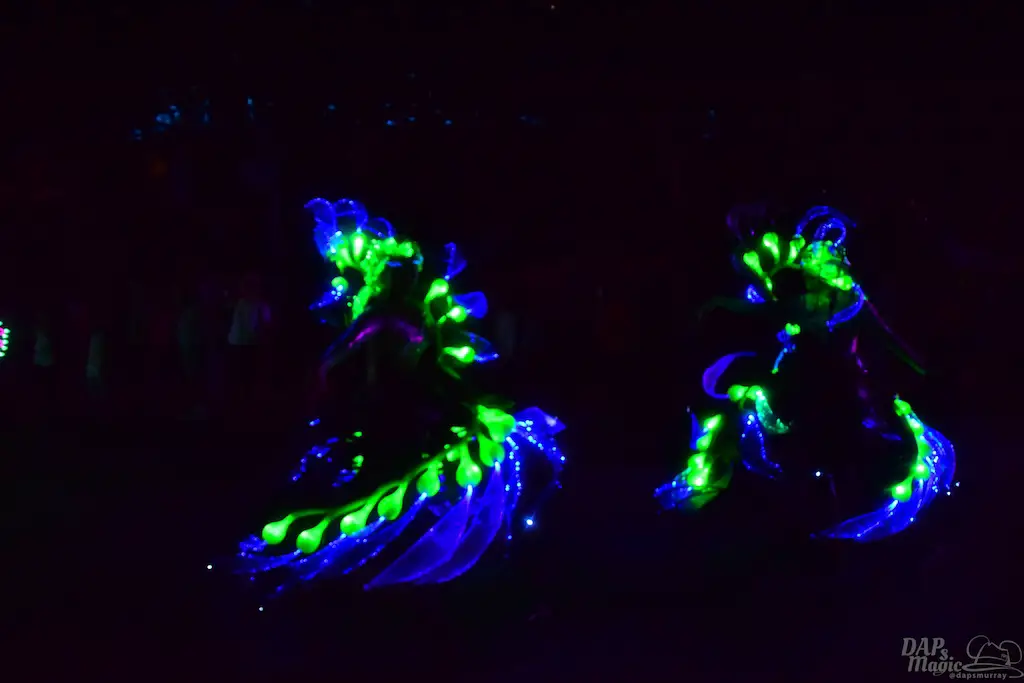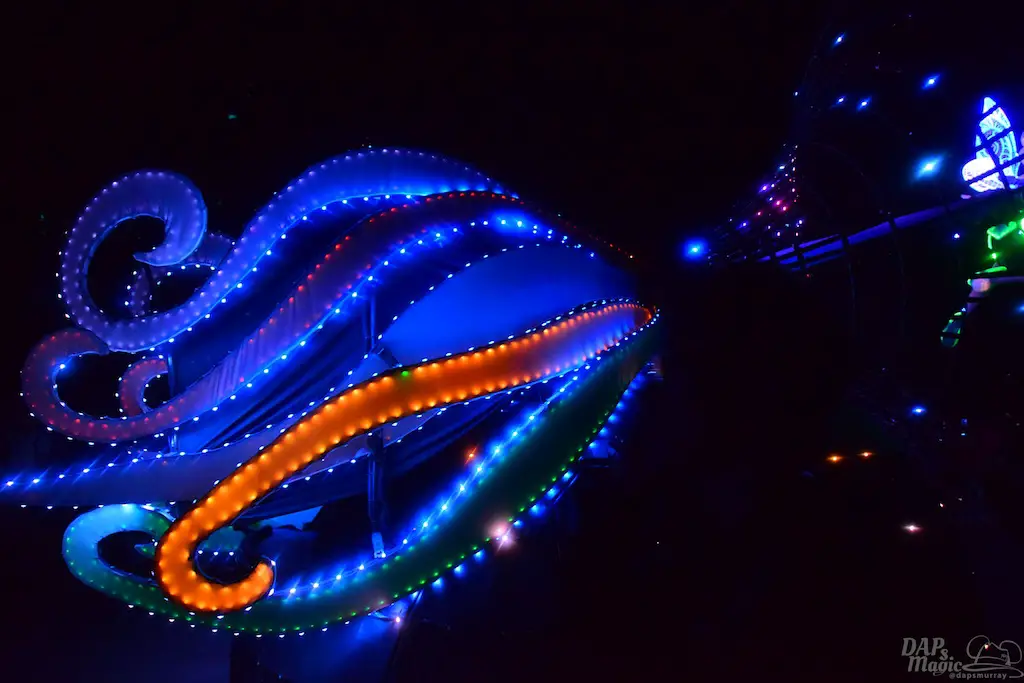 Tinkerbell is a solo float. Peter Pan and the large drum are not attached. Magical strands are attached in the rear of the funnel like float. For the Little Mermaid float, the performers before it have more of a variety to them. The colors are a little different than the one in California, and there’s some kelp dress adorned dancers. Instead of jellyfish and Nemo behind it there are fish that circle around walkers. Subtle color differences make up the ballroom dancers for Belle’s unit. The big difference, though, is that she isn’t dragging along smaller floats with Rapunzel and Cinderella. Candelabras are being dragged instead, and tall roses walk along. For Toy Story, lit up large yo-yos follow Slinky Dog. In the finale there are some different dancers than the pin wheel adorned ones that are in the one here in the States.