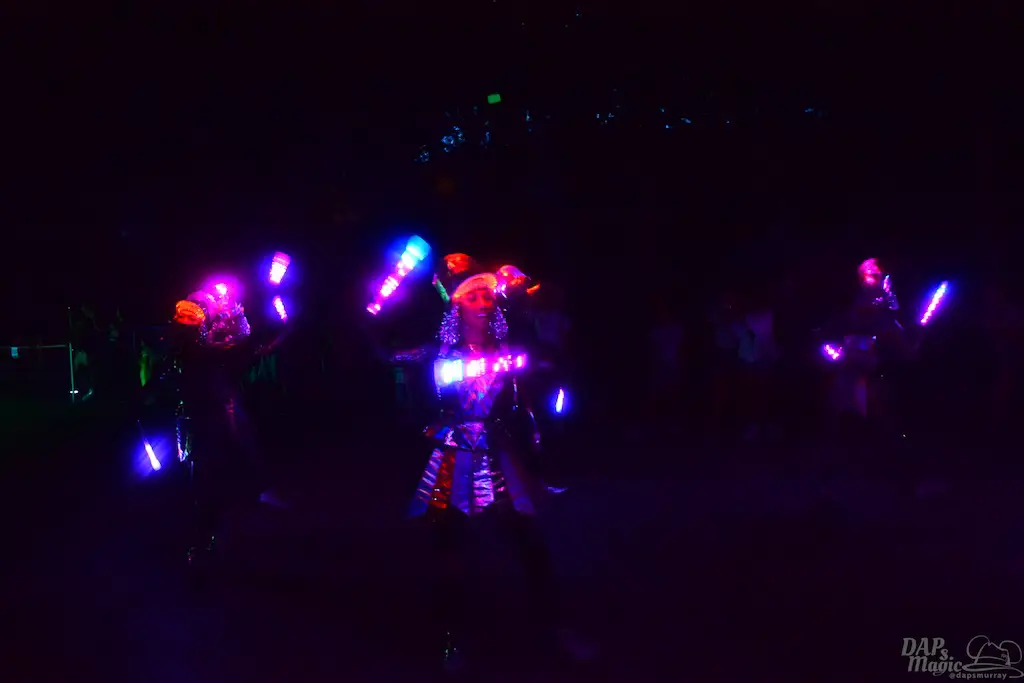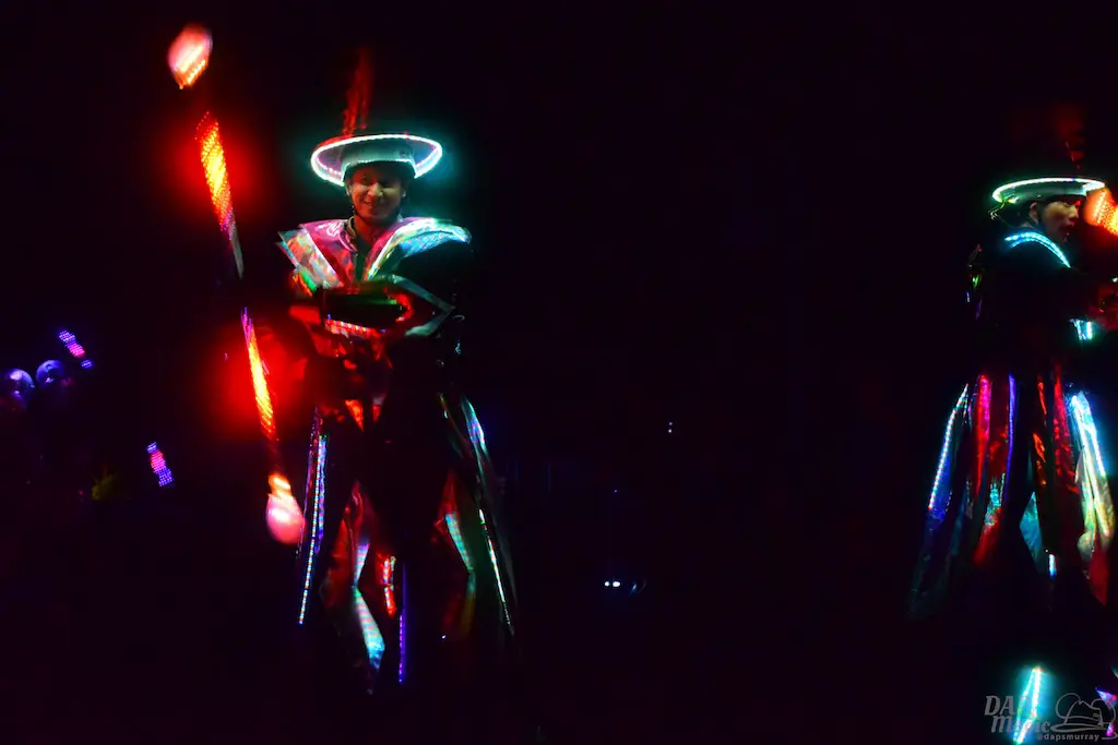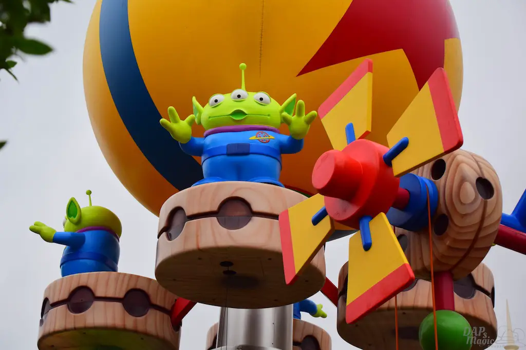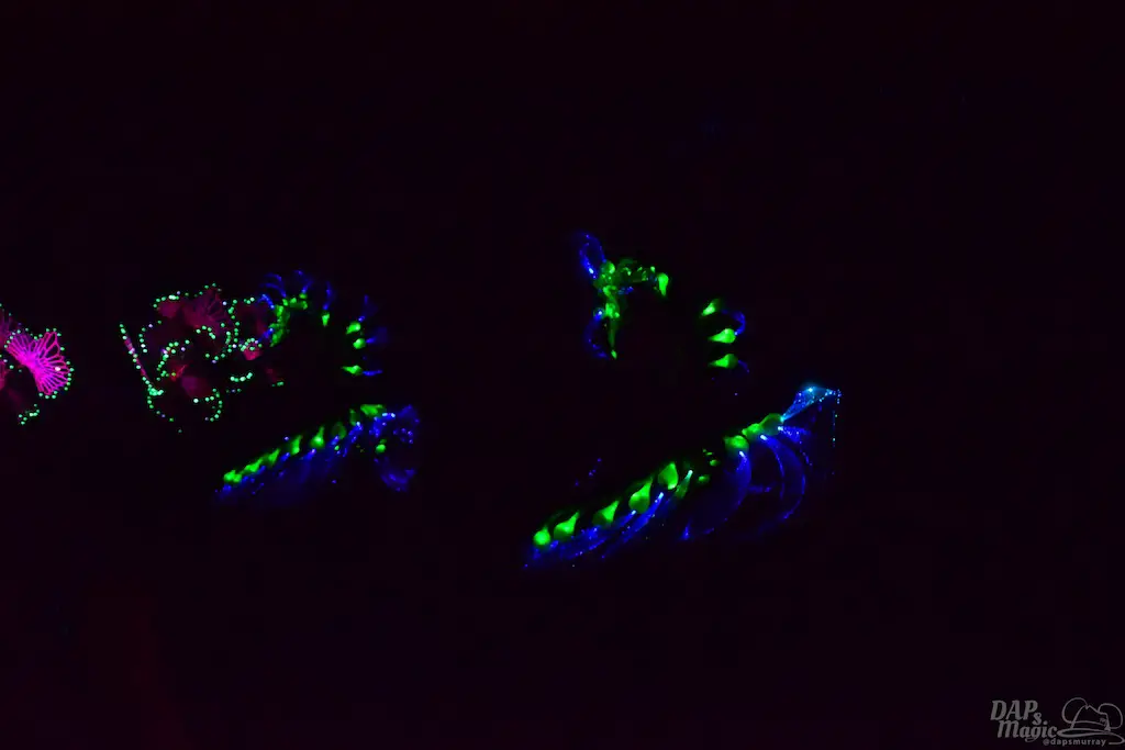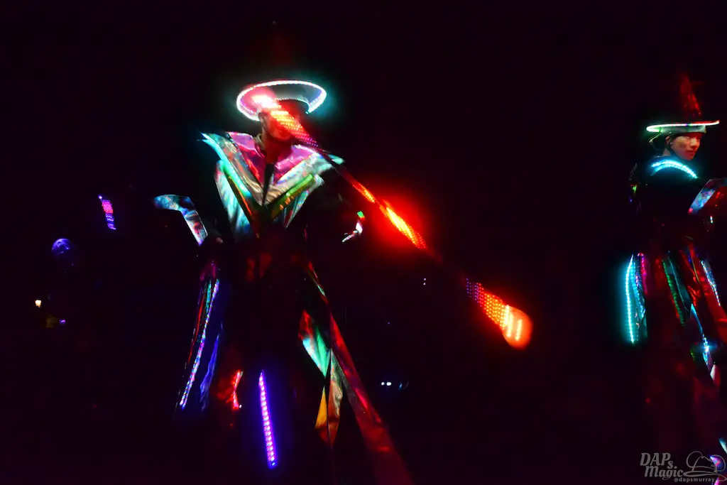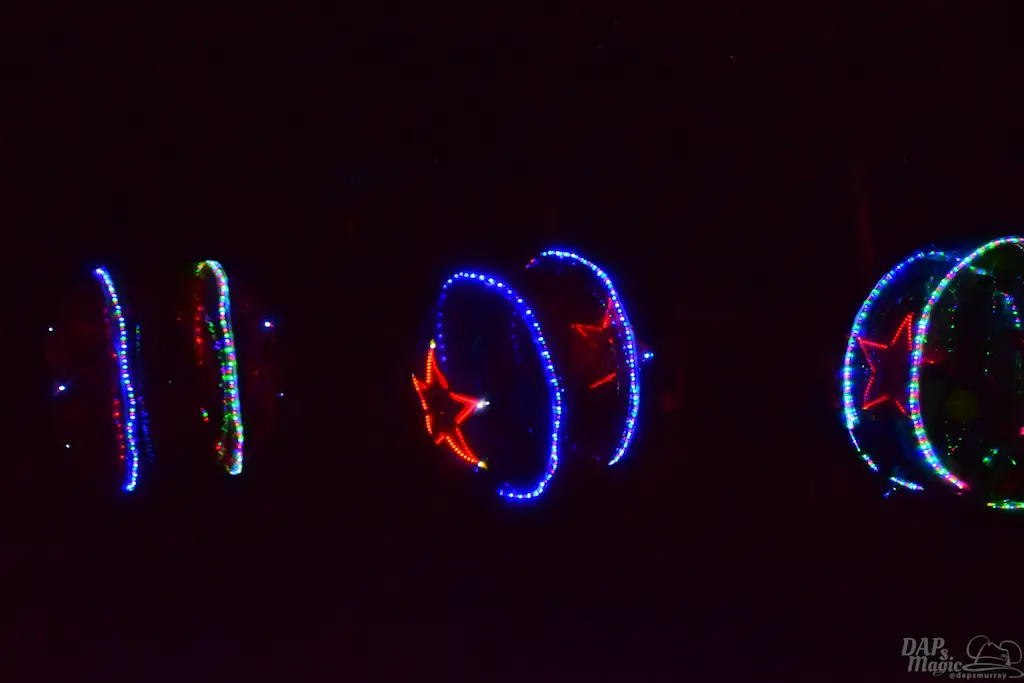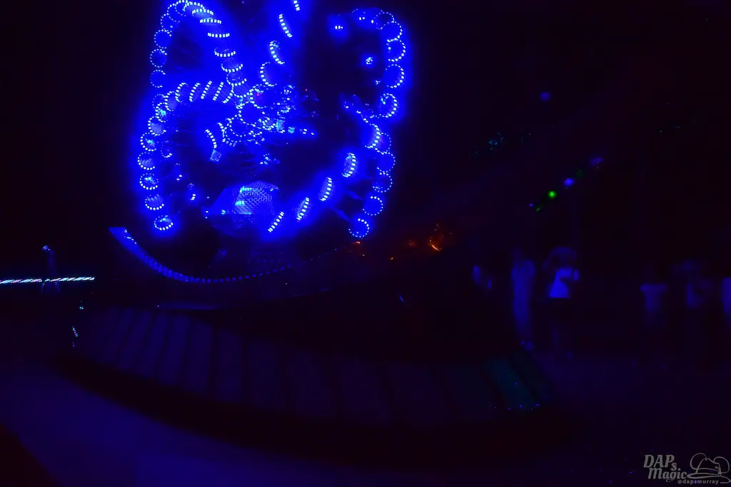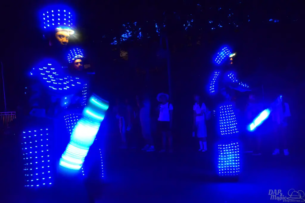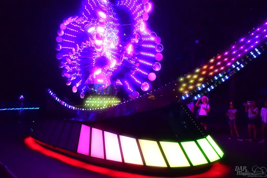 Tinkerbell is a solo float. Peter Pan and the large drum are not attached. Magical strands are attached in the rear of the funnel like float. For the Little Mermaid float, the performers before it have more of a variety to them. The colors are a little different than the one in California, and there’s some kelp dress adorned dancers. Instead of jellyfish and Nemo behind it there are fish that circle around walkers. Subtle color differences make up the ballroom dancers for Belle’s unit. The big difference, though, is that she isn’t dragging along smaller floats with Rapunzel and Cinderella. Candelabras are being dragged instead, and tall roses walk along. For Toy Story, lit up large yo-yos follow Slinky Dog. In the finale there are some different dancers than the pin wheel adorned ones that are in the one here in the States.